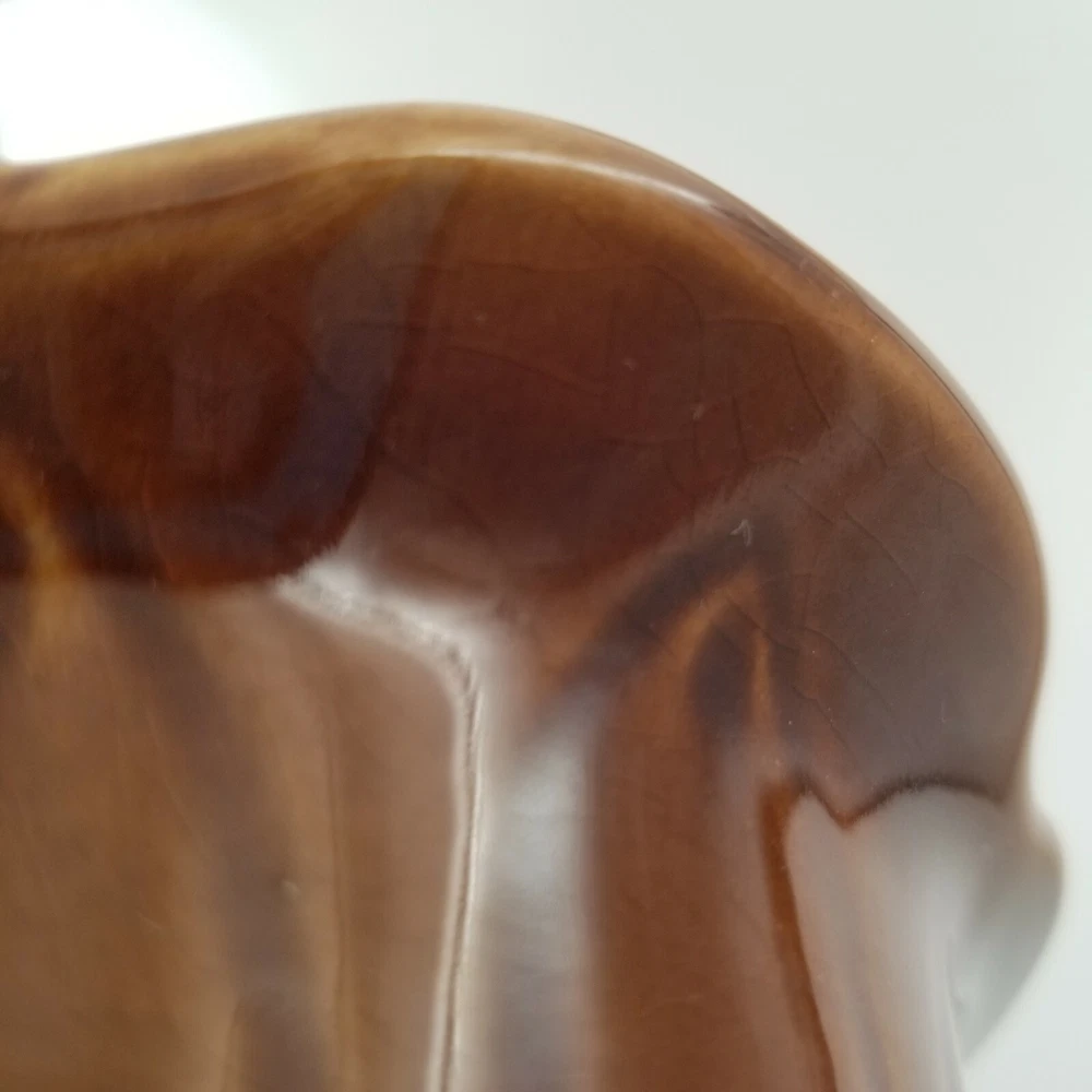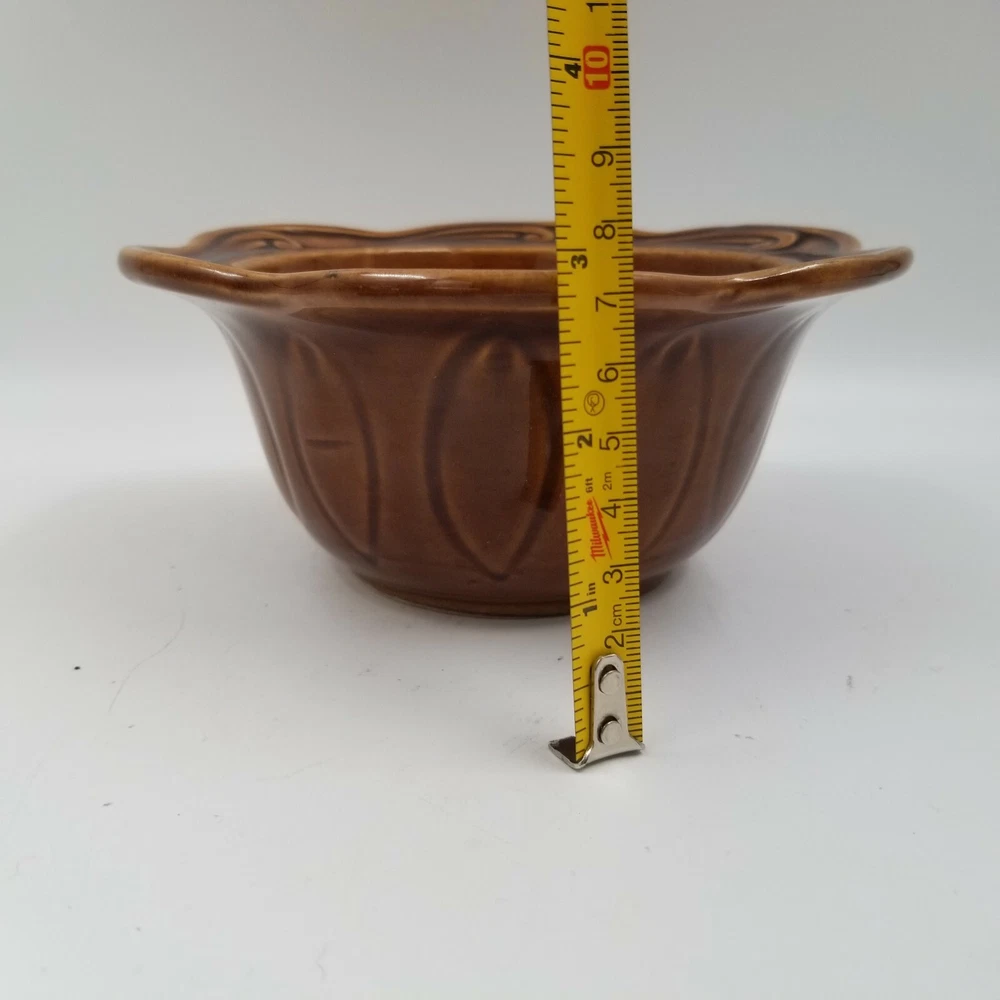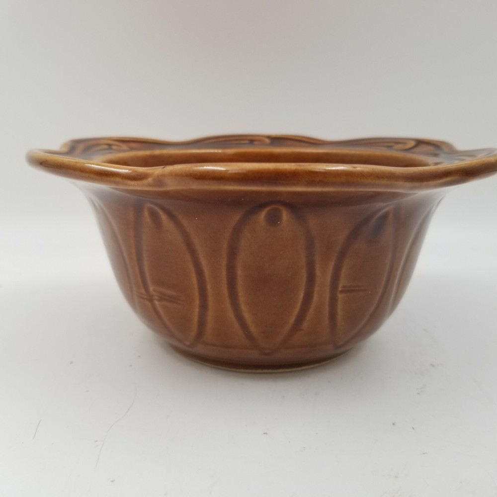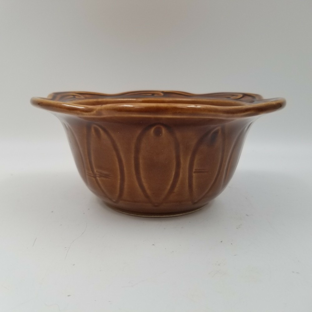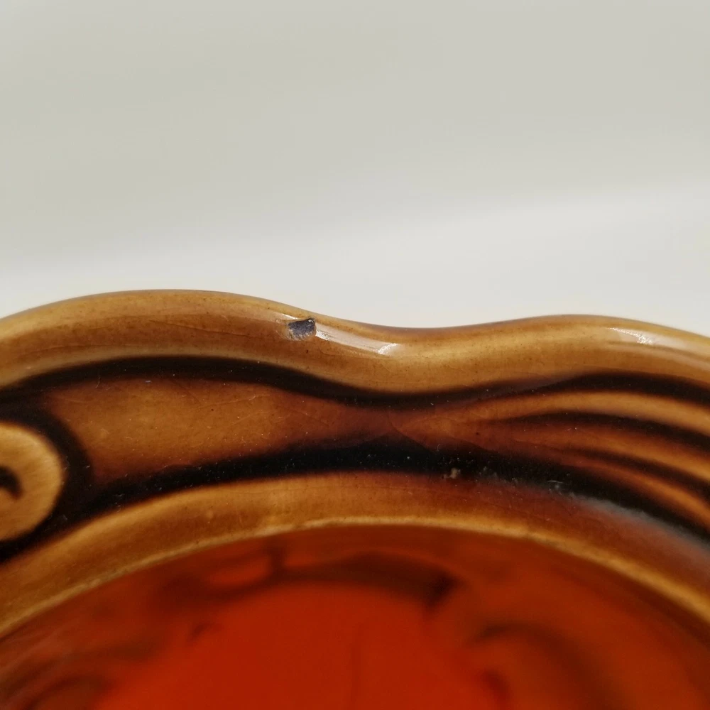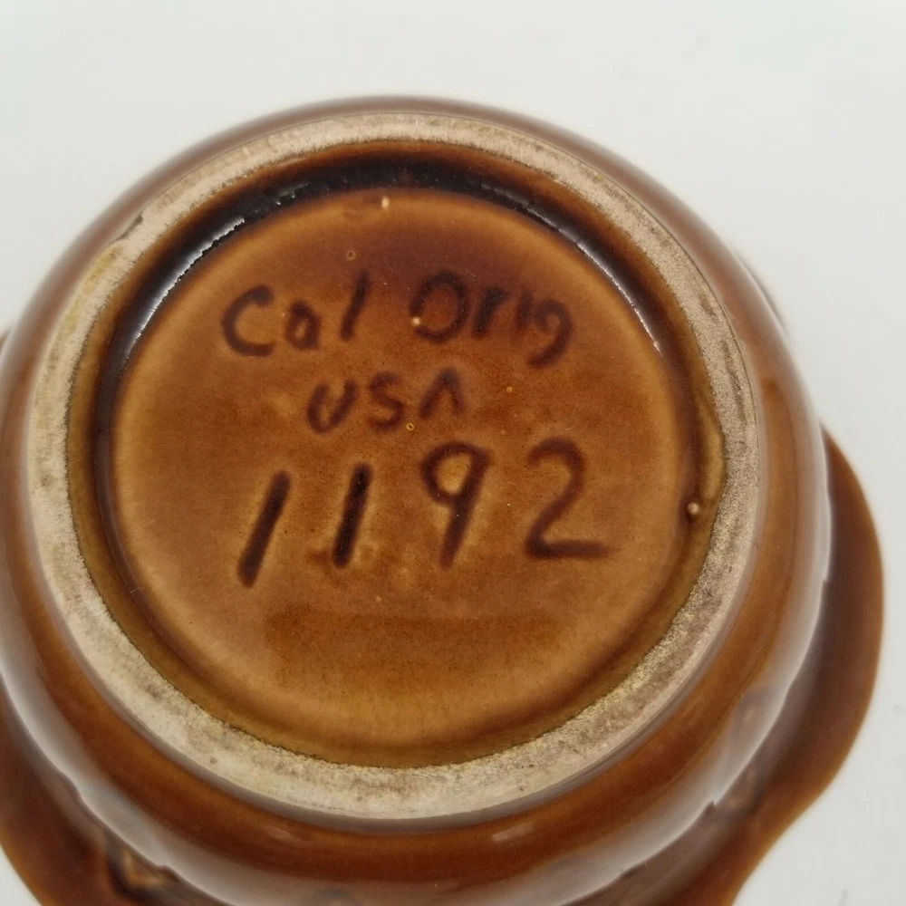Vintage Brown Orange Drip Lava Glaze Cal Orig USA 1192 Bowl California Pottery. Vintage California Pottery Bowl Nice fall colors with a bright orange glazed inside good for fall, Thanksgiving, and Halloween decor. Approximately 3" tall x 6.5" wide Orange glaze inside, scalloped edge, and brown glaze outside. Small chip in glaze and crazing shown in pictures.