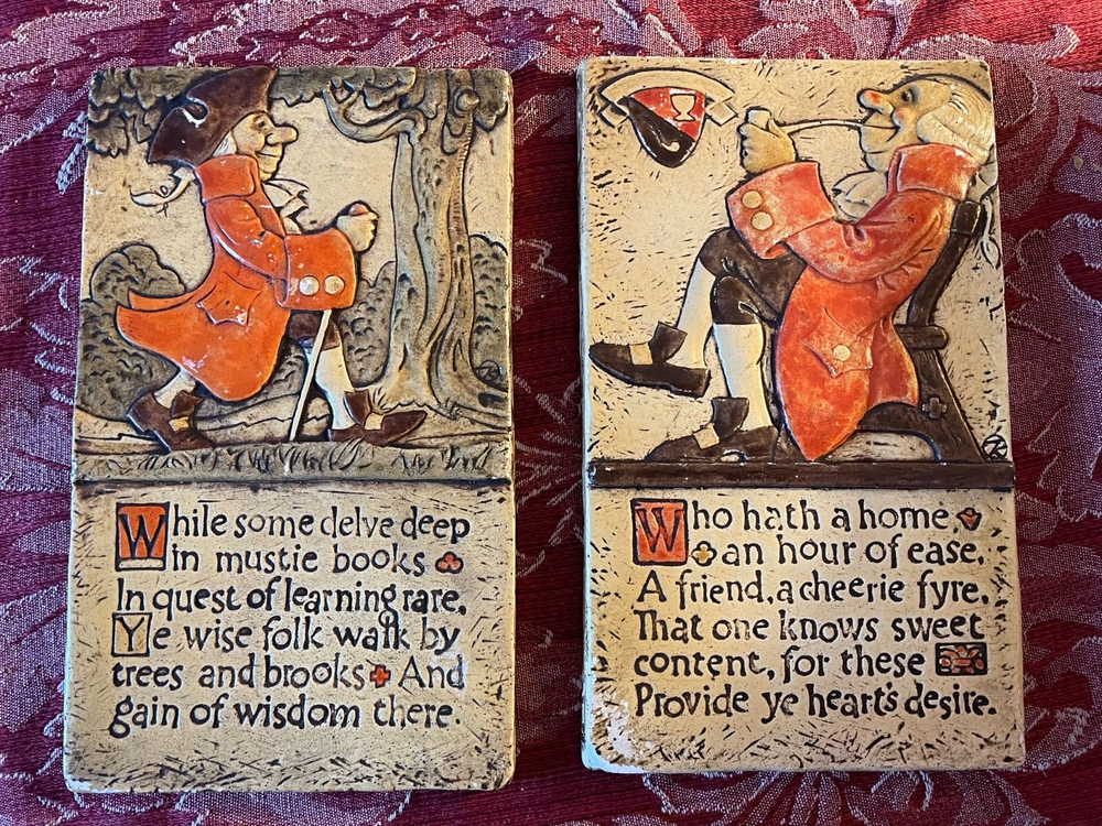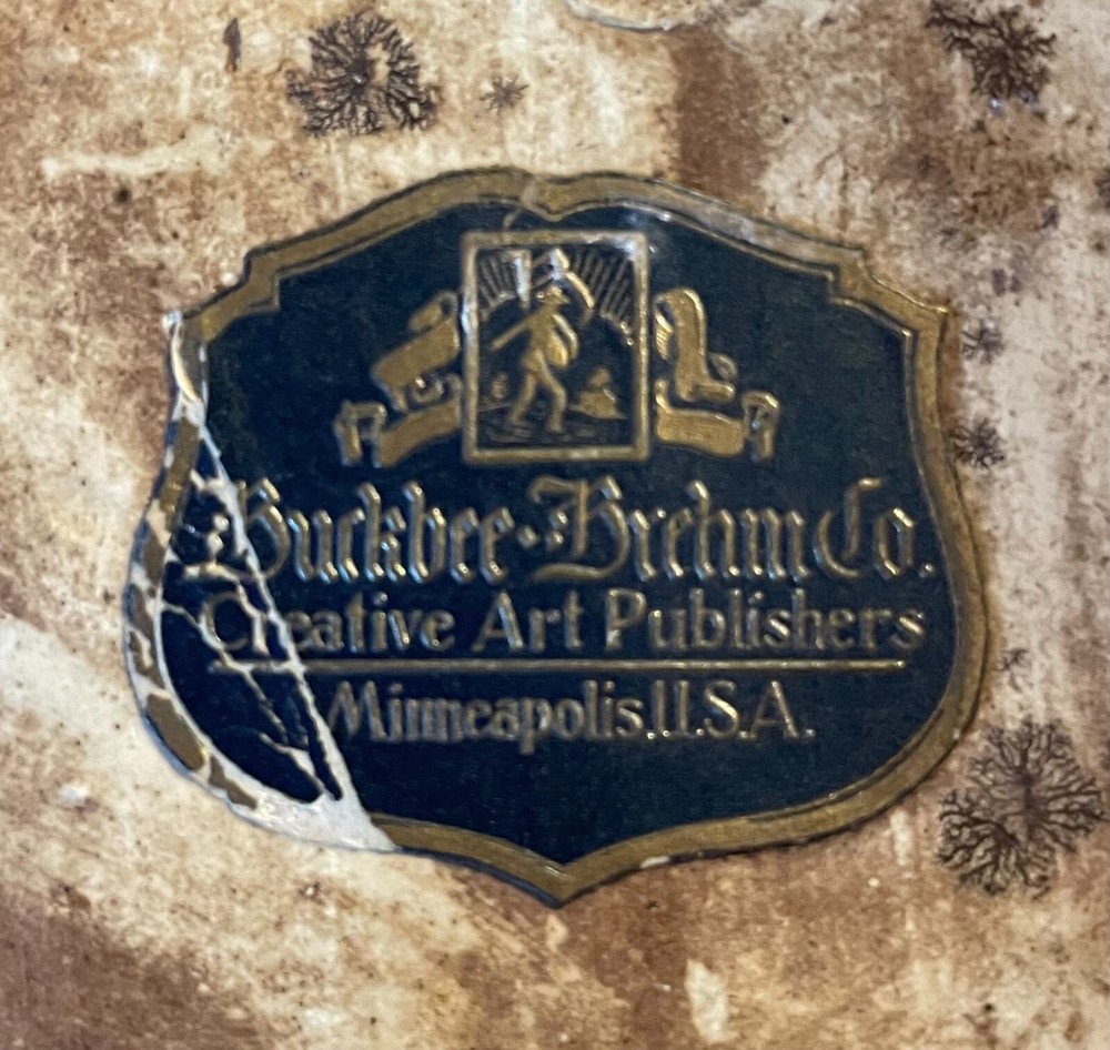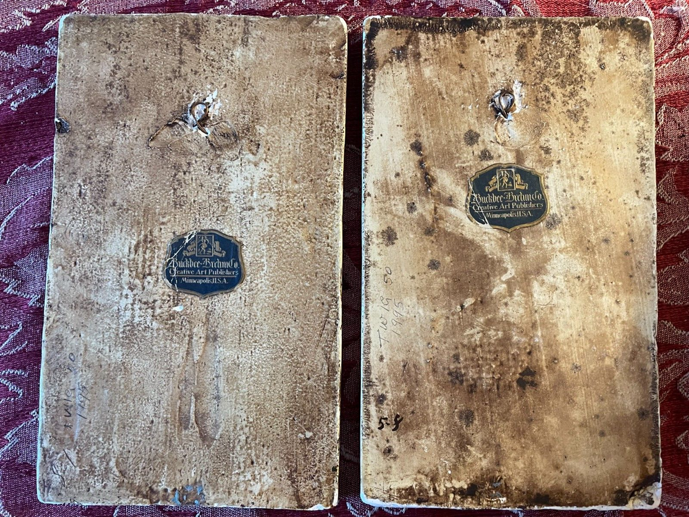 A ceramic Buckbee- Brehm Co. tile or motto plaque by Creative Arts Publishers. Buckbee- Brehm Co. operated out of Minneapolis, Minnesota. They were known for their motto prints and silhouette-style wall decor. The wall plaque or tile was hand-colored. The original sticker is on the back of the plaque as well as a wire hook for hanging the piece. There are some spots of paint loss. These spots are small and likely easily touched up. Measures: 4 1/2" x 7 1/2" x 3/8" Sold as set.