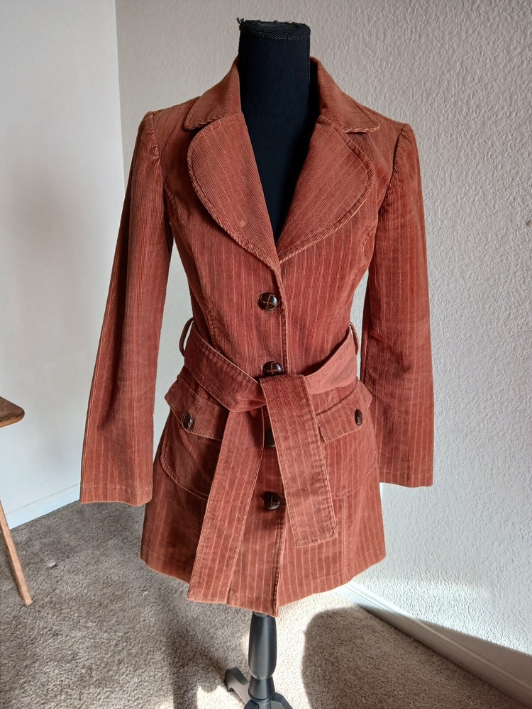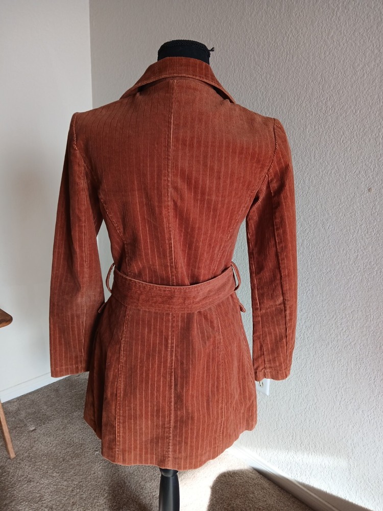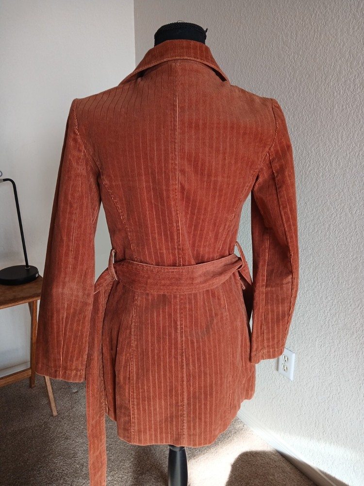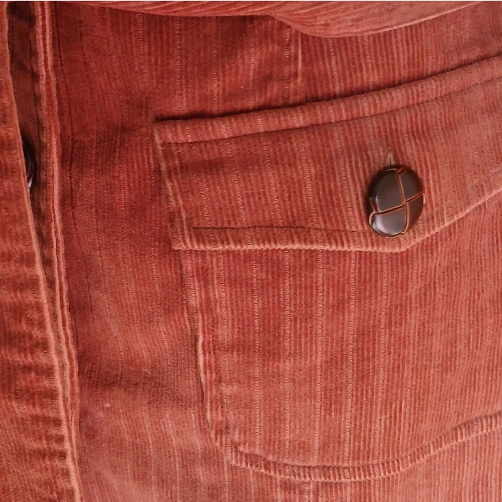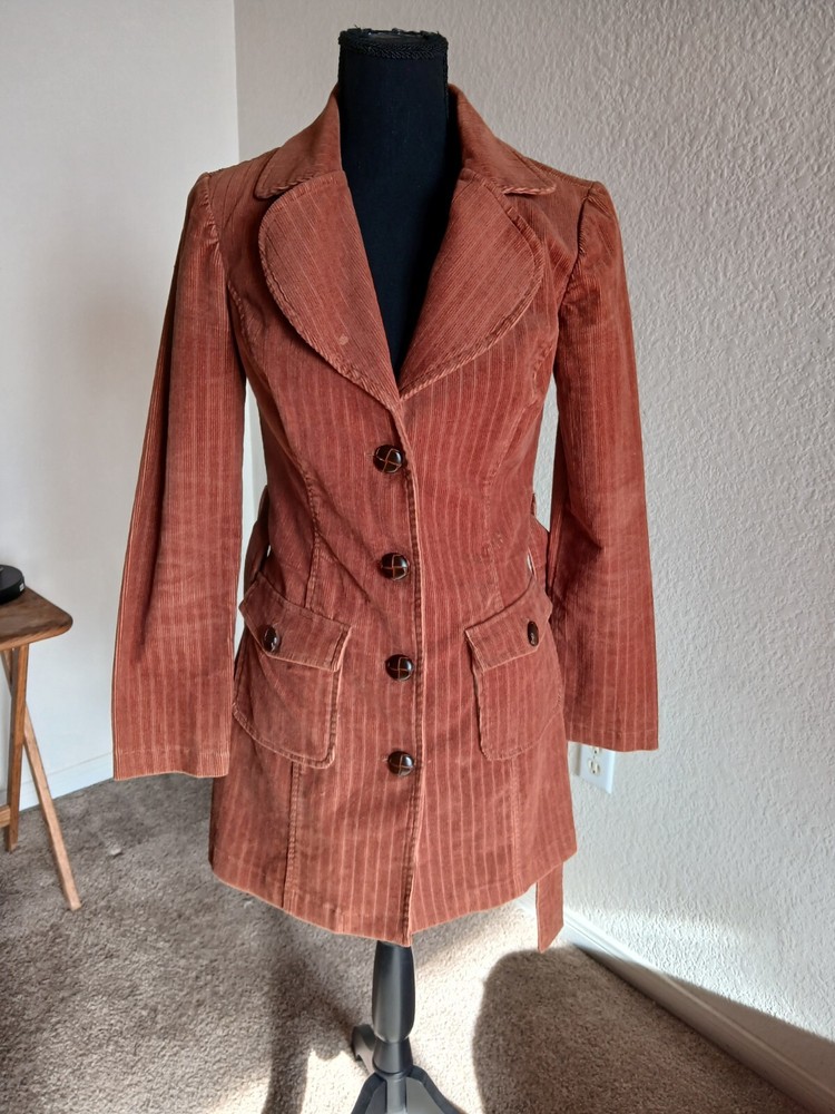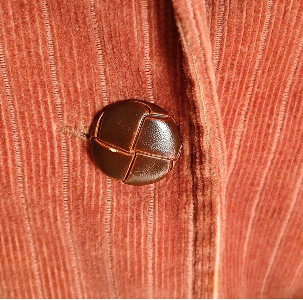 Unique figure flattering corduroy jacket, a slight puff shoulder with little shoulder pads. Faux leather knot style buttons. Measurements: sleeves length- 23 inches length of jacket - 32 inches pit to pit - 17 inches NOTE: lil spot on the lapel