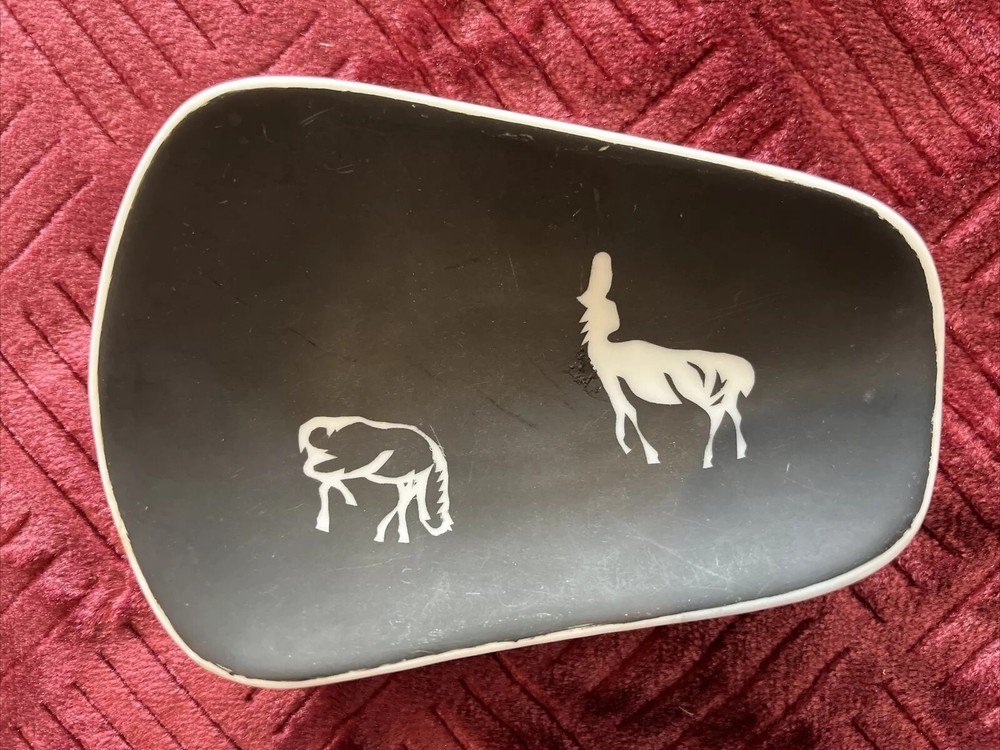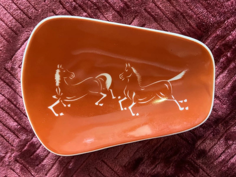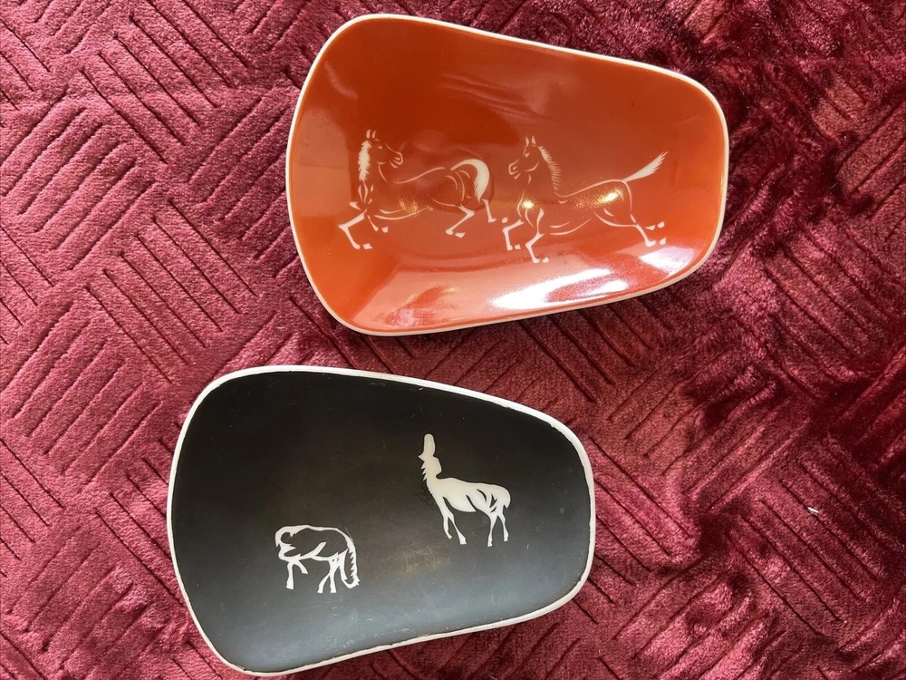 Add a touch of vintage charm to your collection with these burnt orange and black dishes featuring silhouetted horses. From the 1960s, these plates are perfect for collectors of retro mid-century decor. The plates are in great shape and ready to be displayed in your home. The intricate design and attention to detail make these plates a must-have for any collector. Whether you're a fan of horses or just love vintage decor, these plates are sure to impress.
