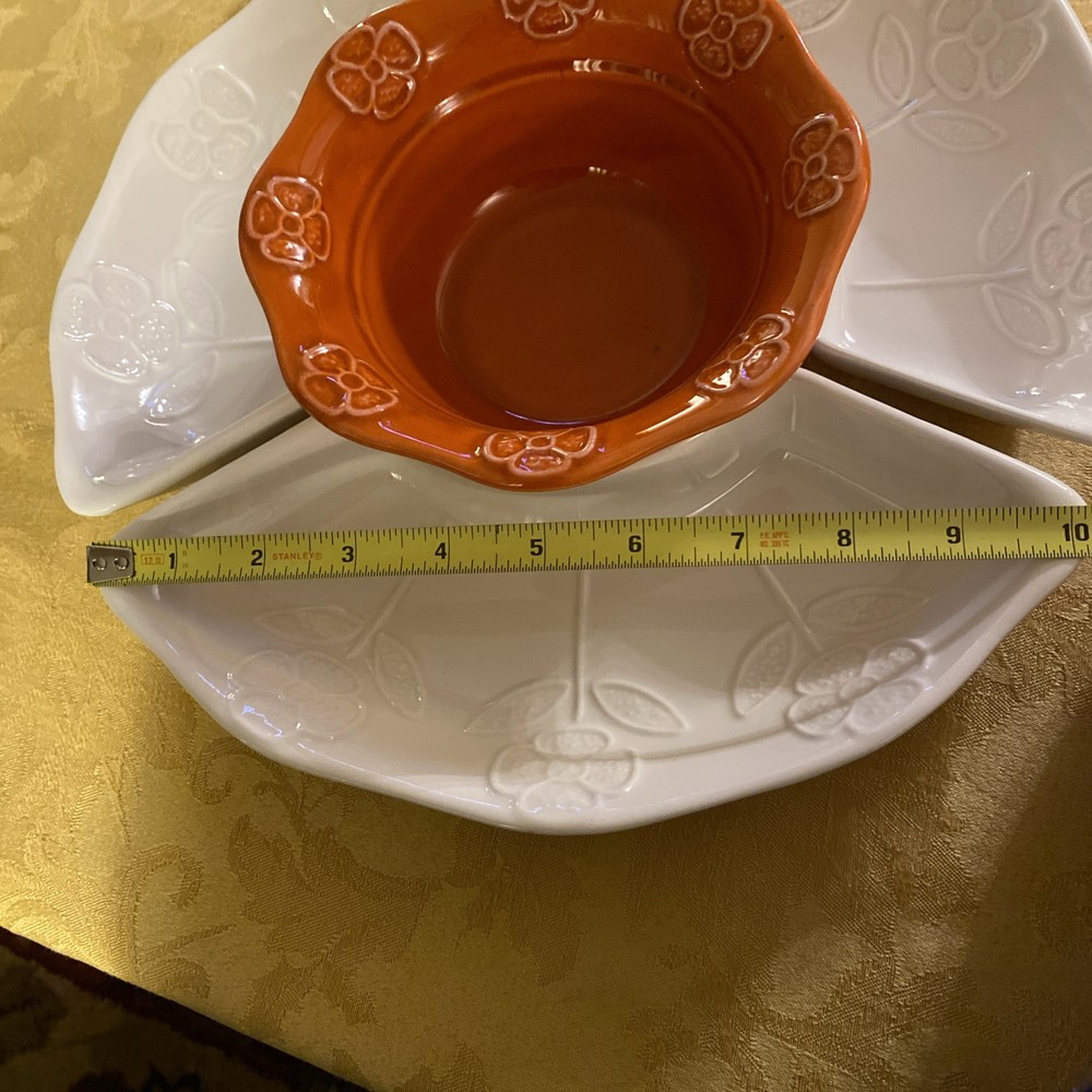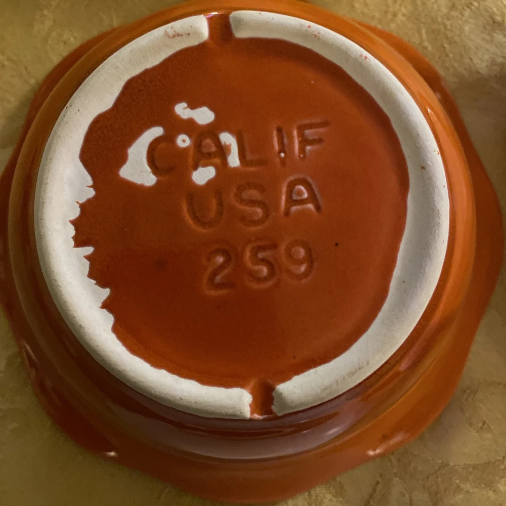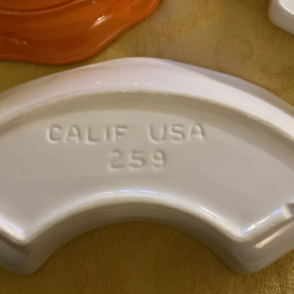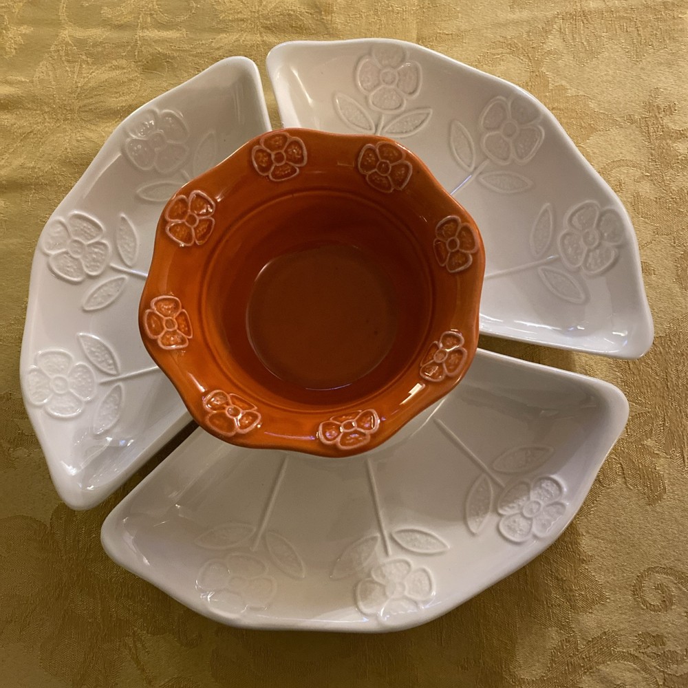 Bright and beautiful four piece snack set. Includes orange center bowl and three white/ivory relish or Chip/vegetable dishes. These vintage items are in very good condition. California pottery number 259 marked on the back. Please see photos and ask any questions prior to purchase.