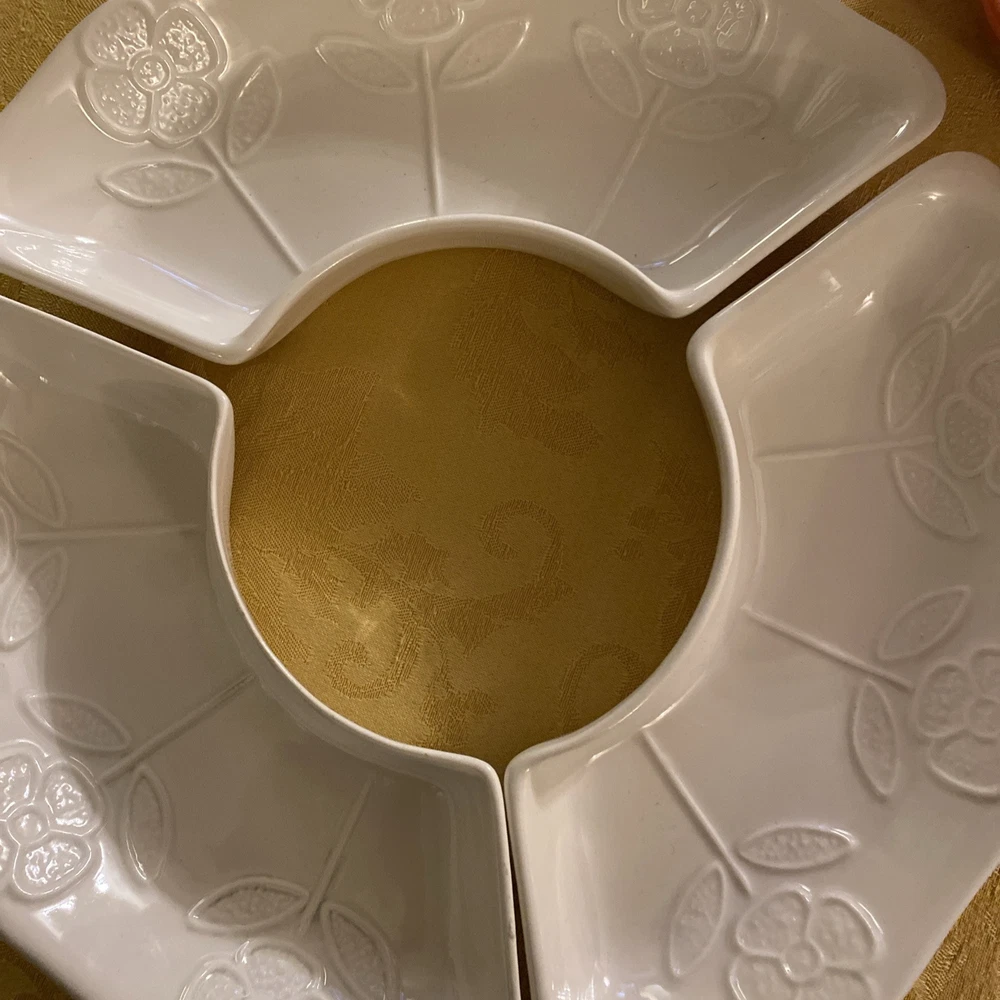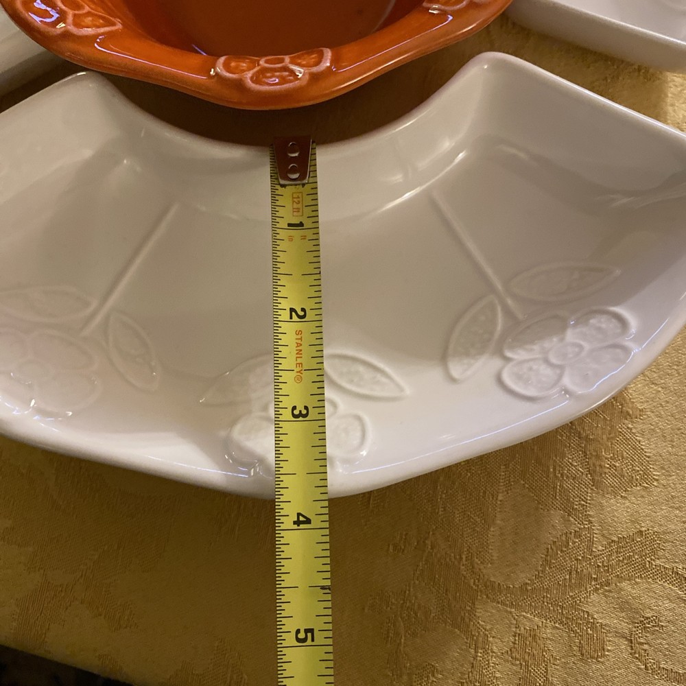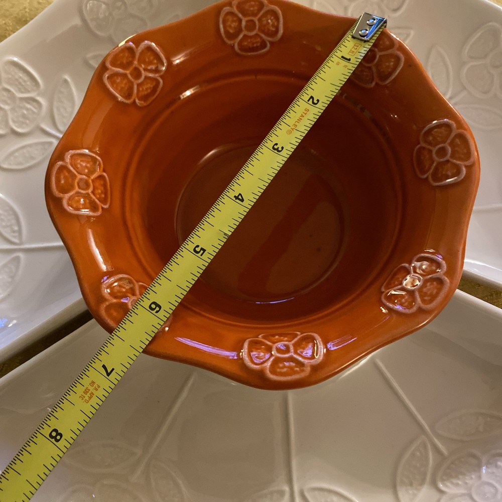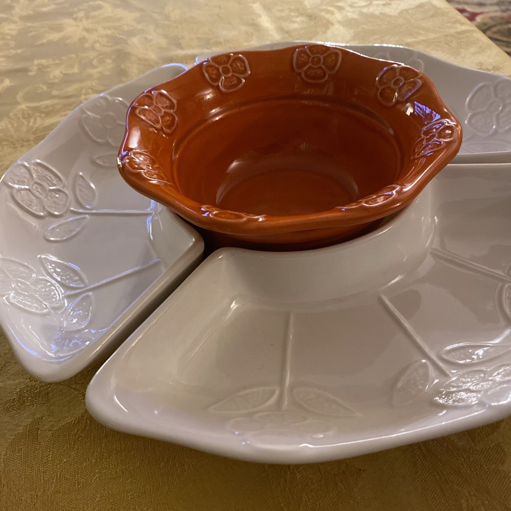 Bright and beautiful four piece snack set. Includes orange center bowl and three white/ivory relish or Chip/vegetable dishes. These vintage items are in very good condition. California pottery number 259 marked on the back. Please see photos and ask any questions prior to purchase.