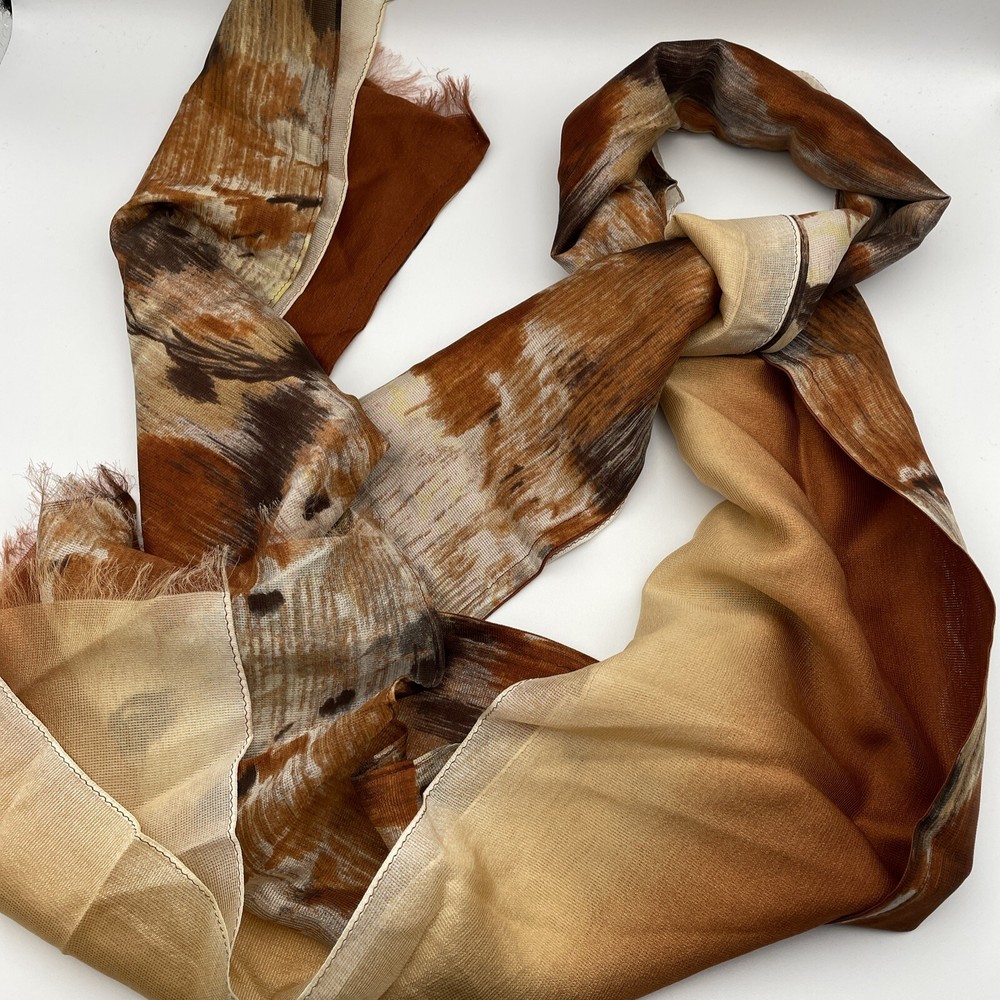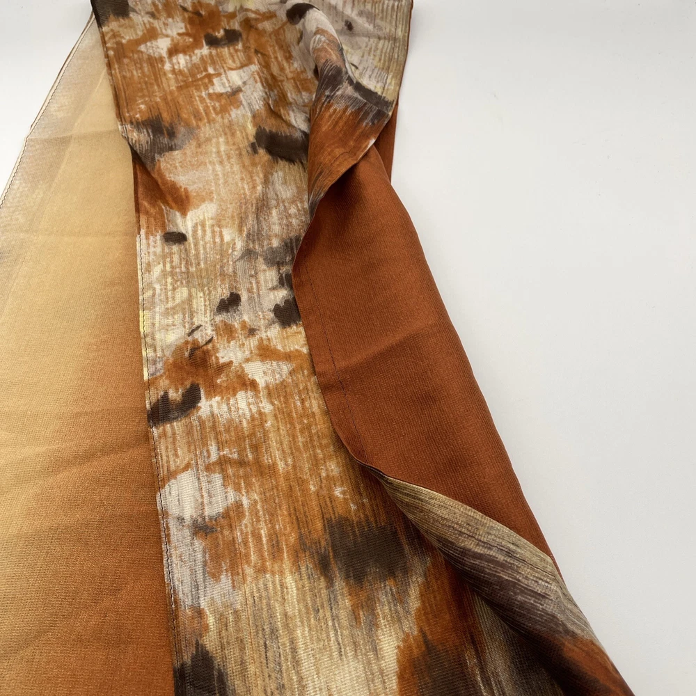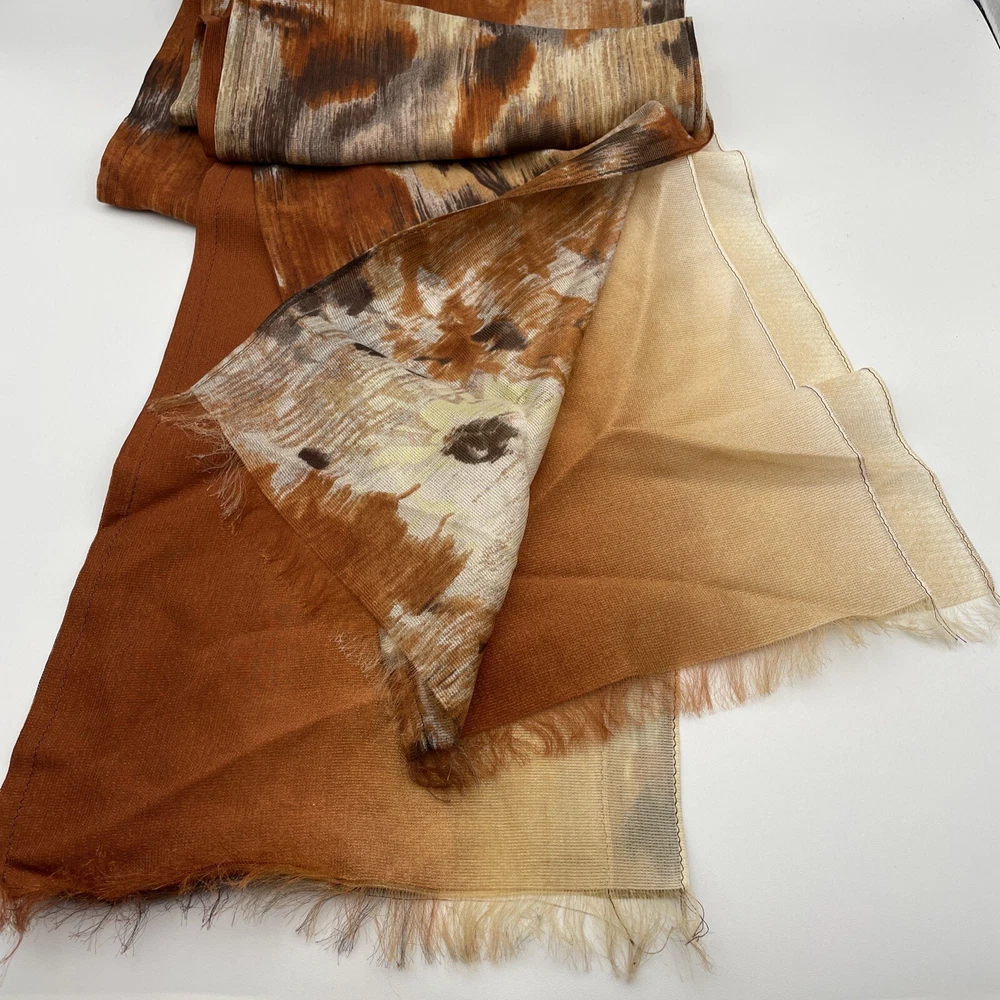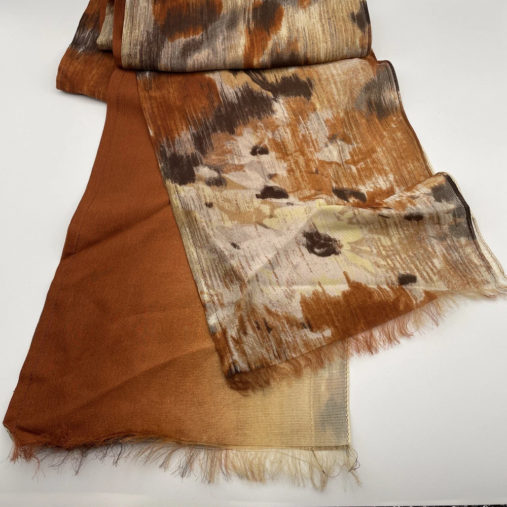 Thin delicate material that lays and flows very nicely. Very unique design with the three layers of scarf all sewn together. One layer is a mottled mix of oranges creams and browns. The other two layers are a burnt orange to cream ombré.