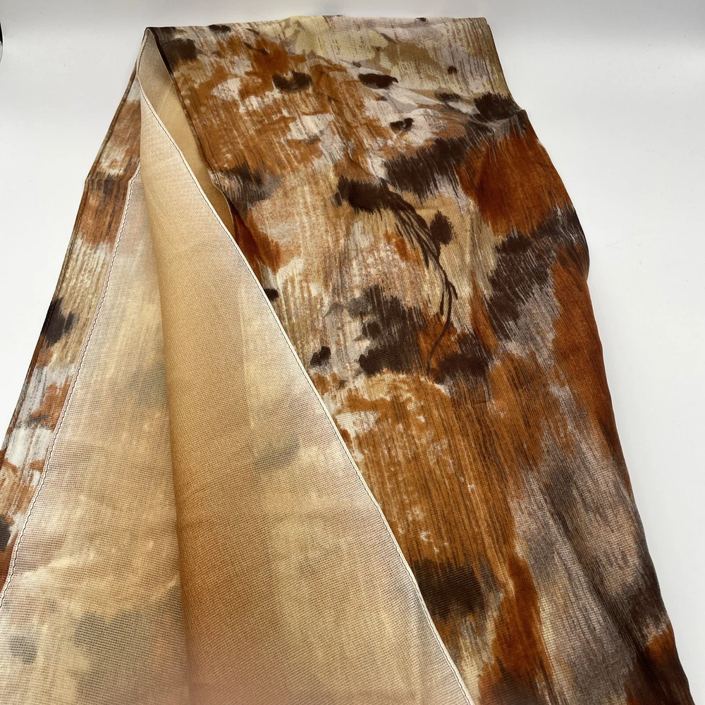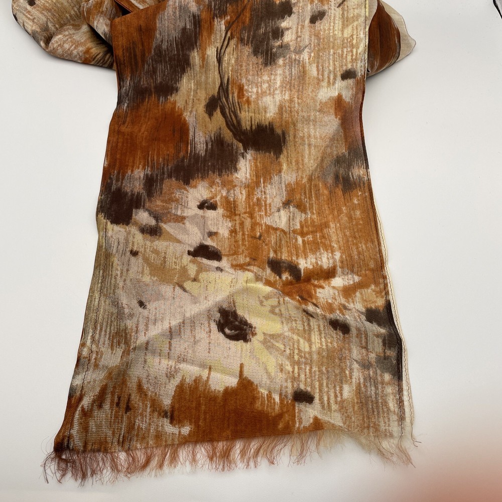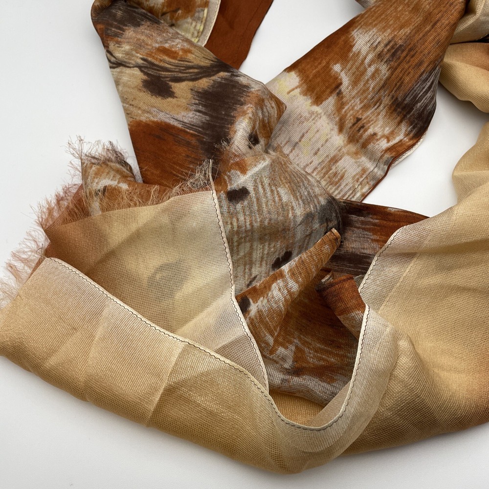 Thin delicate material that lays and flows very nicely. Very unique design with the three layers of scarf all sewn together. One layer is a mottled mix of oranges creams and browns. The other two laye...