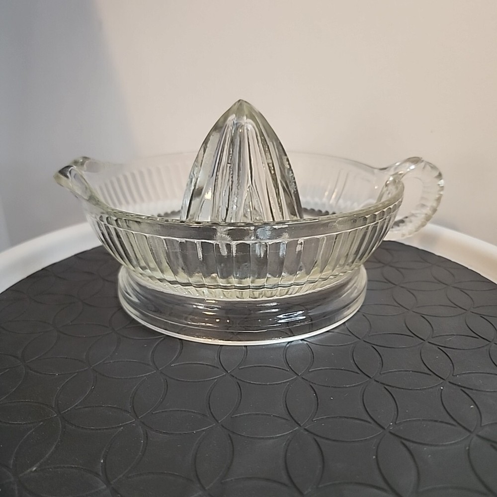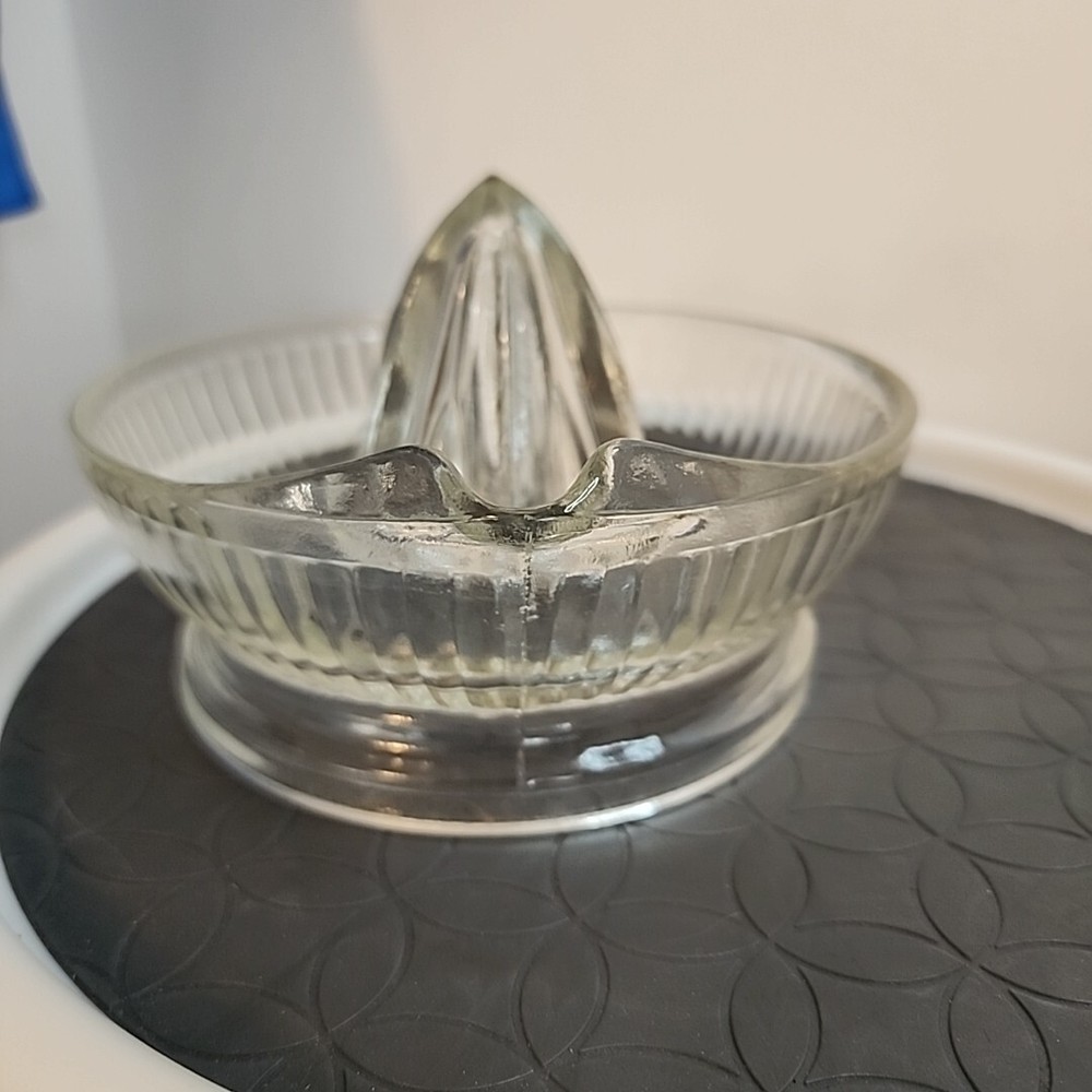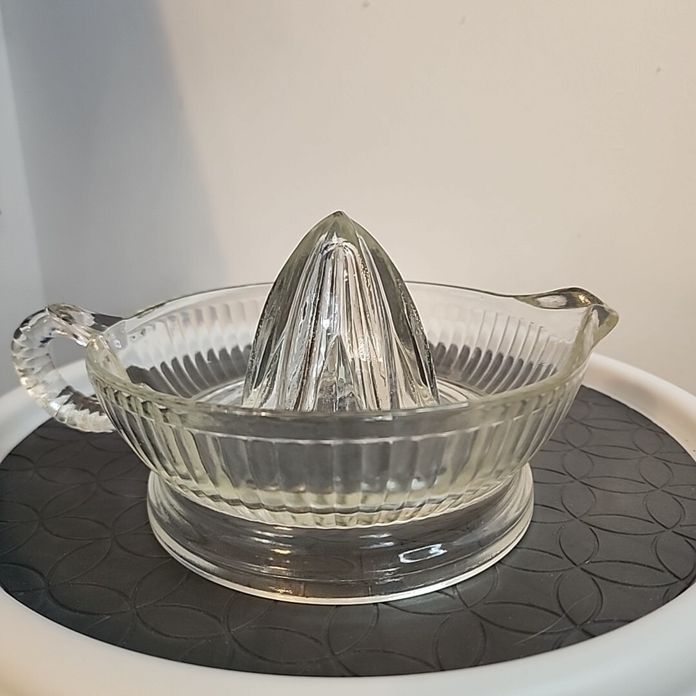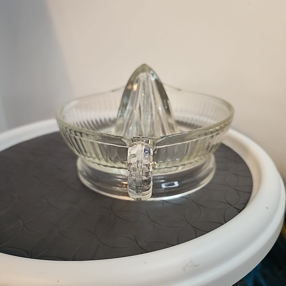 Pressed glass has no chips breaks or repairs. This vintage citrus reamer is a must-have for any kitchen. With its clear glass design and retro style, it adds a touch of charm to any table setting. Measuring 8 inches in diameter, it is perfect for juicing oranges, lemons, and other citrus fruits. Crafted from pressed glass and fused glass, this reamer is both dishwasher and machine washable up to 140°F. Its round shape and single item in the set make it easy to use and store. The item width is 6 inches, including the handle. Backstamp is none, and it was produced in the mid-20th century (1960-1969).