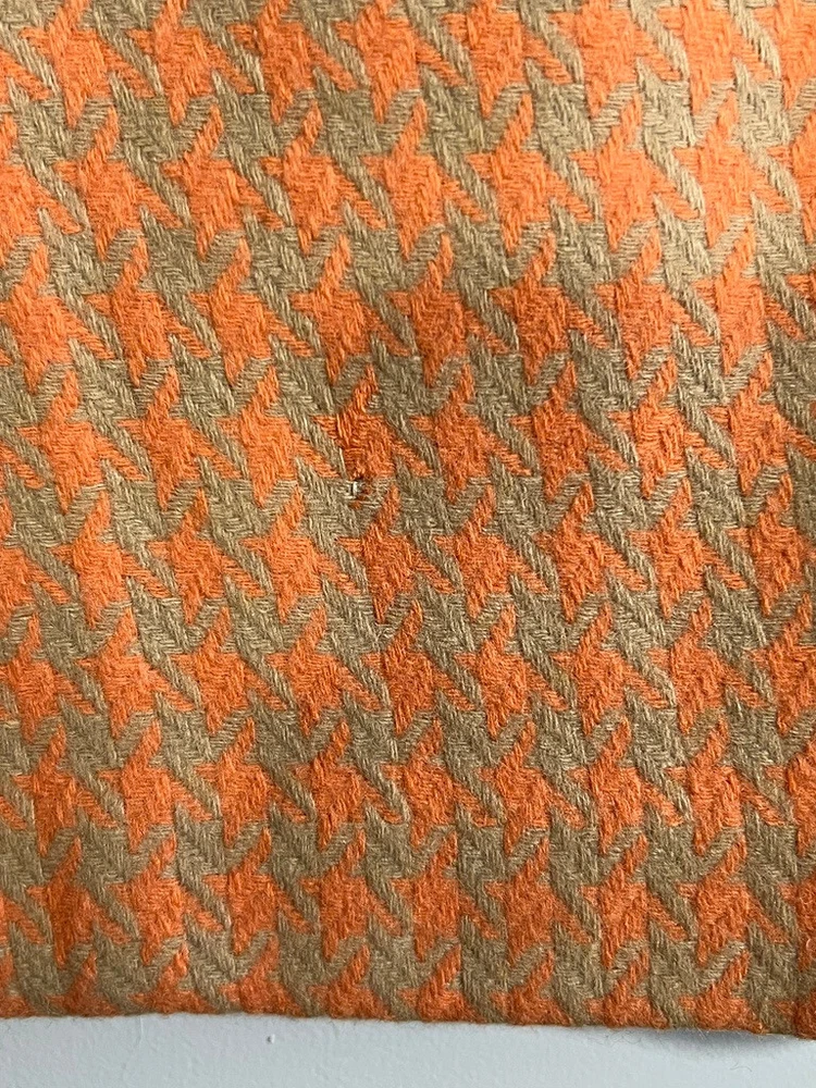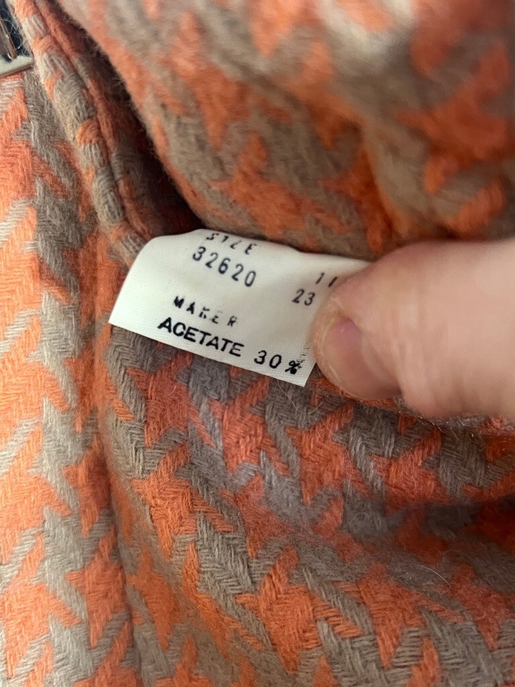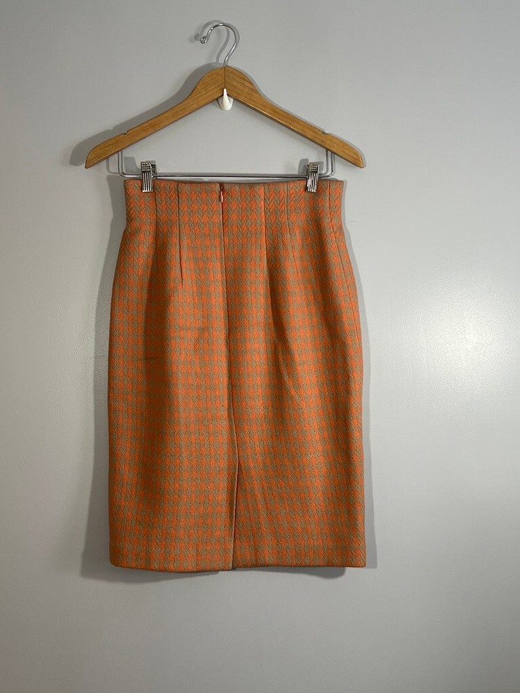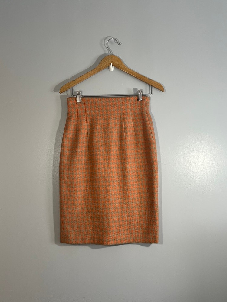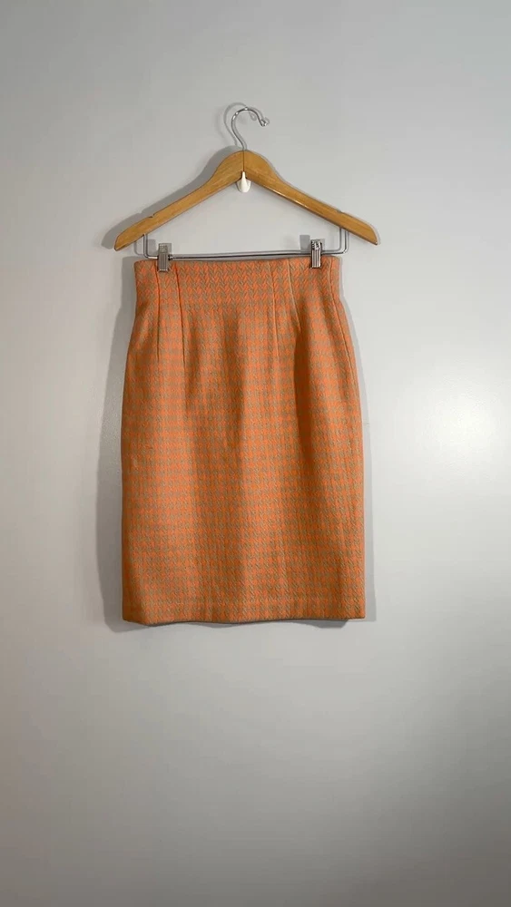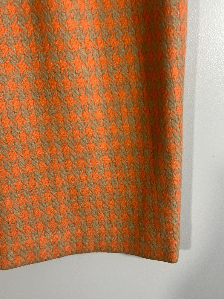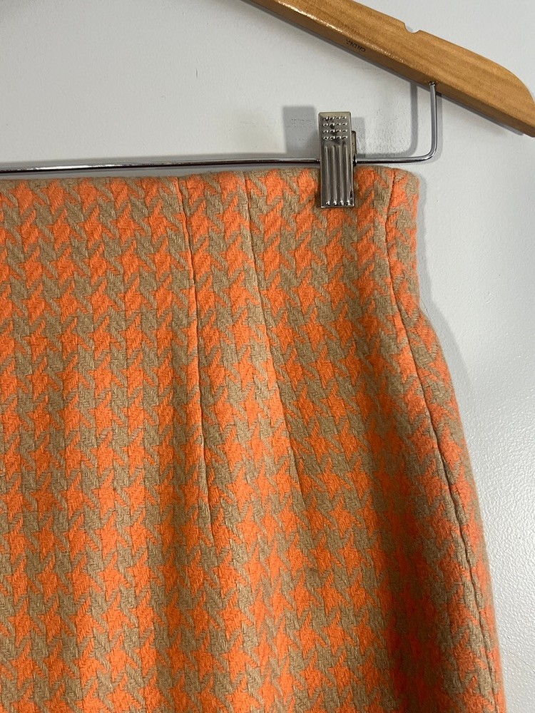 Lovely vintage skirt from Clermont circa 1970s or so based on the fabric tag. In a heavier weight wool blend with a houndstooth pattern of orange and tan. Features a higher waist and fitted shape with a rear vent. Rear zipper and hidden tab closure. Fully lined. Has a small repair as shown in the last photo on the back. But otherwise in great vintage condition! Size: 11 (but go by measurements because this is a small skirt!) Measurements: waist 28", hips 32", length 24" Materials: 70% wool, 30% acetate Brand/Maker: Clermont