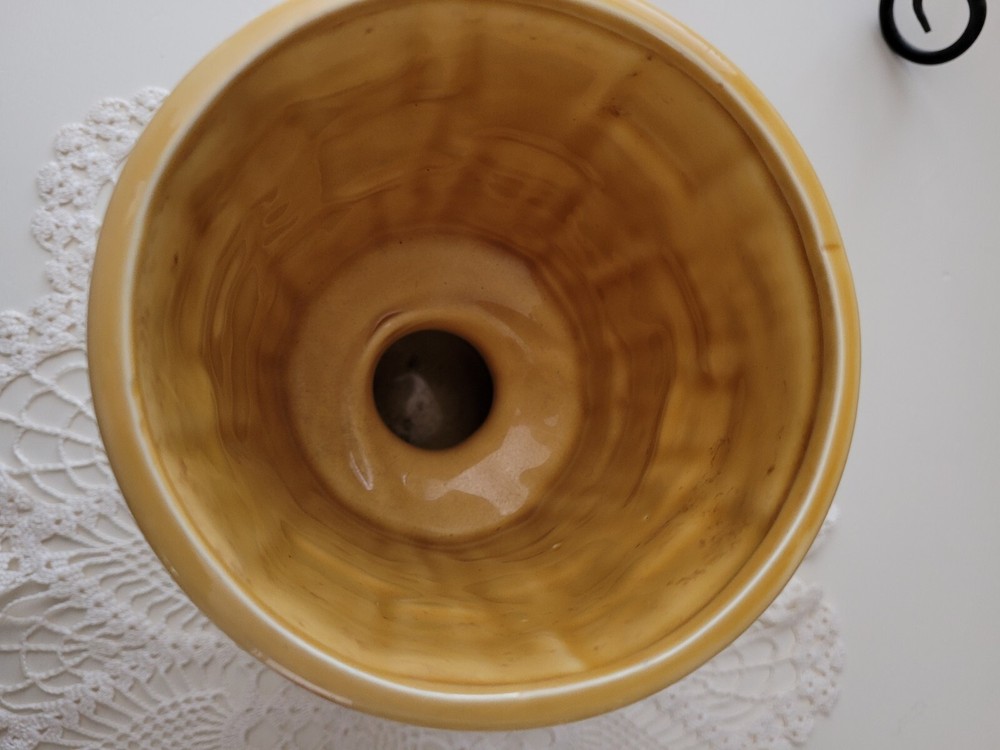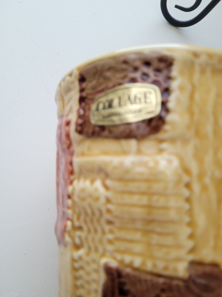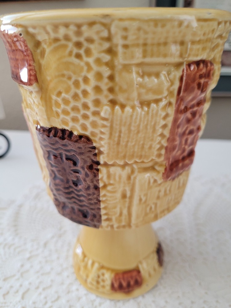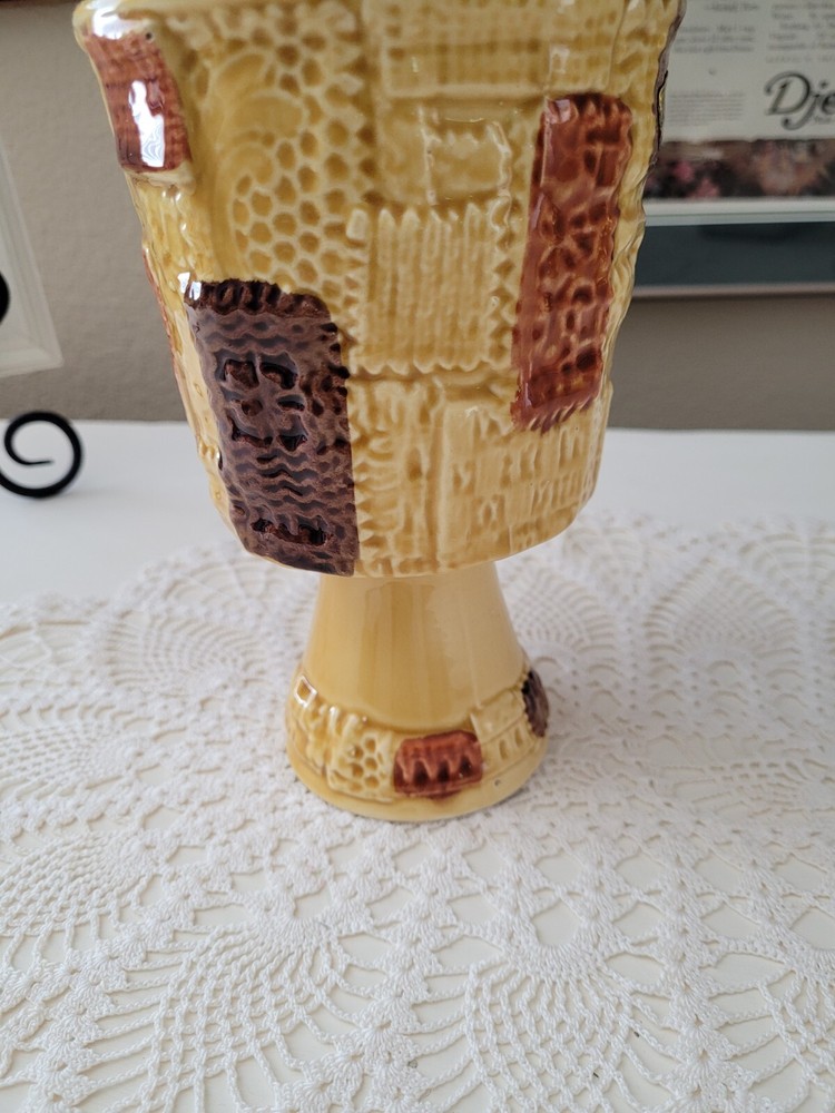 This vintage Napcoware C-8074 vase from Japan is a unique piece of art that will complement any bohemian-themed decor. The vase features a beautiful patchwork design in yellow, brown, and orange colors, with an abstract shape that adds an elegant touch to any room. Crafted in the mid-20th century, this original vase stands at 7.1/4" tall and weighs 12oz. It has a glossy finish and is made of ceramic material. The vase is a vintage collectable and is perfect for displaying flowers or as a decorative item.