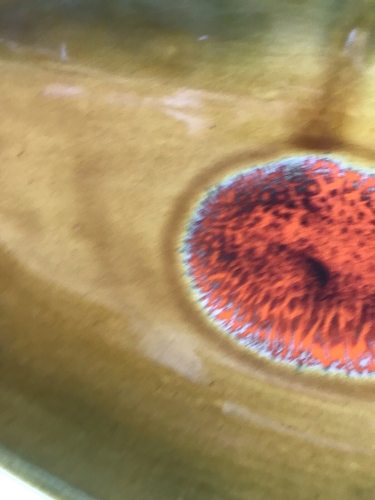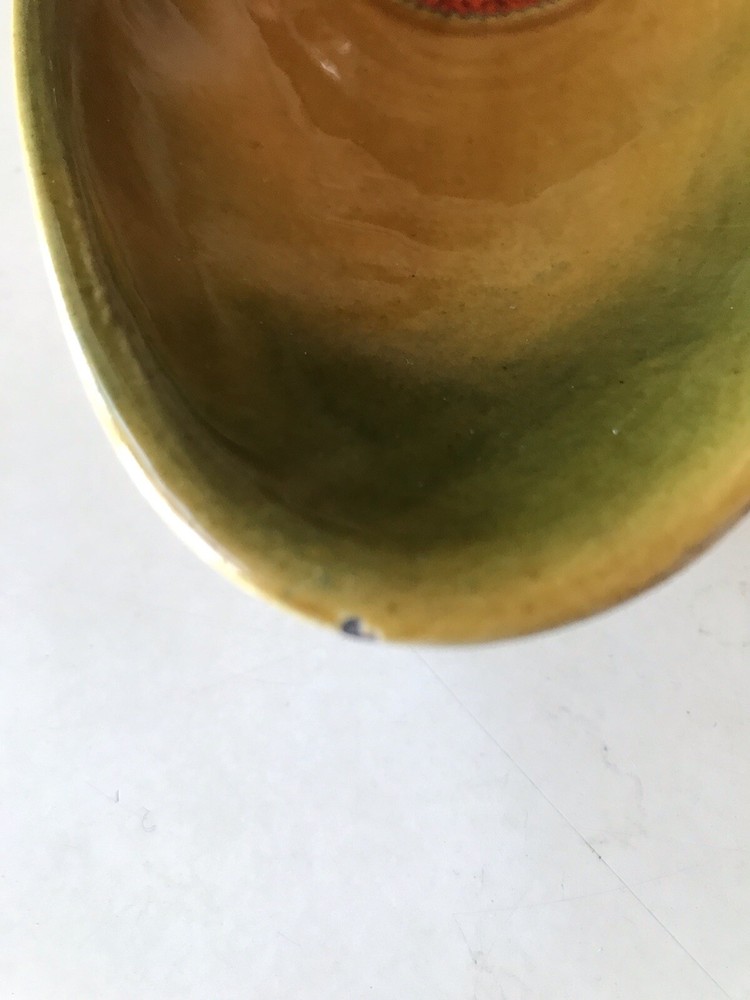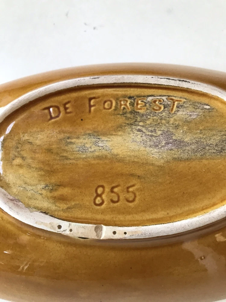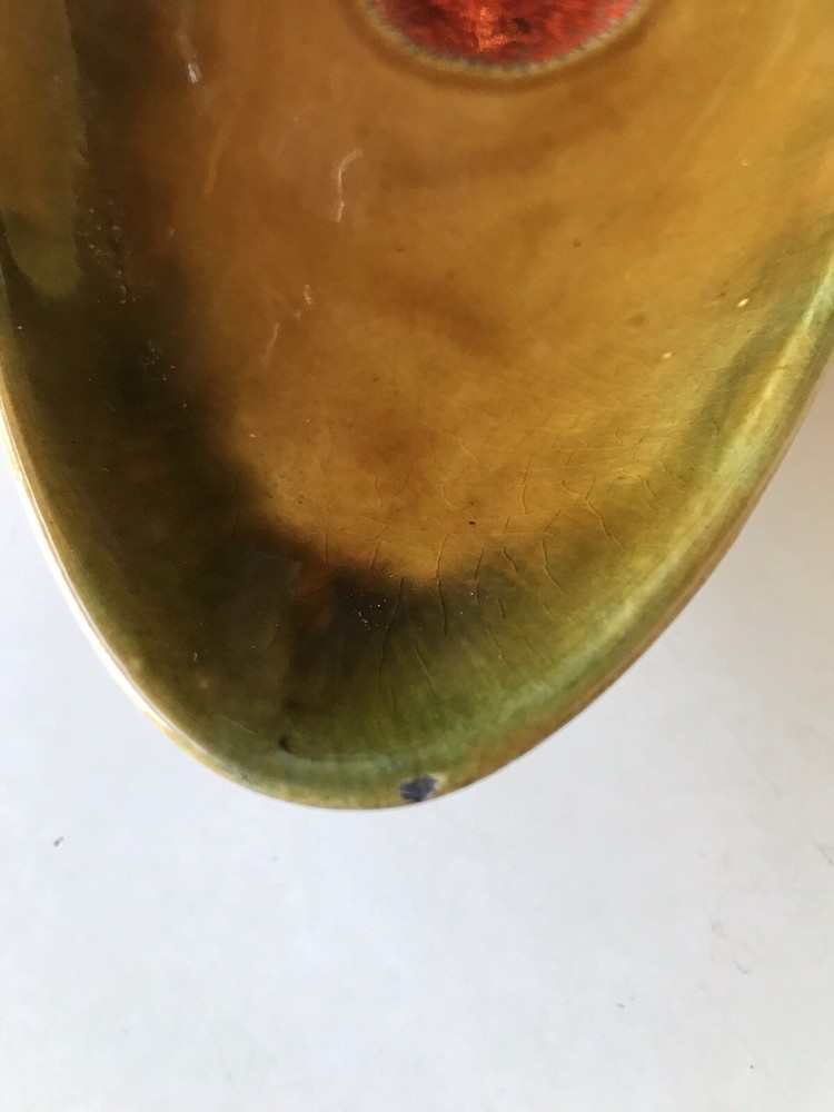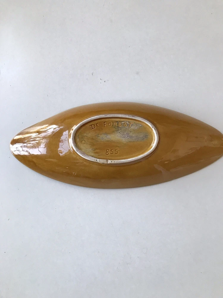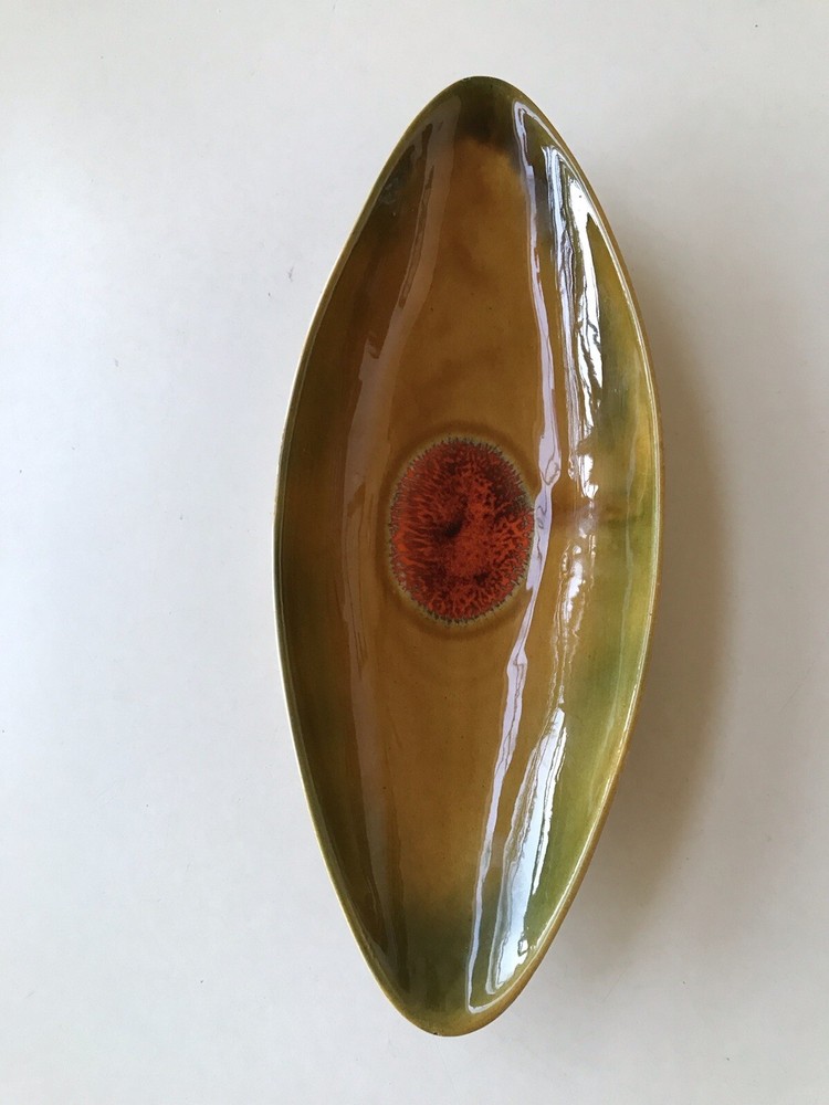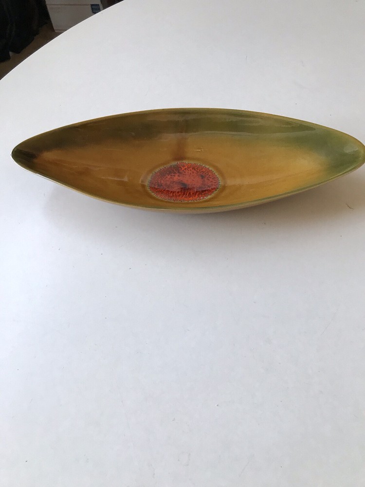 This is a beautiful piece of California art pottery made by Margaret De Forest. It is circa 1965 and measures 14 1/2 inches long, 6 inches wide and 2 inches tall. Perfect for a coffee table or sofa table. It is an orange and green glaze with a center decoration of a dark orange color. It is in beautiful vintage condition with a couple of what look to be old nicks (SEE PHOTOS SOLD AS IS). We professionally pack, ship and insure all of our items.