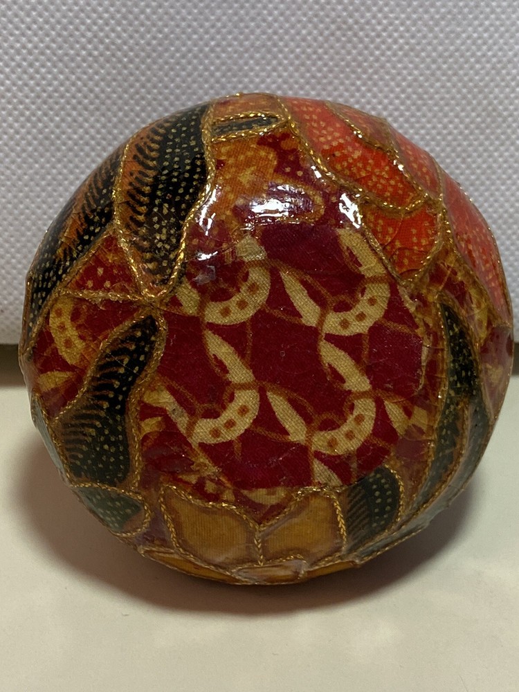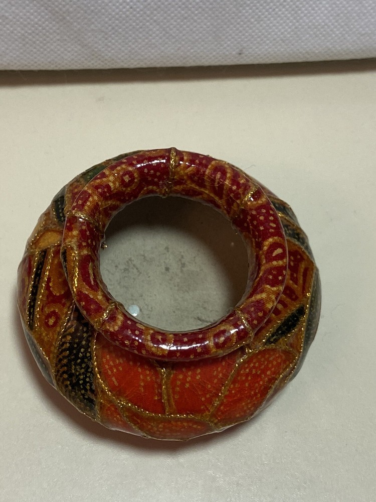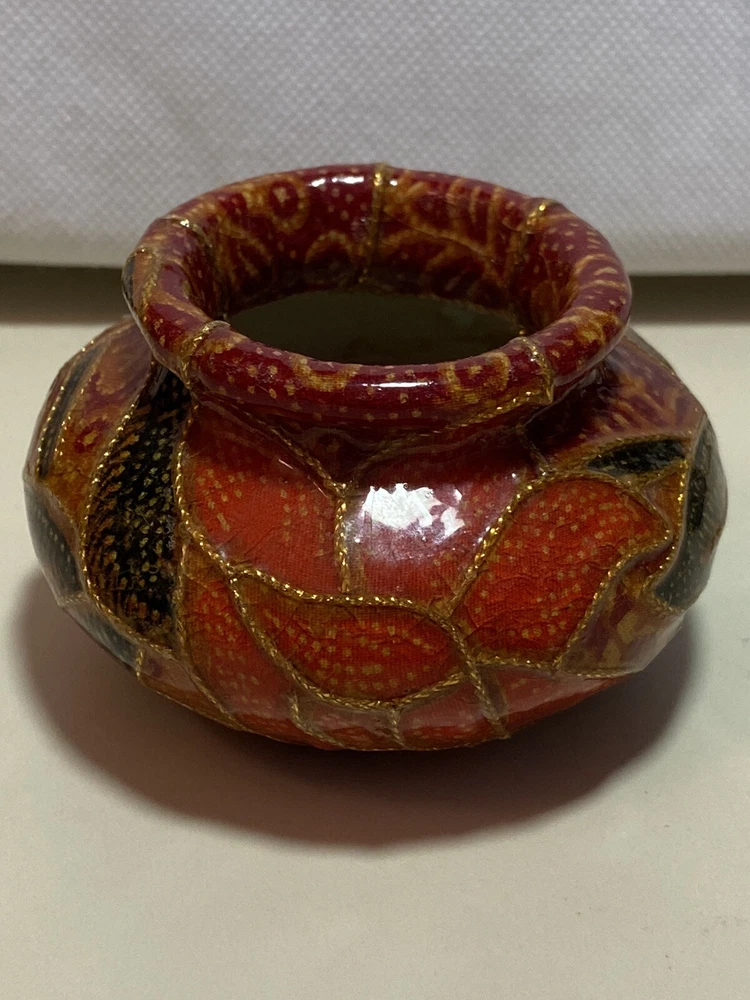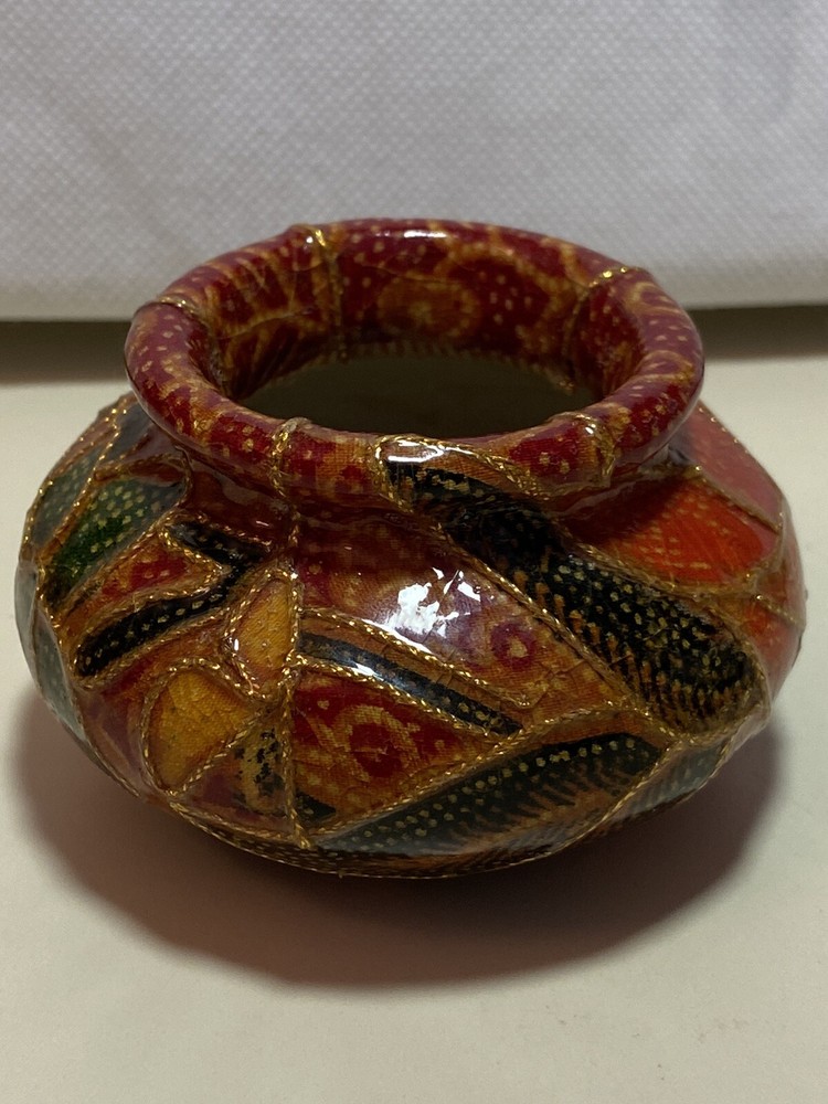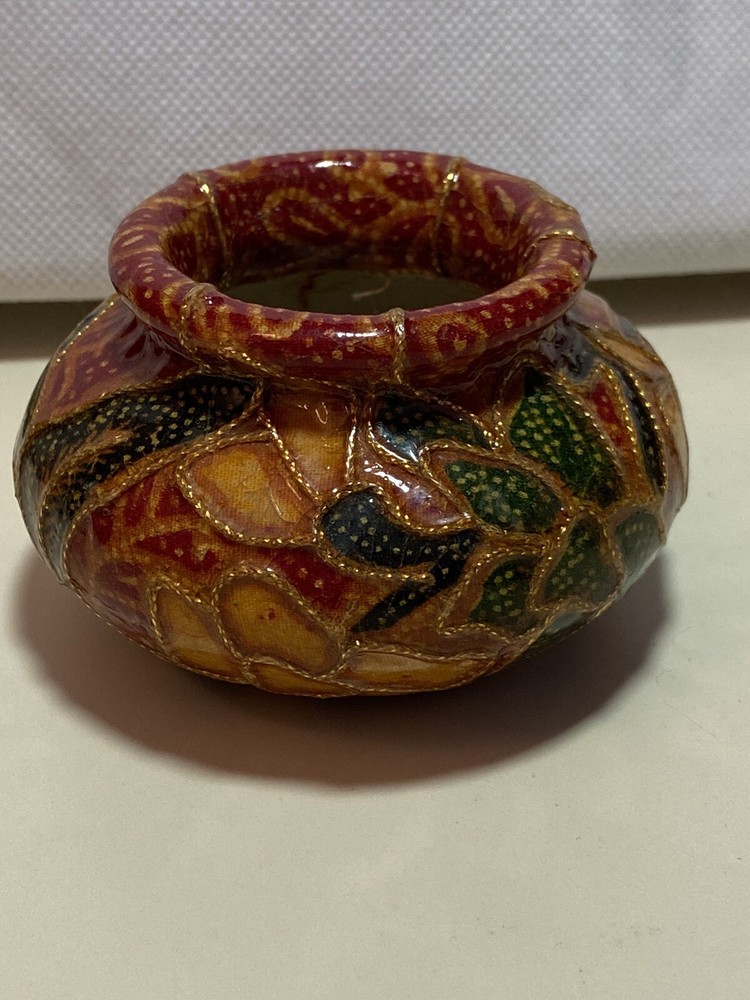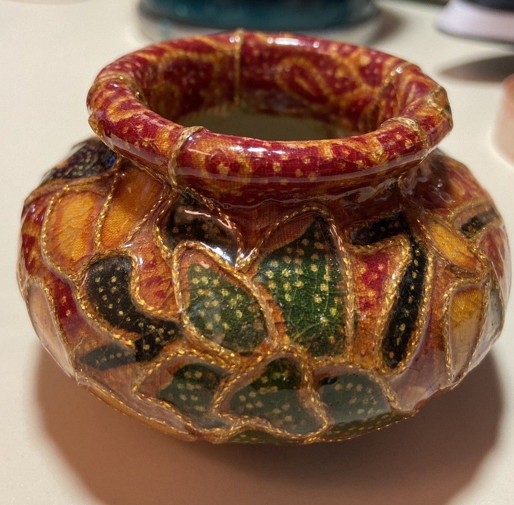 This pretty vintage decoupage-style stoneware vase was handmade in Italy and is from the late 1960s - early 1970s. It has a Mid Century Modern MCM retro feel to it in its colors - rust orange, gold, brick red, green and yellows. Very beautiful. It measures about 2" tall and is about 2" in diameter on the top. Very unique. No chips, breaks or repairs. See pictures for details. Shipped with USPS tracking. (C)