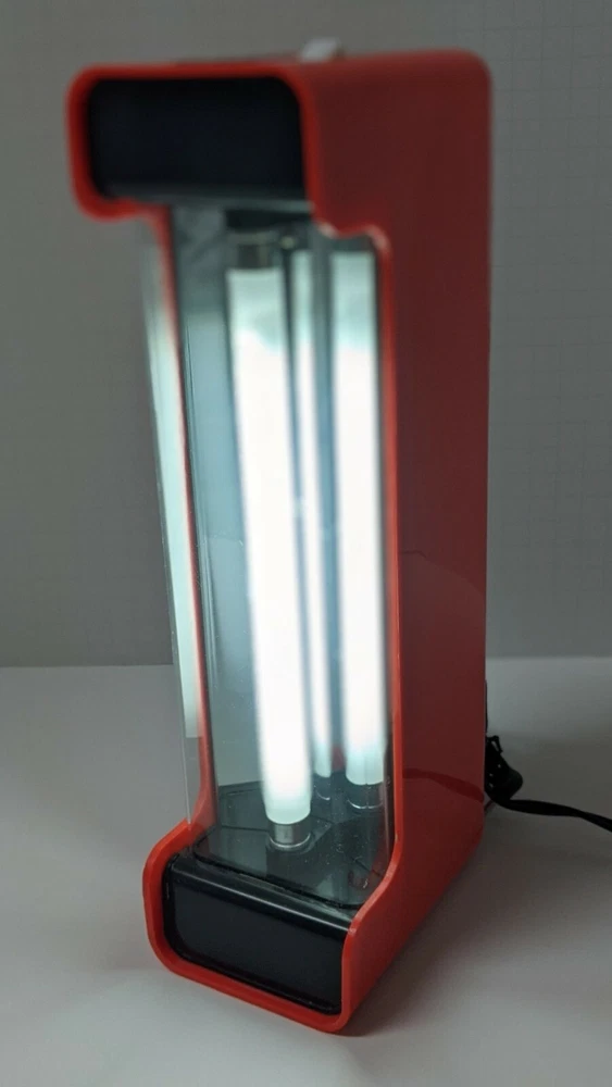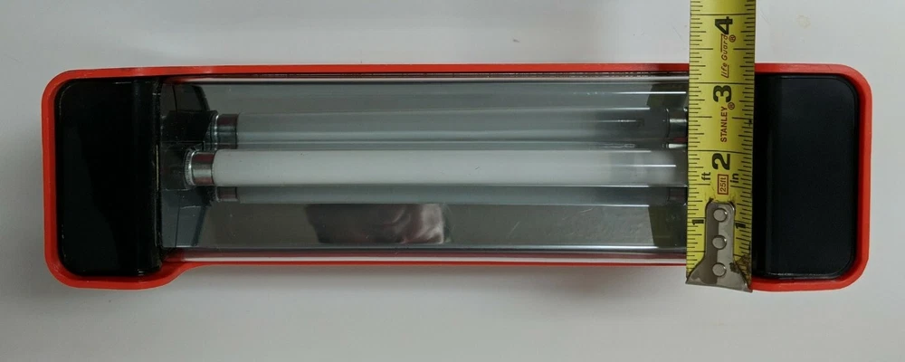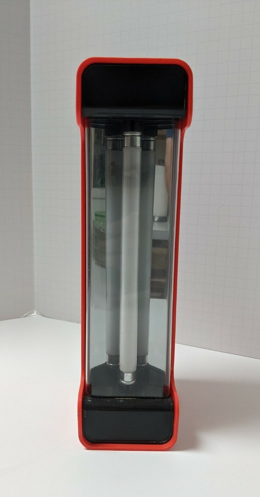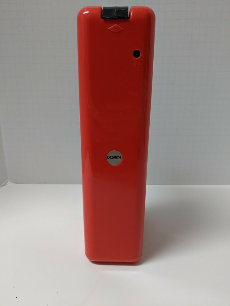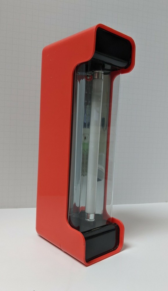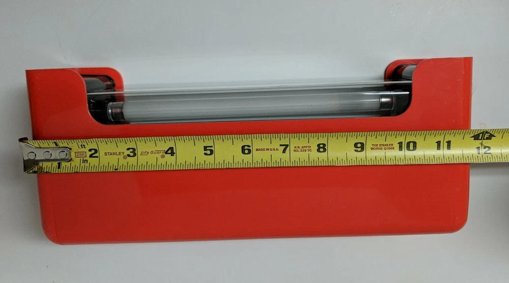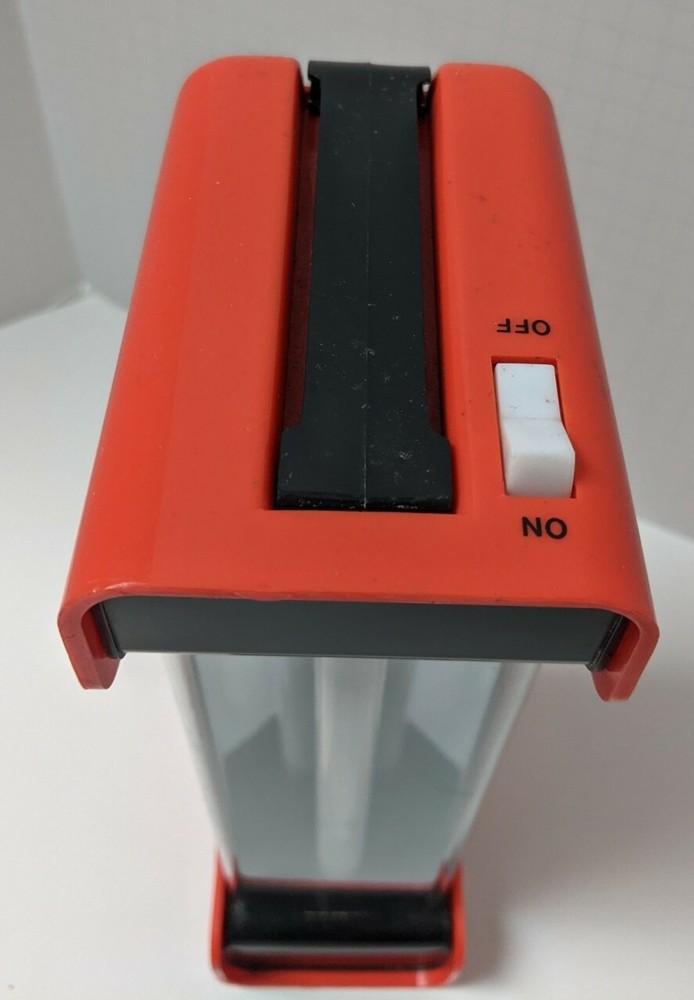 Vintage Dorcy 12v Battery Fluorescent Camping Lantern Bright Orange Mid-Century Modern Style This is a classic design from Dorcy and it is in good condition with no cracks in the plastic and the lamp still works. I can't find the original designer for this lantern but it is a classic mid-century piece. This is a collectible not a practical use lantern for actual camping. Maybe in 1972 it was but not today. The same design was also released as a Forda lantern. I tested this lantern with a 12v AC adapter but I have not tested it with batteries but the battery case is clean and never had any battery leakage.