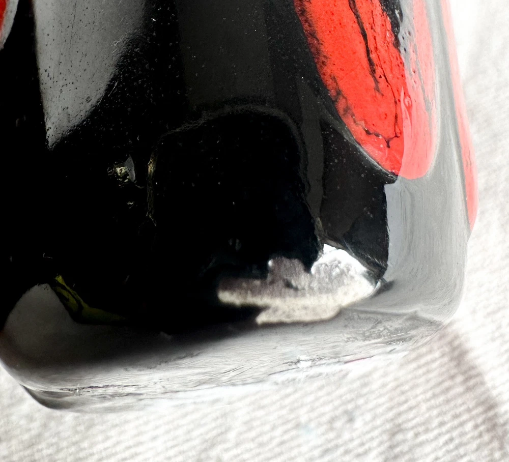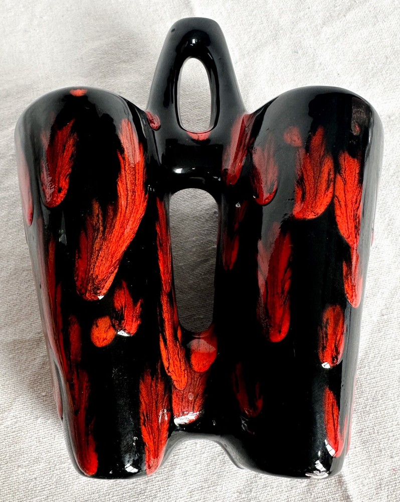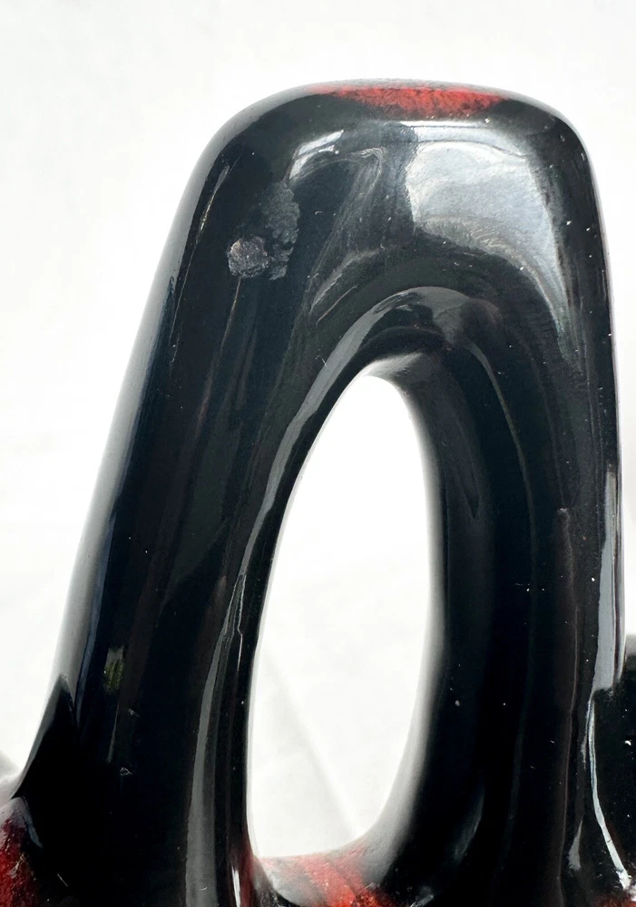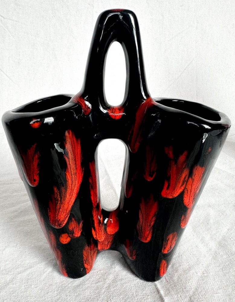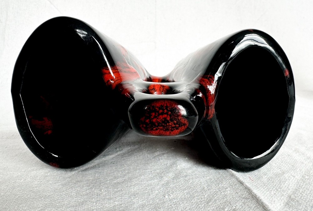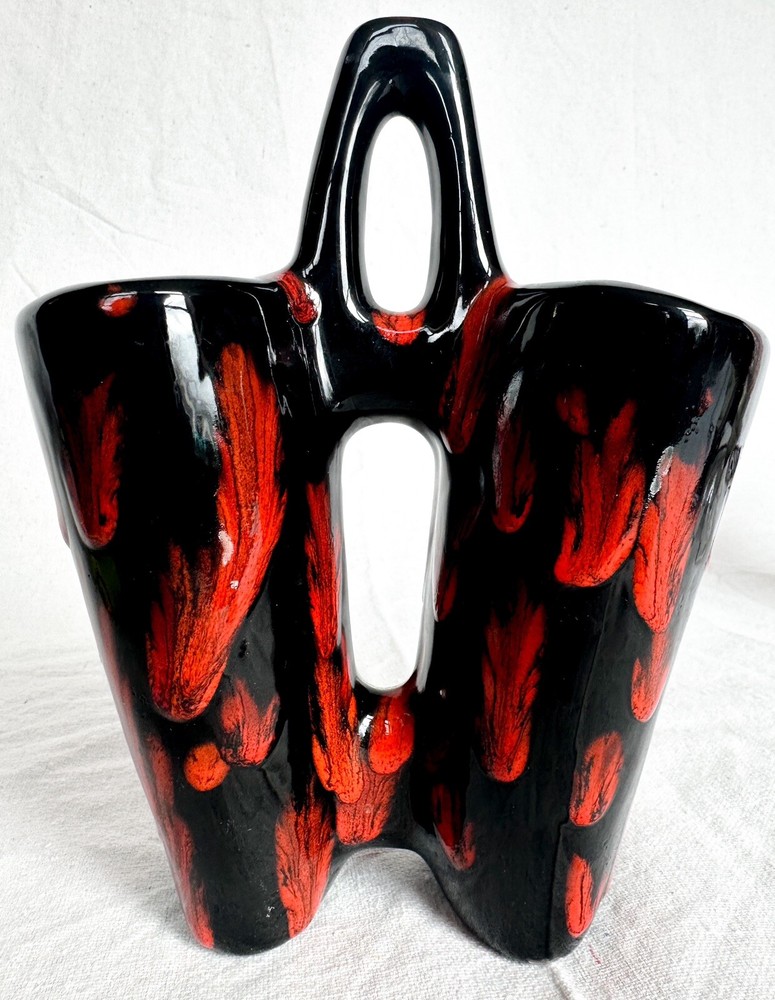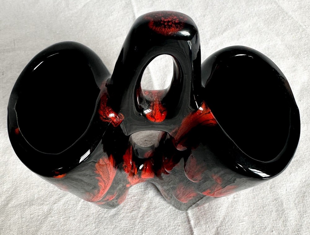 A very striking and unique double vase featuring a black glaze with red/orange accents. It's the perfect unique MCM vase. It's glazed on the inside too which is cool. There are two small glazing anomalies that if you turn to the back you can't see either of them, but please reference pictures. Dimensions: 7.75"H x 6.25"L x 3.25" W.