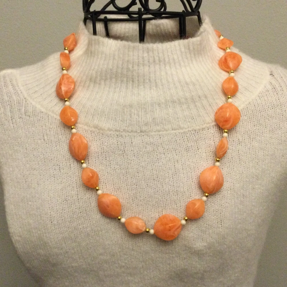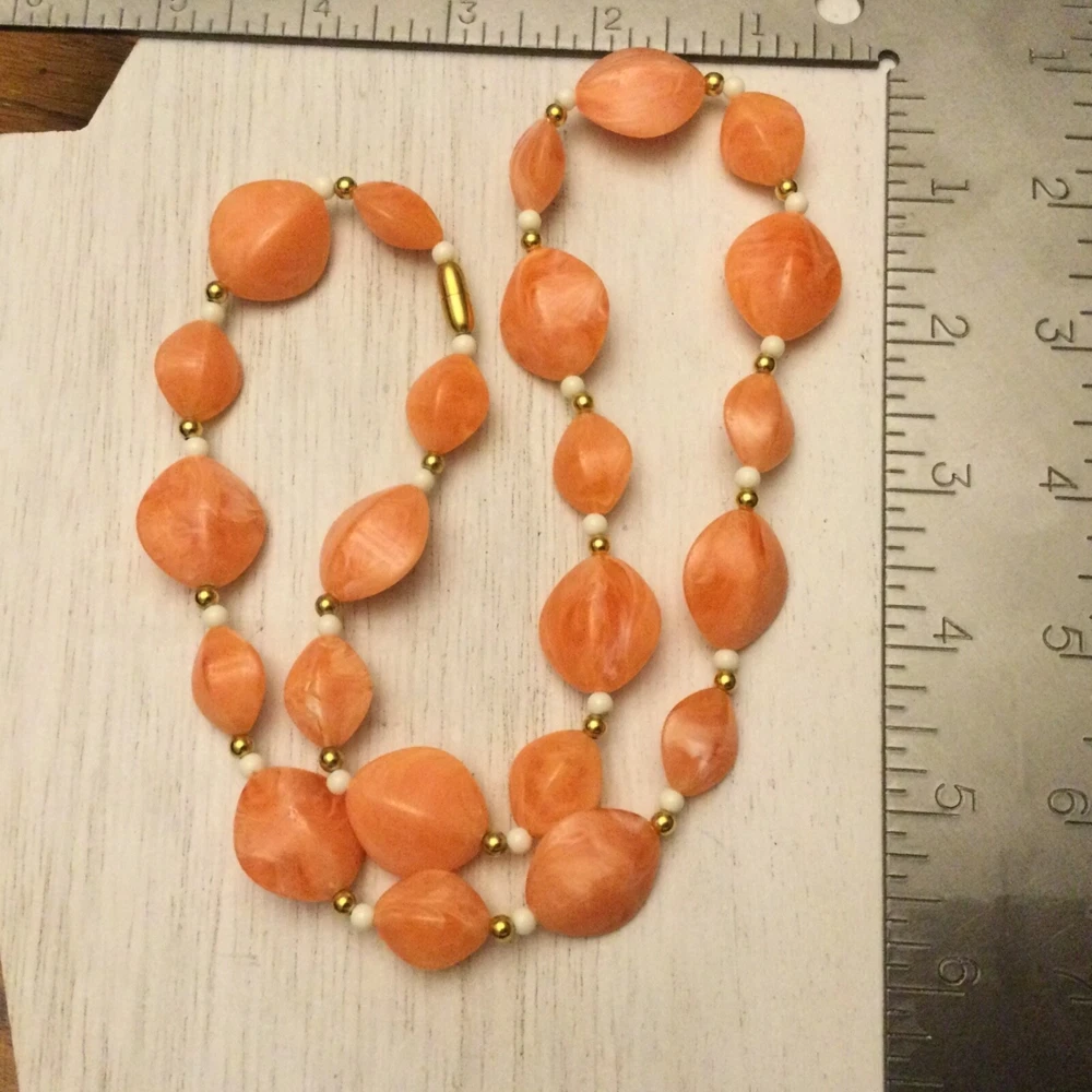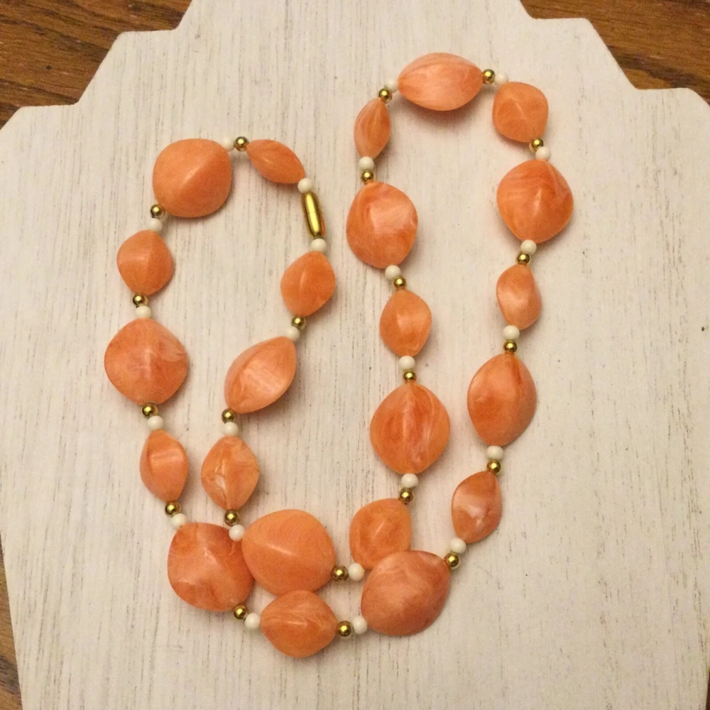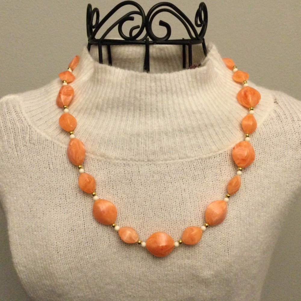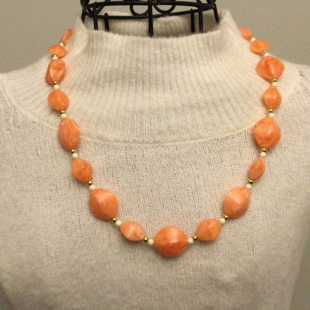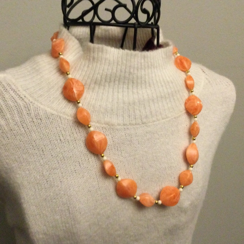 Vintage Estate Orange Swirl Beaded Necklace. Lovely vintage piece with swirl design with white and gold separator beads. Screw barrel clasp. Please see photos for measurements and details. I will happily combine shipping for multiple items. Thanks for looking
