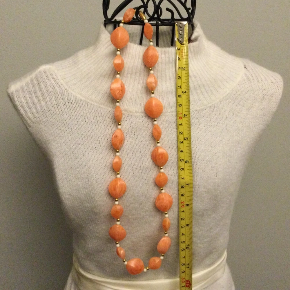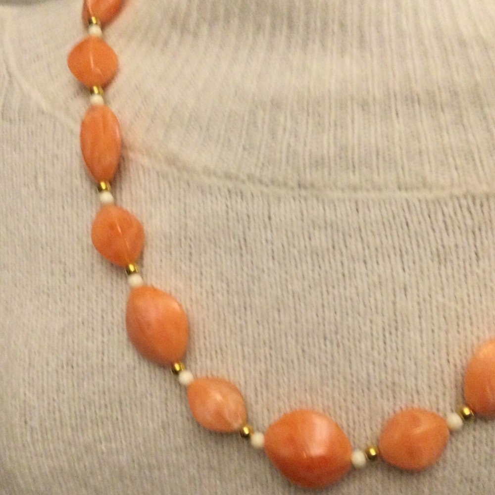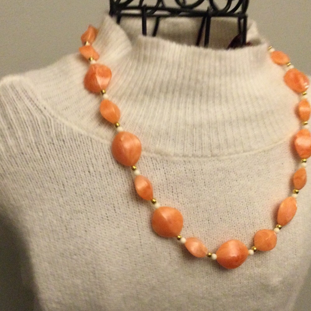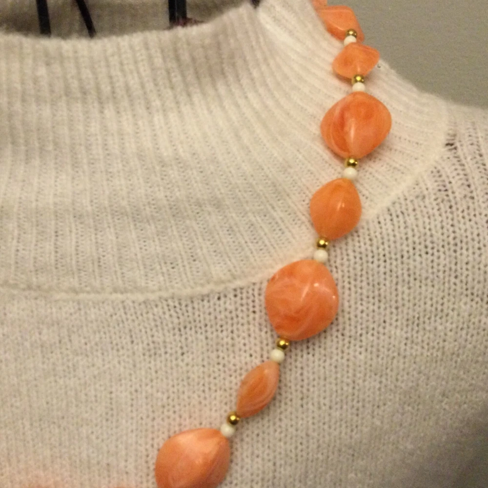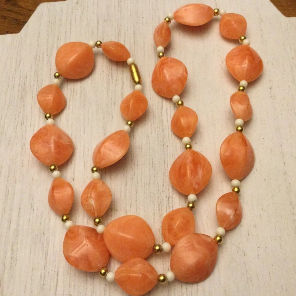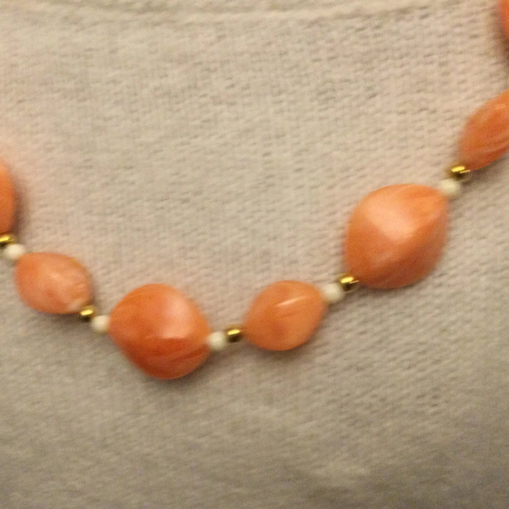 Vintage Estate Orange Swirl Beaded Necklace. Lovely vintage piece with swirl design with white and gold separator beads. Screw barrel clasp. Please see photos for measurements and details. I will happily combine shipping for multiple items. Thanks for looking