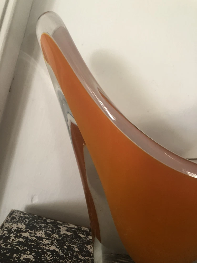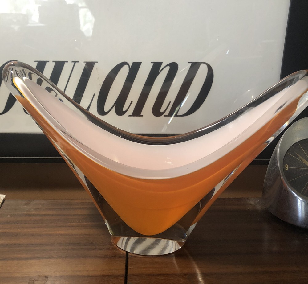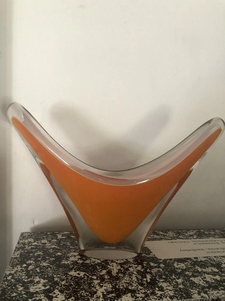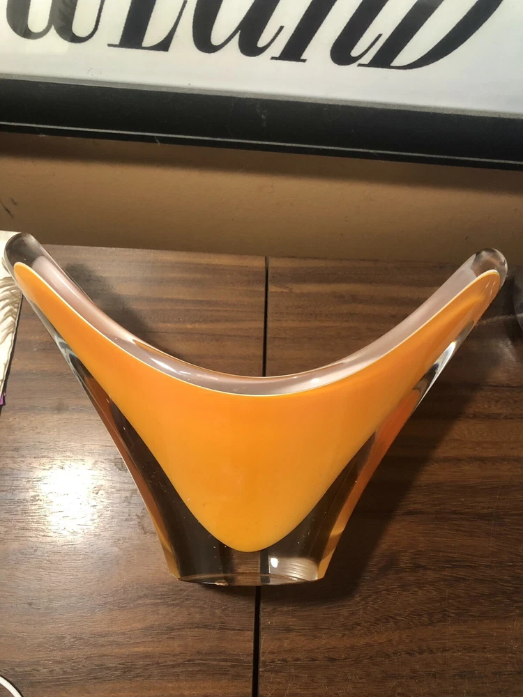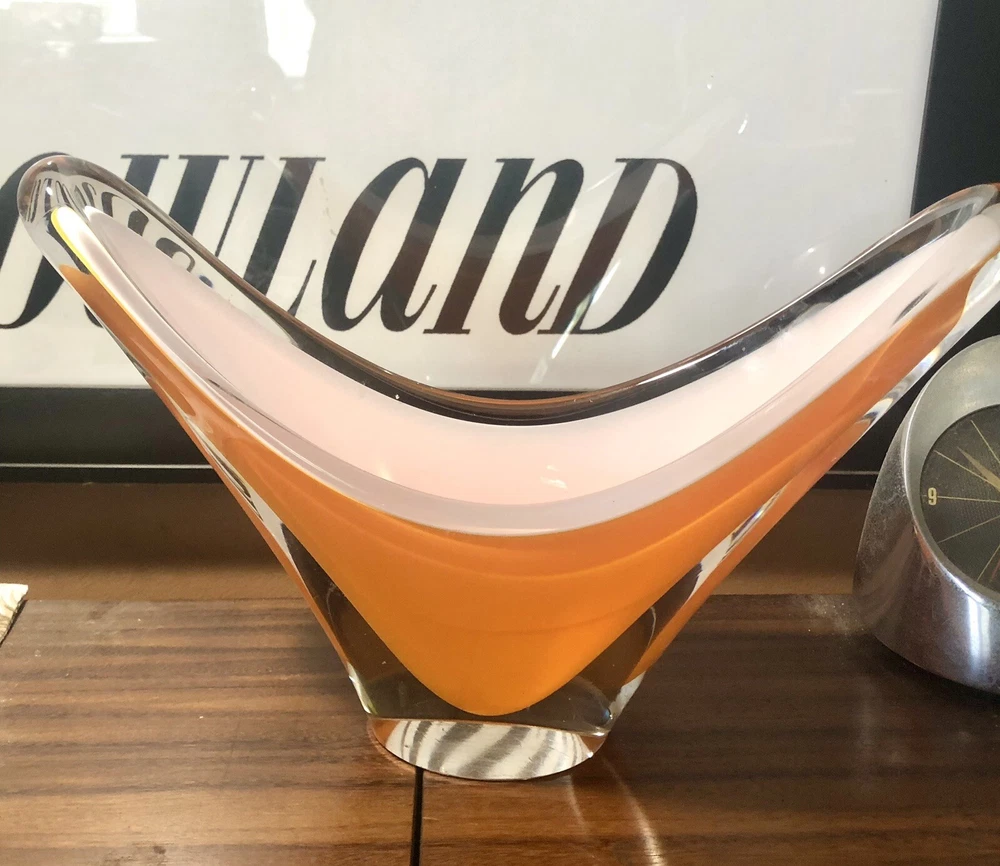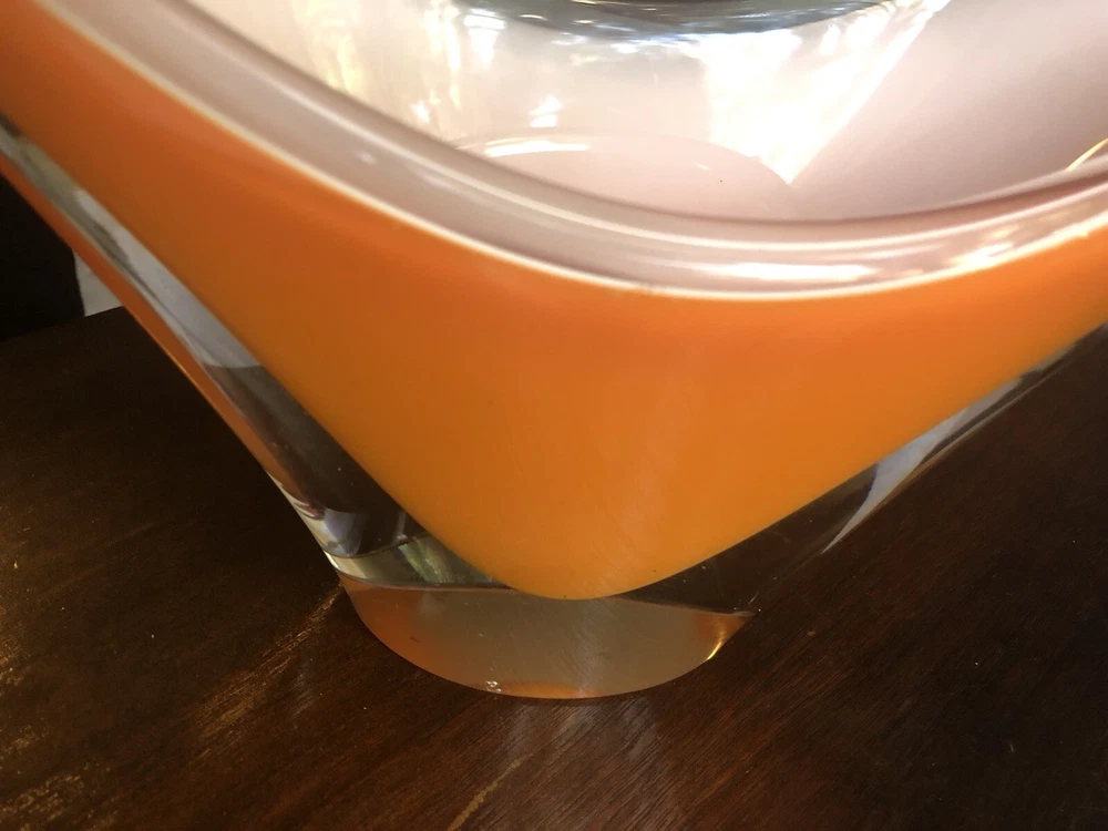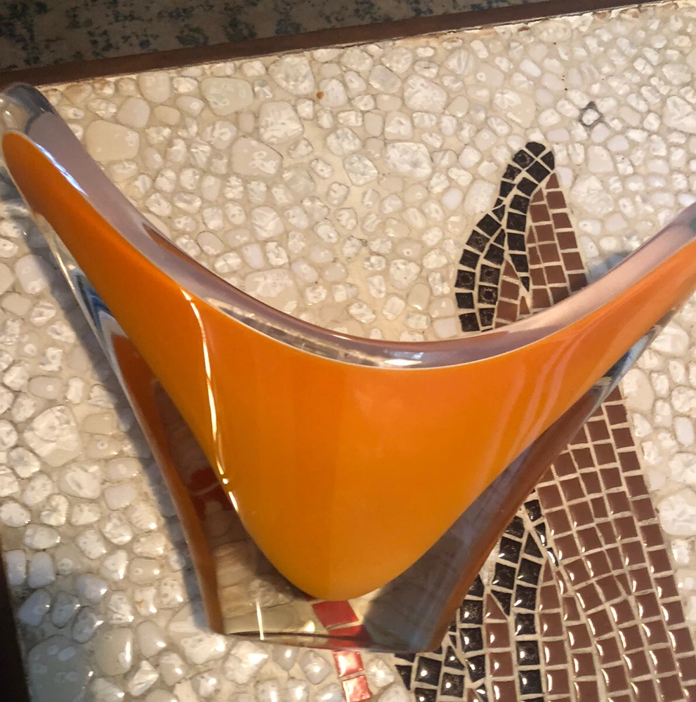 Vintage FLYGFORS Bowl 1961 ORANGE Mid Century Art Glass. Fresh out of an estate. This beautiful bowl is eye-catching and representative of art glass from the Mid Century. This would have been the type of thing you would see on the Dick Van Dyke show or any modern home of the early 60s. It is signed on the bottom Orange with red on the inside. It does have one small imperfection. On the bottom, there’s a small Nick or crack. It’s tiny, but you can see it in the photos, please look carefully at zoom in. This does not affect the overall look and impact of this great Mid Century bowl. Please look at the photos carefully and zoom in. Got any questions? Shipping for an item, like this will not only be determined by its weight and size, but also about the extra packing material that it will require to prepare it for shipment.