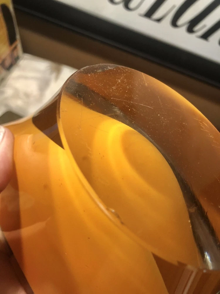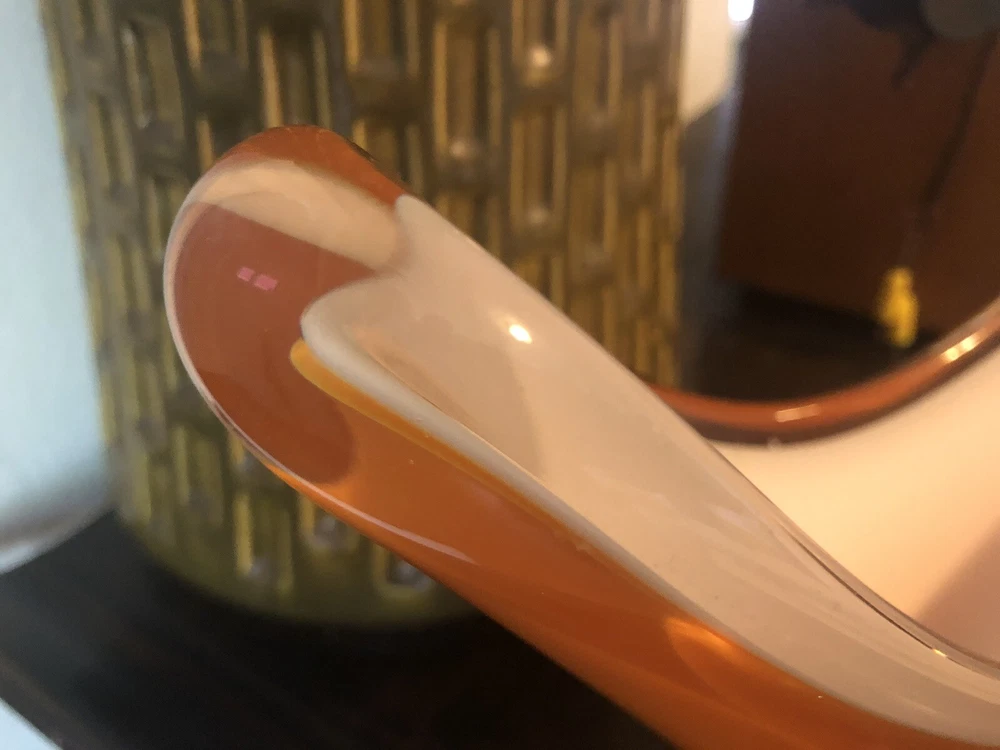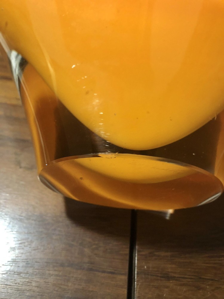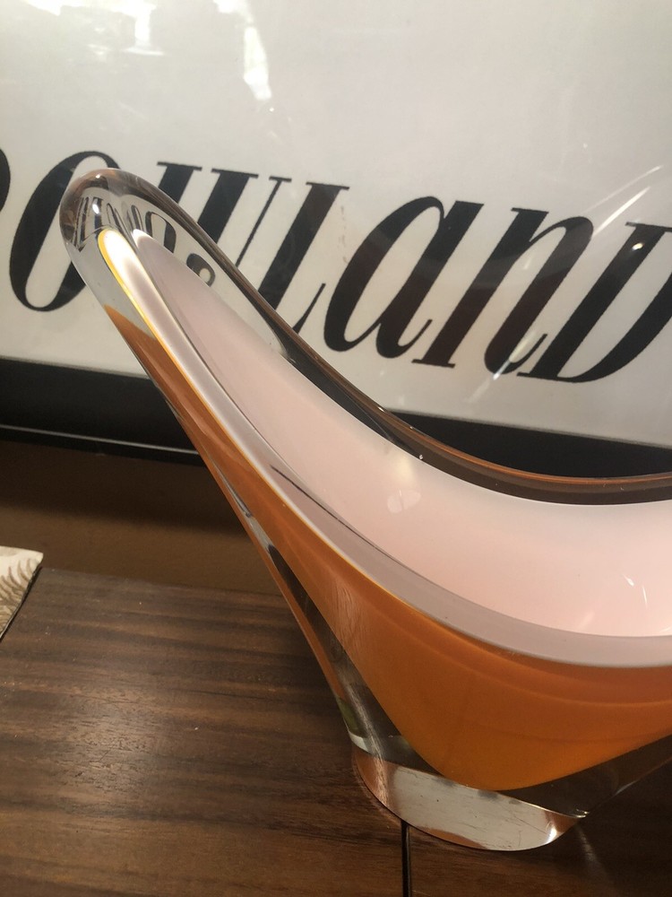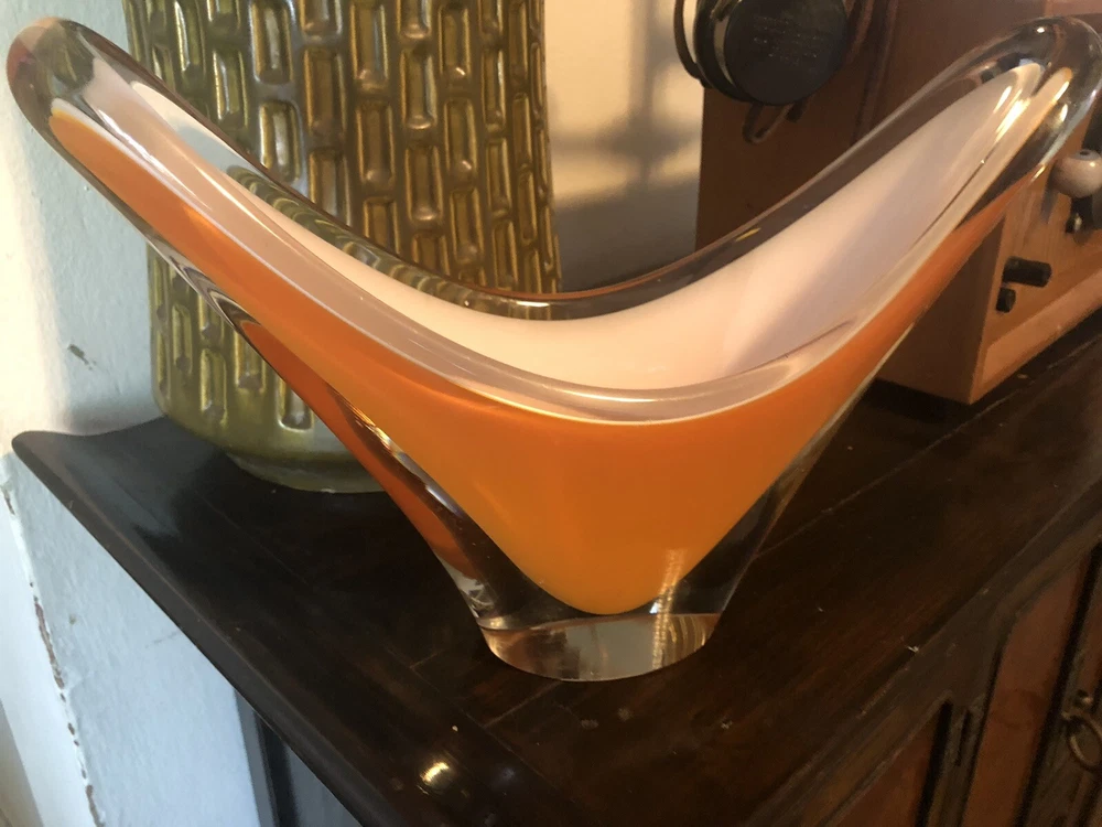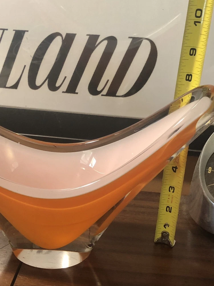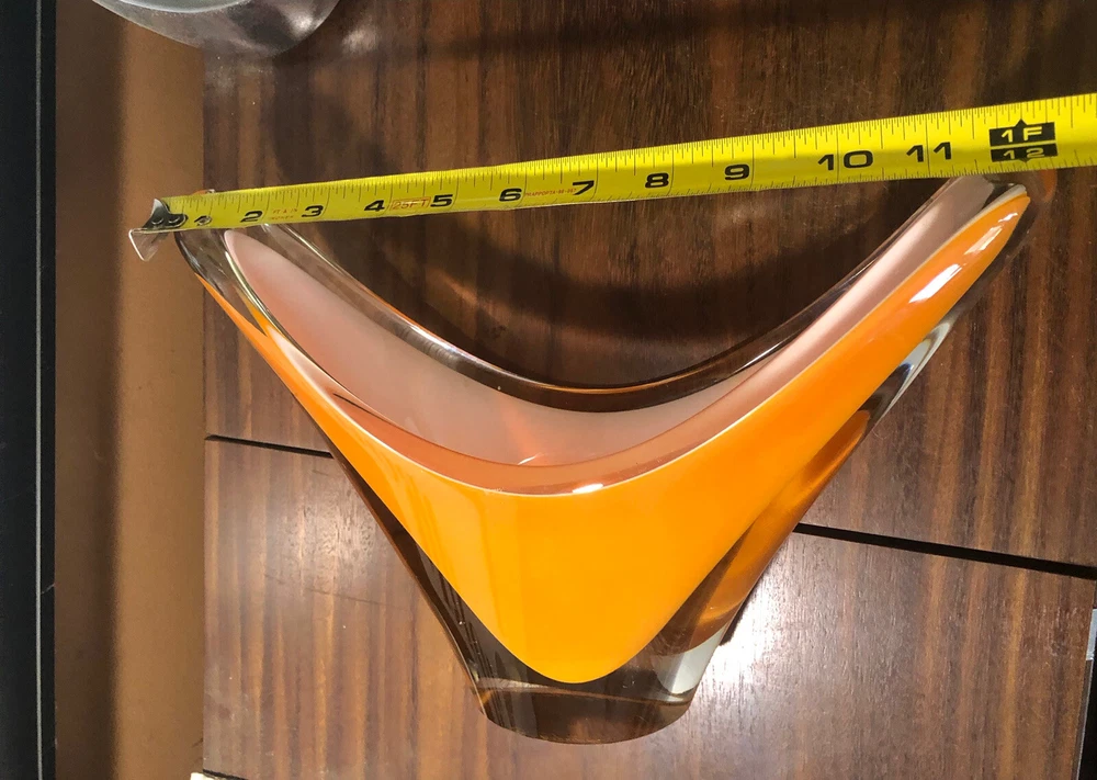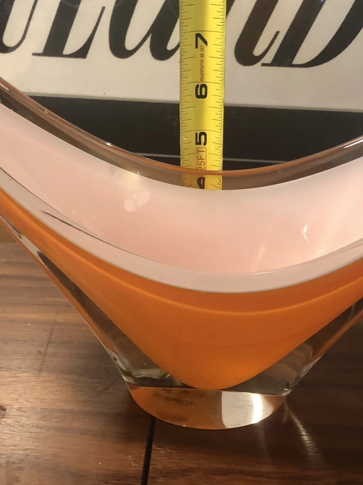 Vintage FLYGFORS Bowl 1961 ORANGE Mid Century Art Glass. Fresh out of an estate. This beautiful bowl is eye-catching and representative of art glass from the Mid Century. This would have been the type of thing you would see on the Dick Van Dyke show or any modern home of the early 60s. It is signed on the bottom Orange with red on the inside. It does have one small imperfection. On the bottom, there’s a small Nick or crack. It’s tiny, but you can see it in the photos, please look carefully at zoom in. This does not affect the overall look and impact of this great Mid Century bowl. Please look at the photos carefully and zoom in. Got any questions? Shipping for an item, like this will not only be determined by its weight and size, but also about the extra packing material that it will require to prepare it for shipment.