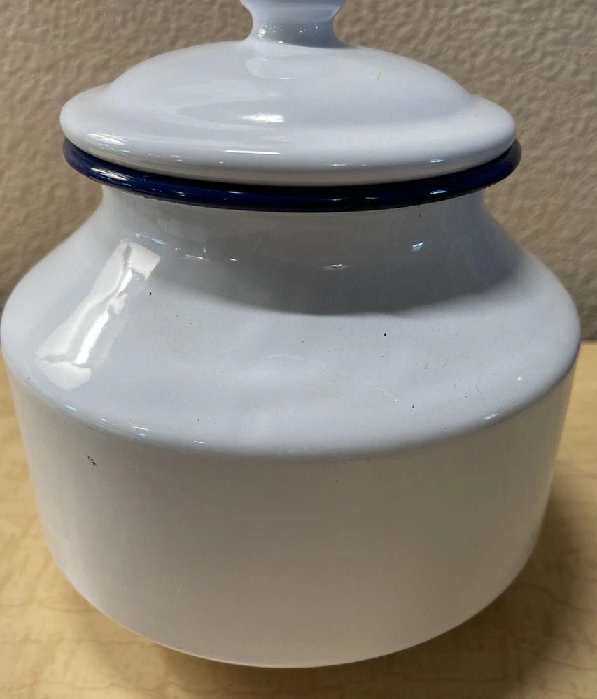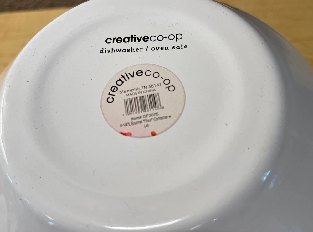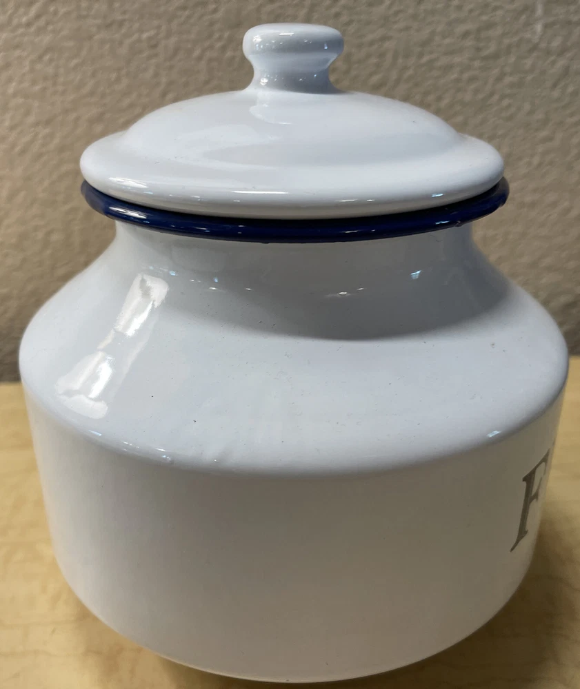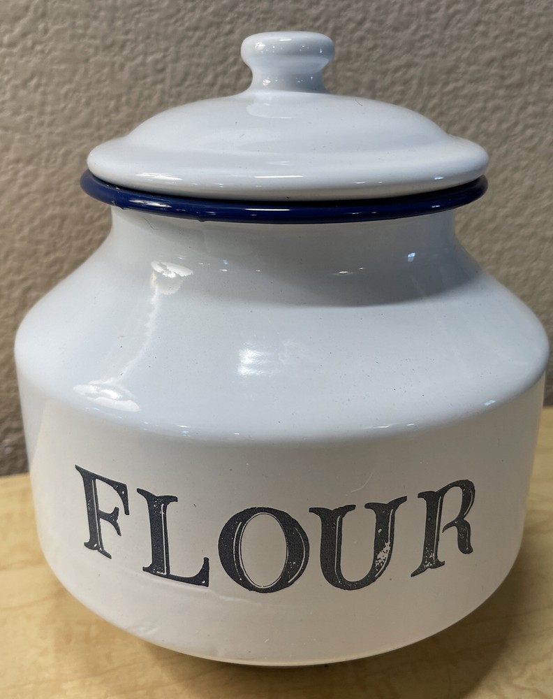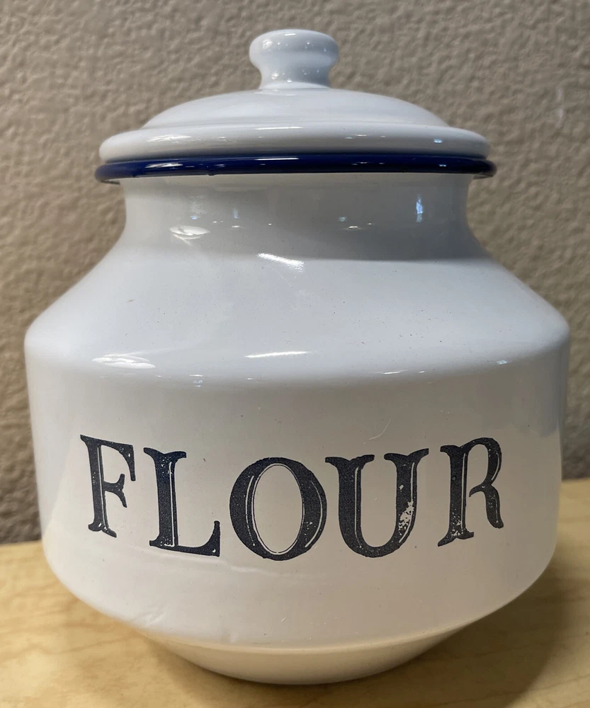 Vinayge Farm Design Enamelware Flour Canister by Creative Co-op. Features from Sears site (originally sold at) : The perfect classic canister for any kitchen Ideal for storage or collecting Dark blue lettering gives a striking contrast against the white enamel surface 6. 25"L x 6. 25"W x 7"H (with lid) Very fun useful and collectible. Nice condition. See pictures. Sold as seen It’s about 1.5# by itself.