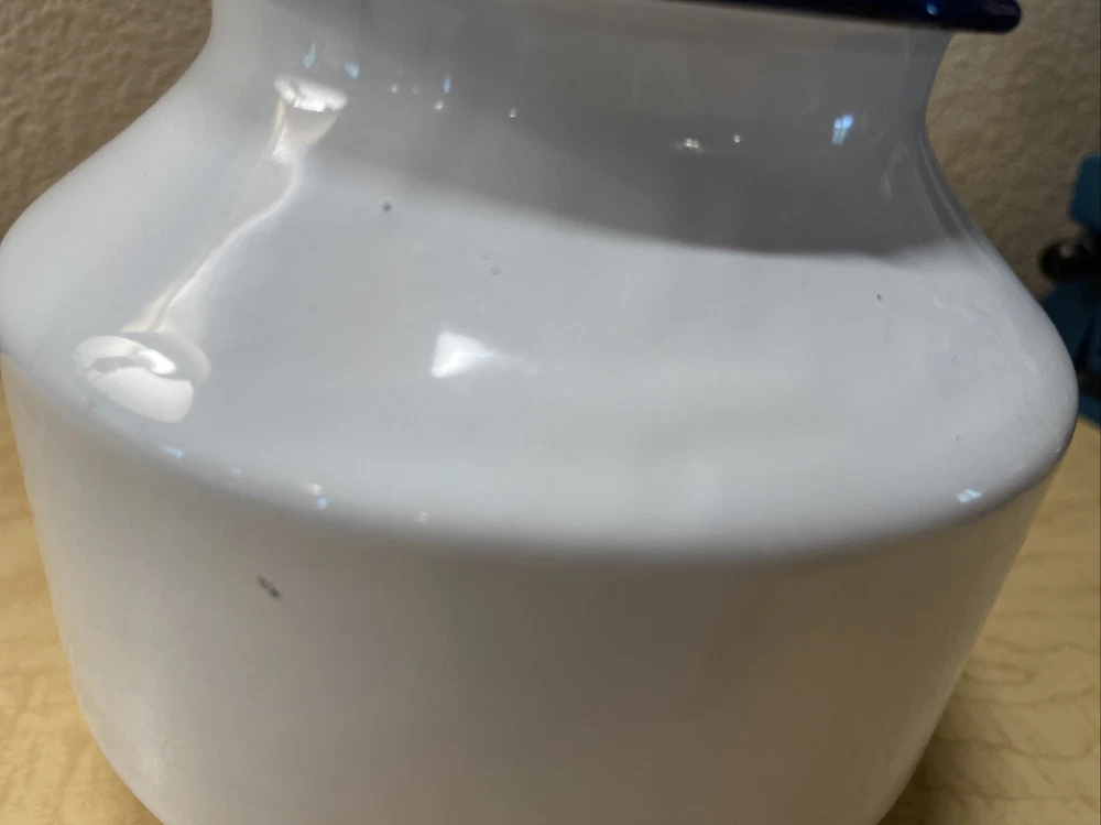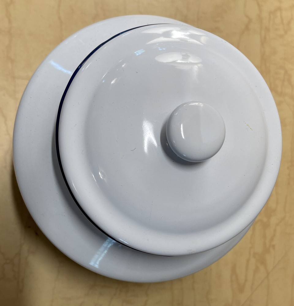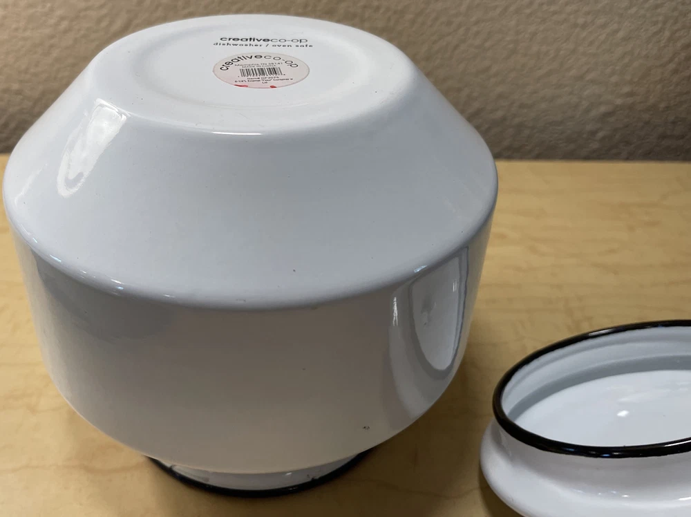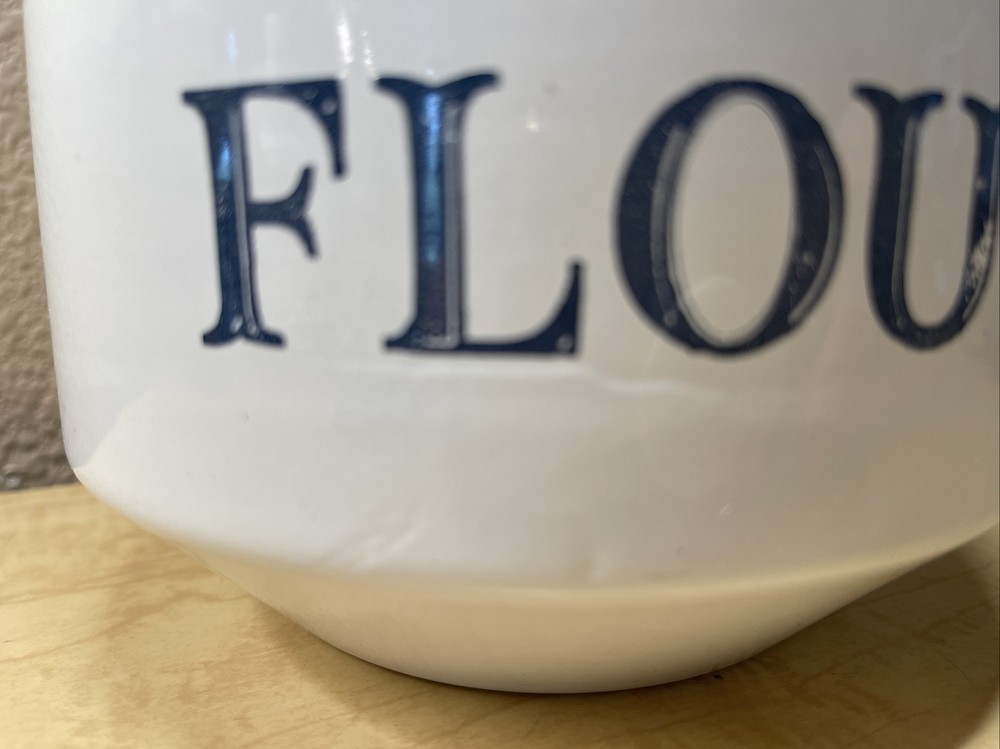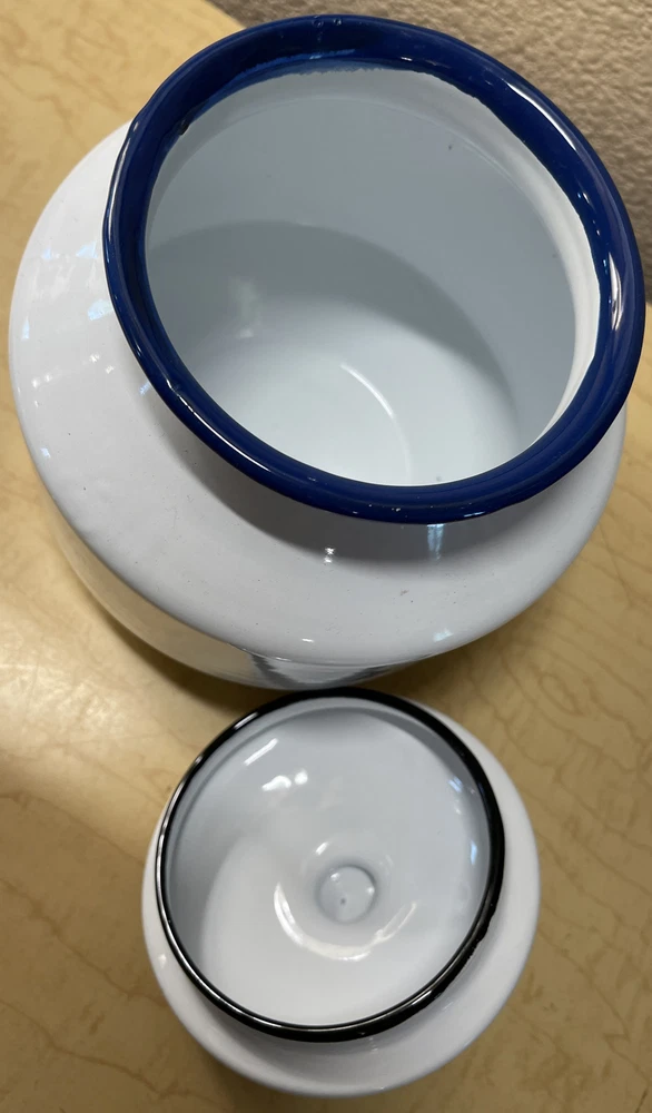 Vinayge Farm Design Enamelware Flour Canister by Creative Co-op. Features from Sears site (originally sold at) : The perfect classic canister for any kitchen Ideal for storage or collecting Dark blue lettering gives a striking contrast against the white enamel surface 6. 25"L x 6. 25"W x 7"H (with lid) Very fun useful and collectible. Nice condition. See pictures. Sold as seen It’s about 1.5# by itself.