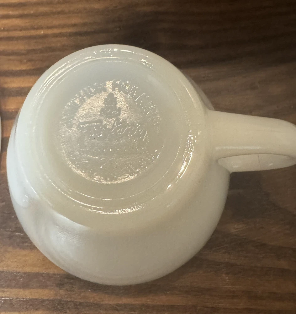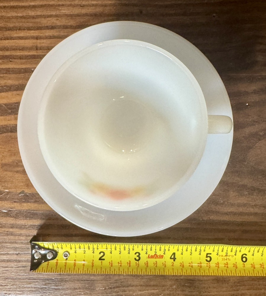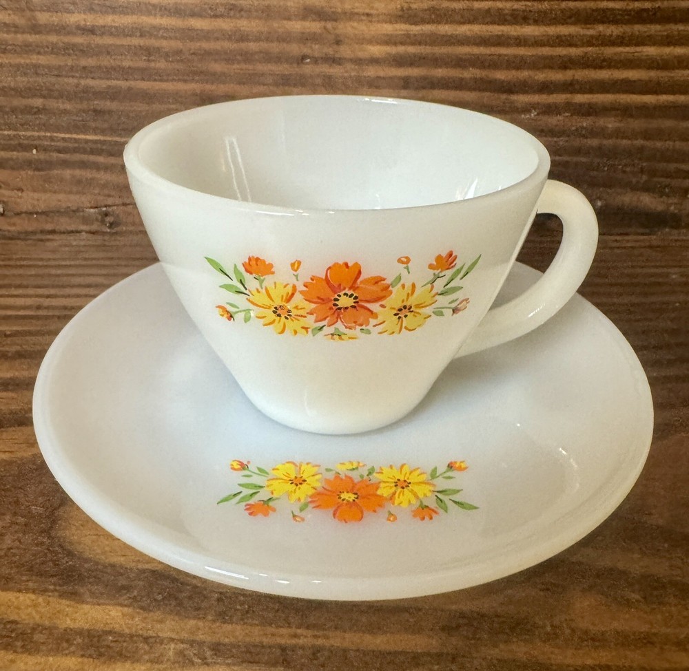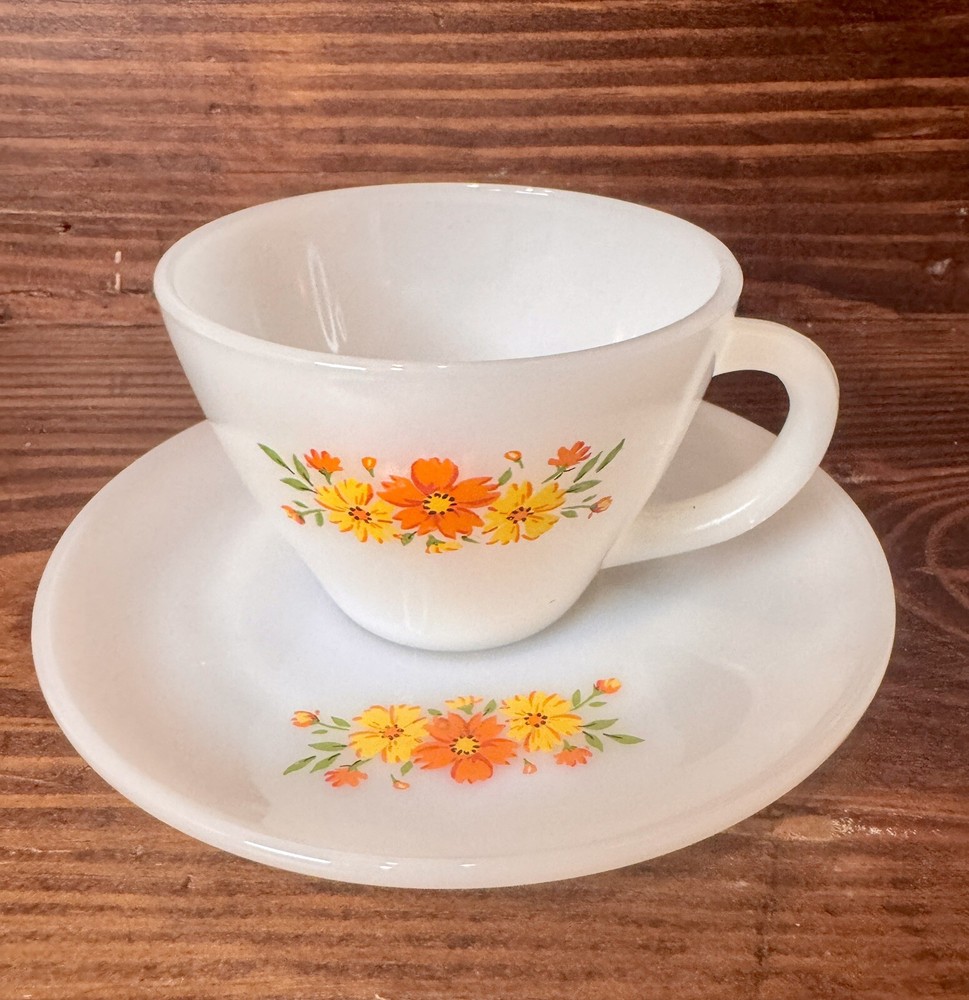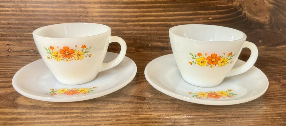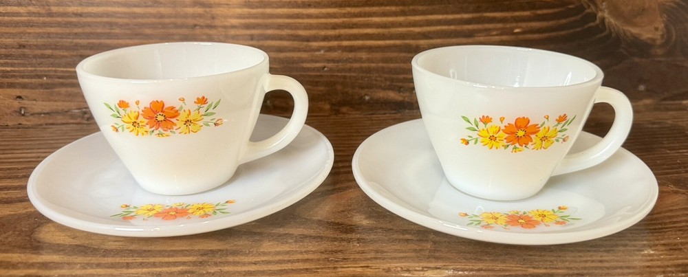 This vintage set includes two Fire King cups and two saucers. The round cups and saucers feature a floral pattern with orange and yellow cosmos flowers. This mid-century modern style set was produced in the United States during the 1960s and is made of milk glass. Perfect for all occasions, these Fire King cup and saucer sets are a must-have for any collector or anyone who loves retro kitchenware. The backstamp is impressed and the product line is Fire-King. Add a touch of vintage charm to your home with these beautiful cups and saucers. ******PLEASE NOTE: These cups and saucers are in very good vintage condition. There is minimal to no marks from use. No chips, cracks or stains. Please see detailed listing photos as they are considered part of the description. Please ask any questions prior to purchasing. I have listed several other matching cups and saucers. Please see my other listings to discover many other treasures!