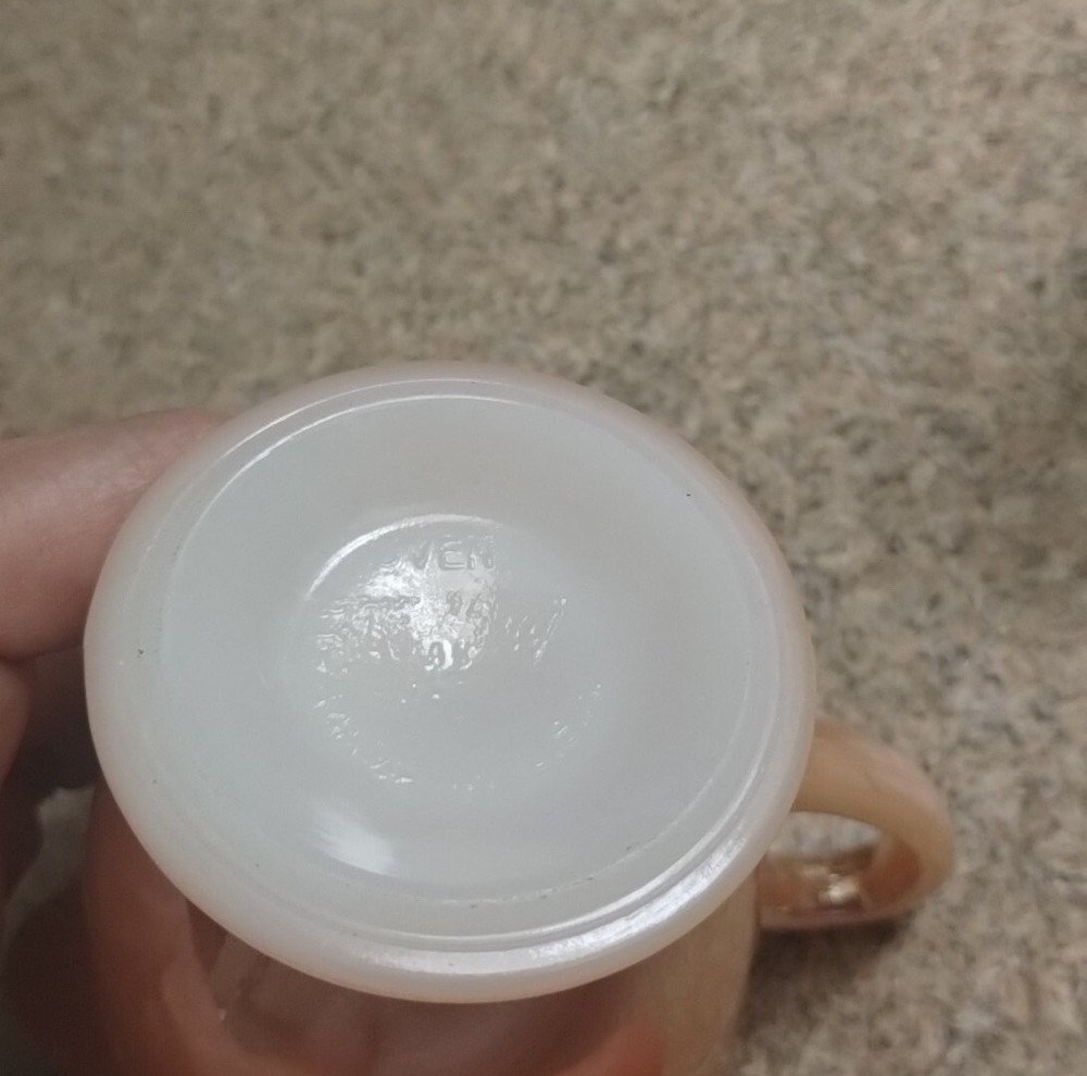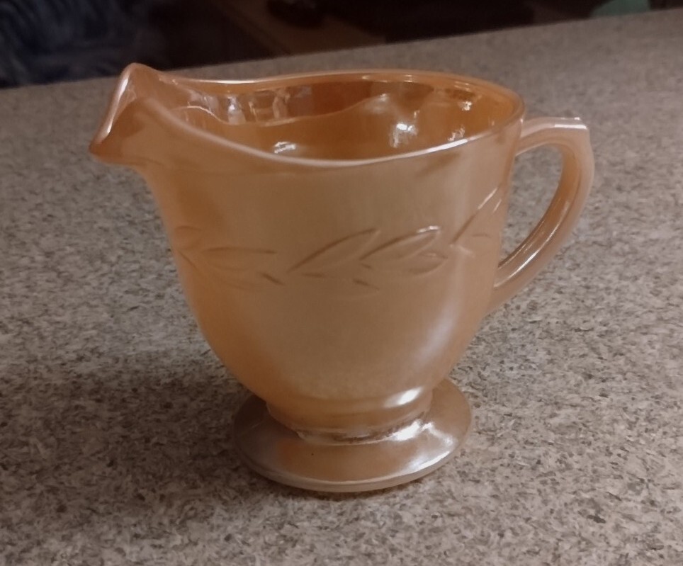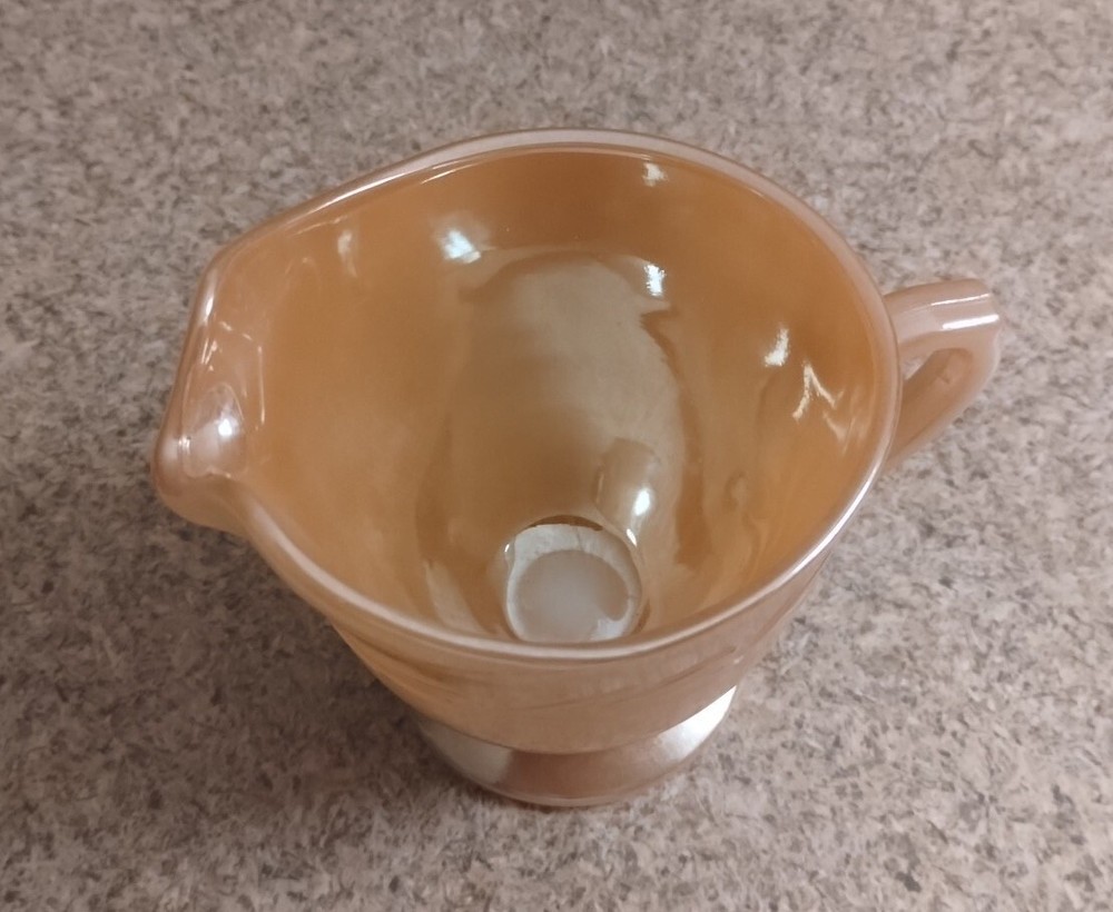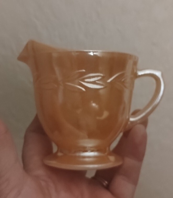 This vintage creamer from Anchor Hocking's Fire King Ovenware collection boasts a beautiful peach luster with a laurel leaf pattern. The round shape and decorative handles make it a charming addition to any mid-century modern collection. Measuring 5" in length, 3 1/8" in height, and 2 7/8" in depth and diameter, this creamer has a capacity of 1/2 cup and is made of glossy pressed glass material. Hand wash only. Perfect for collectors or those looking to add a touch of vintage charm to their home decor. No damage, clean inside. Sold as is. Please check out my huge selection of vintage glassware, available for sale, in my ebay store-serenasodditiesandfinds