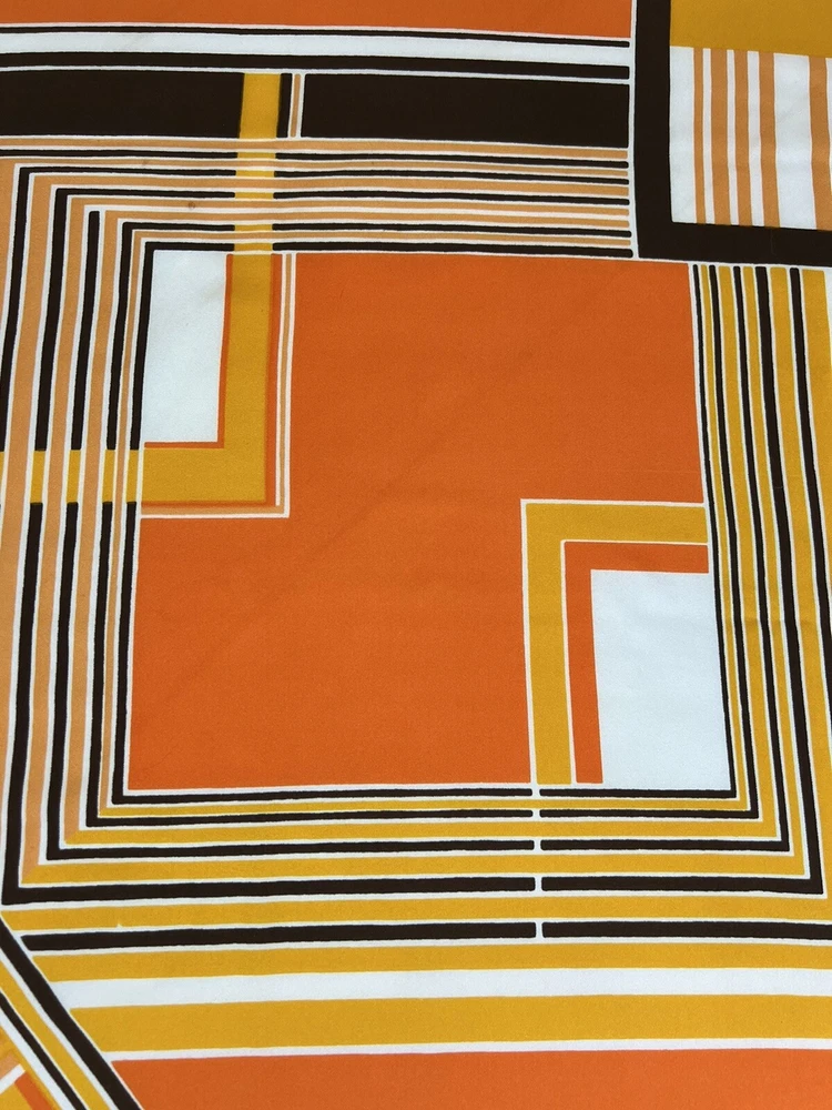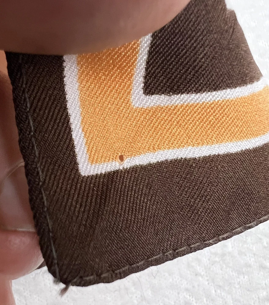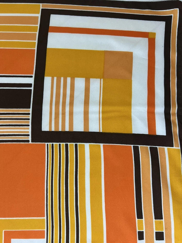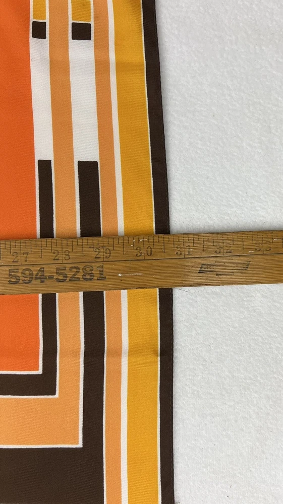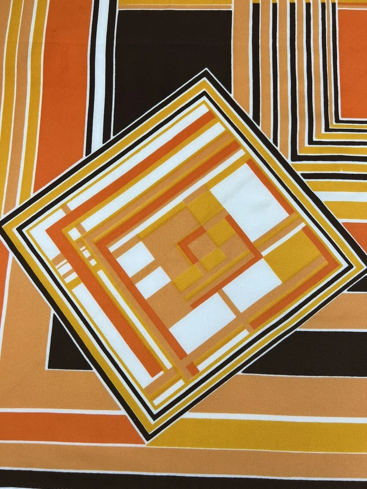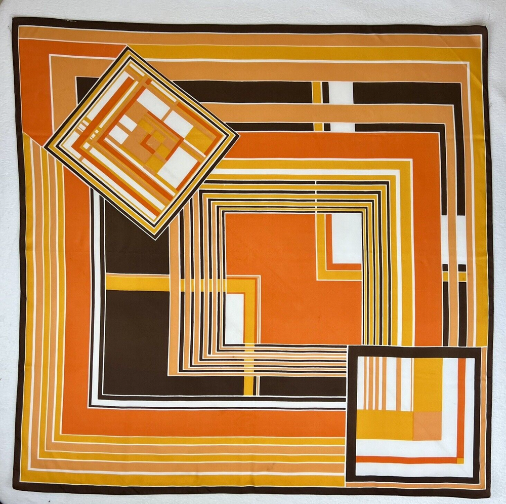Vintage 1960’s 1970’s Geometric Mid Century Boho Scarf Brown Orange Gold 30 3/4" 30 3/4" x 30" 1.5 oz Gorgeous vintage likely polyester scarf. This looks late mid century or even early 1980's with it's warm gold, brown, orange, and white geometric squares and lines. Its a nice size that it could be used for hair, or around the neck. There is a pull, a couple of spots, and a tiny hole. All of these aren't very obvious upon first glance. Please see pictures for condition detail.