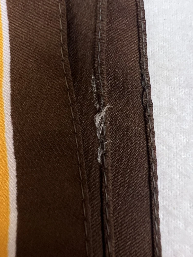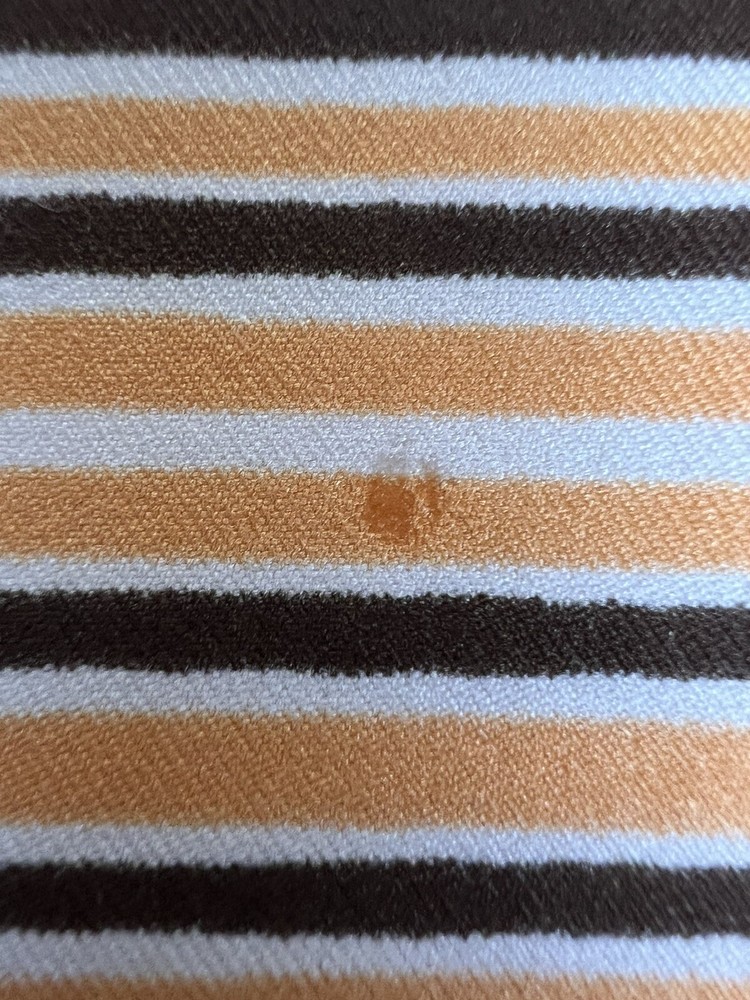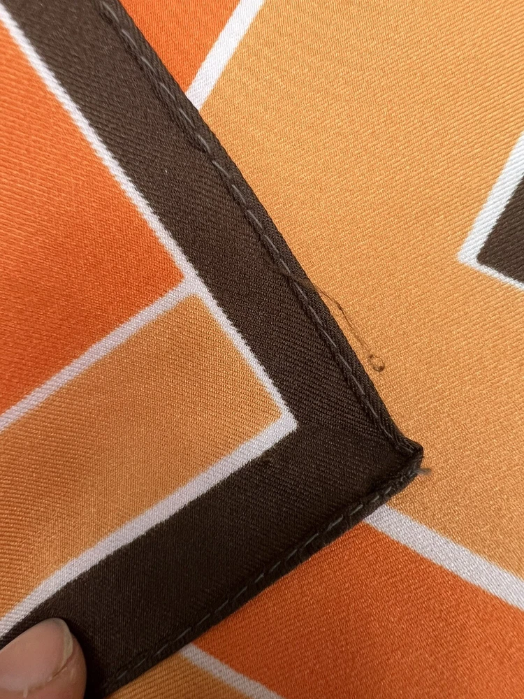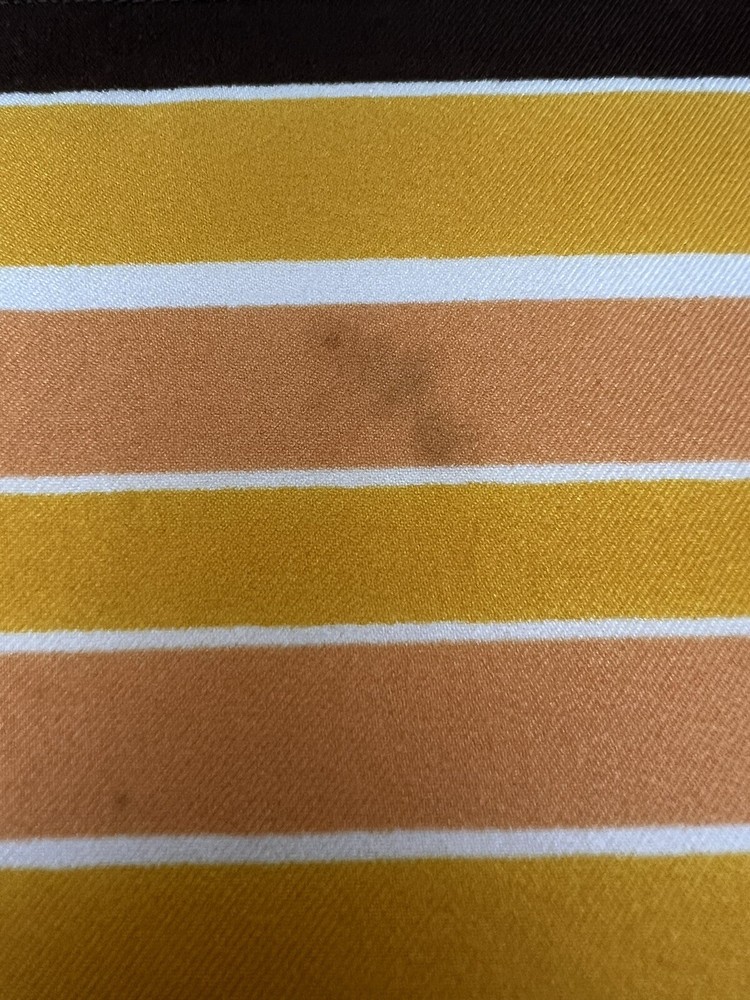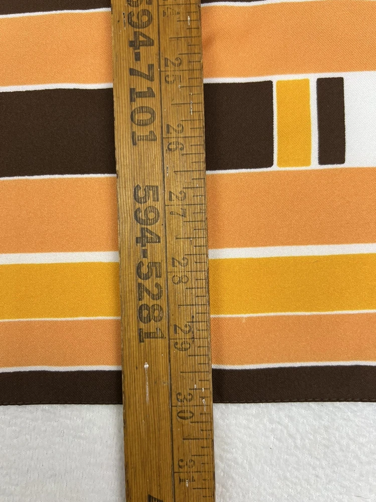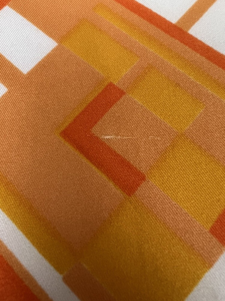 Vintage 1960’s 1970’s Geometric Mid Century Boho Scarf Brown Orange Gold 30 3/4" 30 3/4" x 30" 1.5 oz Gorgeous vintage likely polyester scarf. This looks late mid century or even early 1980's with it's warm gold, brown, orange, and white geometric squares and lines. Its a nice size that it could be used for hair, or around the neck. There is a pull, a couple of spots, and a tiny hole. All of these aren't very obvious upon first glance. Please see pictures for condition detail.
