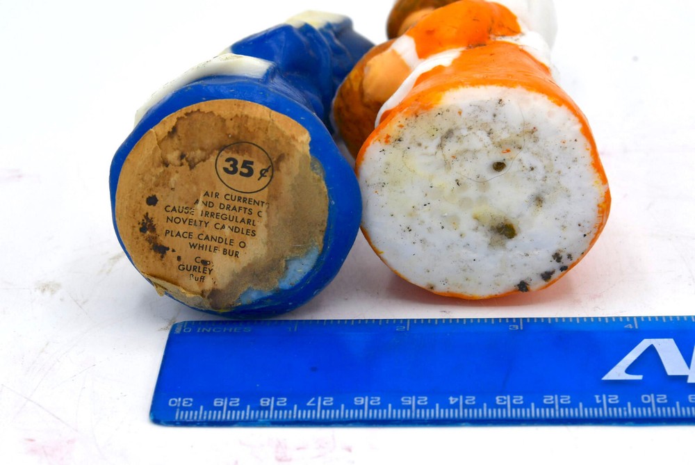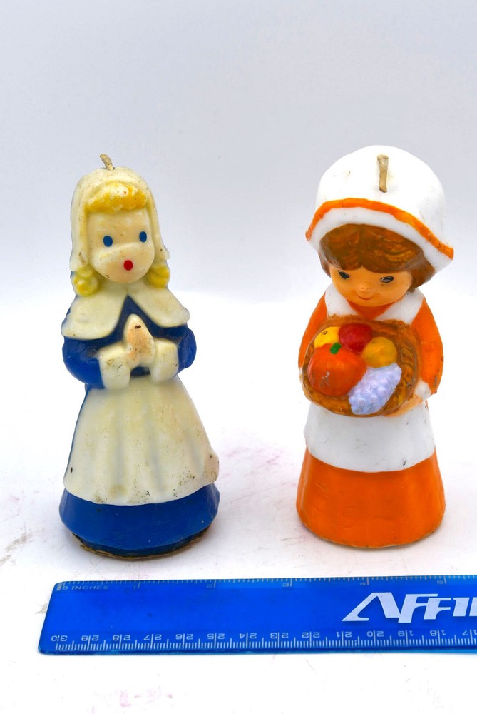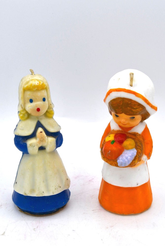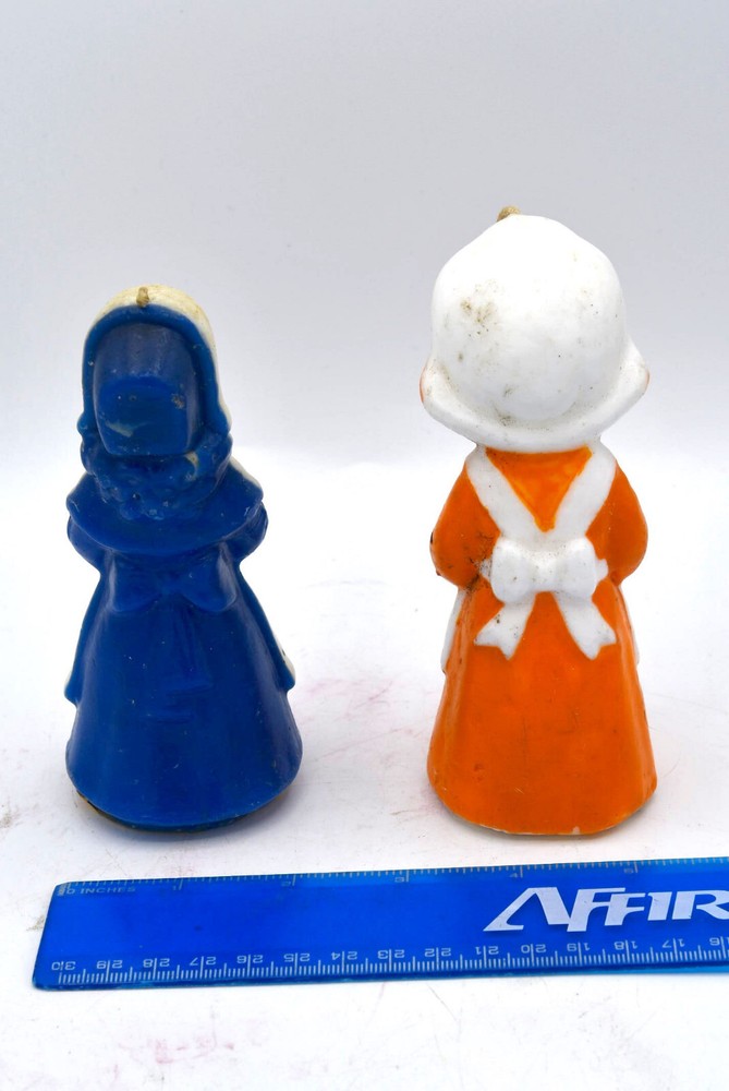 Two cute candles, 1 blue pilgrim girl by Gurley and 1 orange pilgrim girl with no manufacturer's label....
