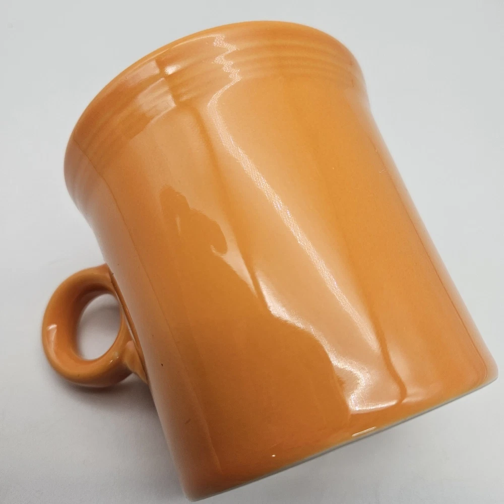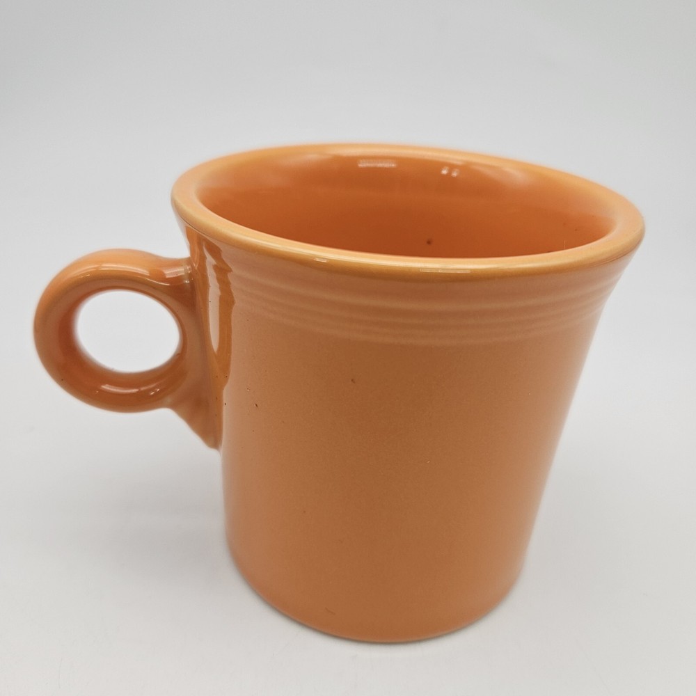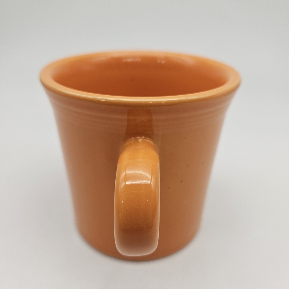 Vintage Fiesta mug in tangerine orange. It has a Tom and Jerry style handle. No chips, cracks, or crazing. Nicely glazed. 3 1/2 inches tall, 3 1/2 inches in diameter, 4 3/4 inches from rim to handle, and 14 ounces in weight. Great mid century modern mug!