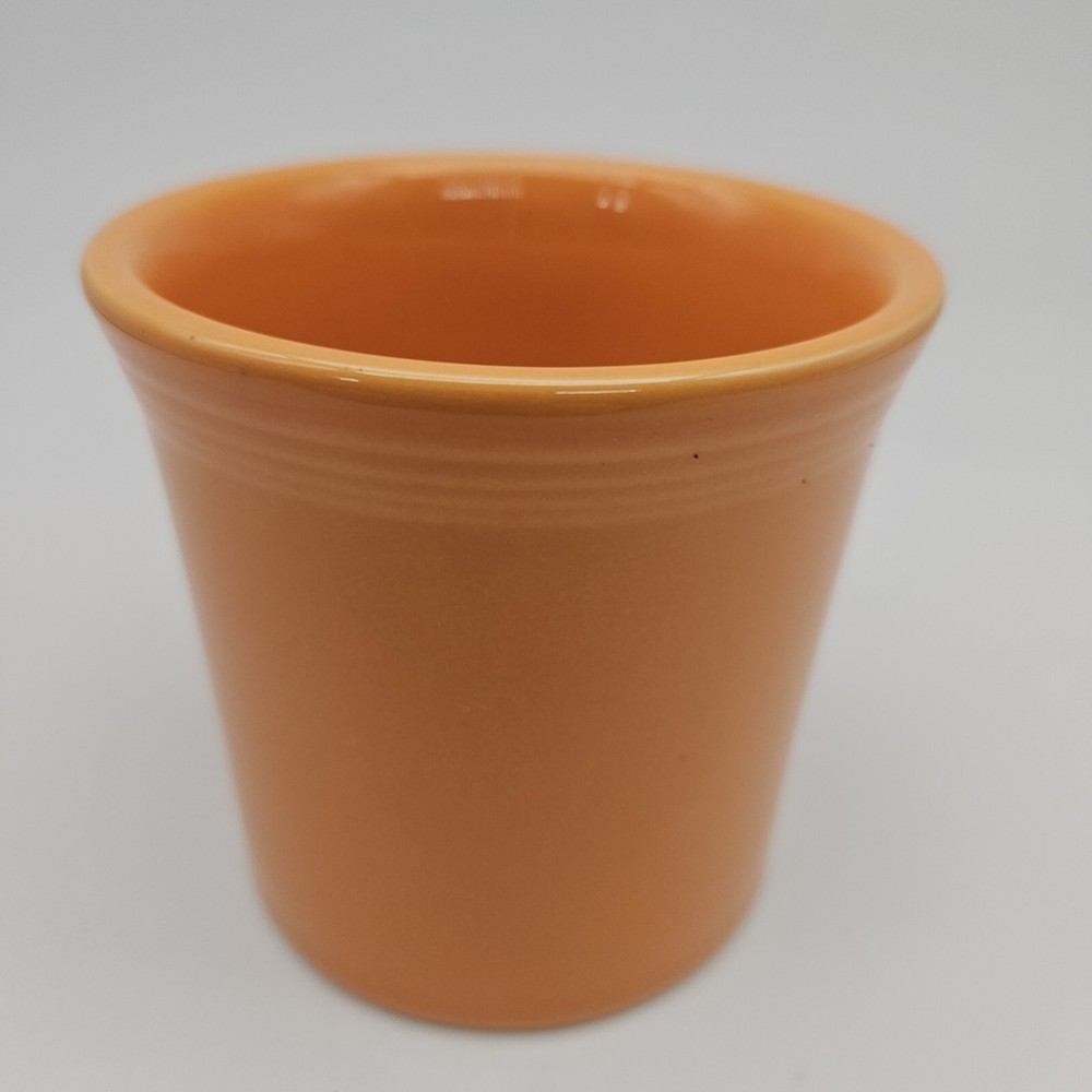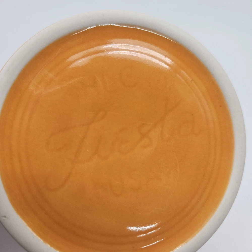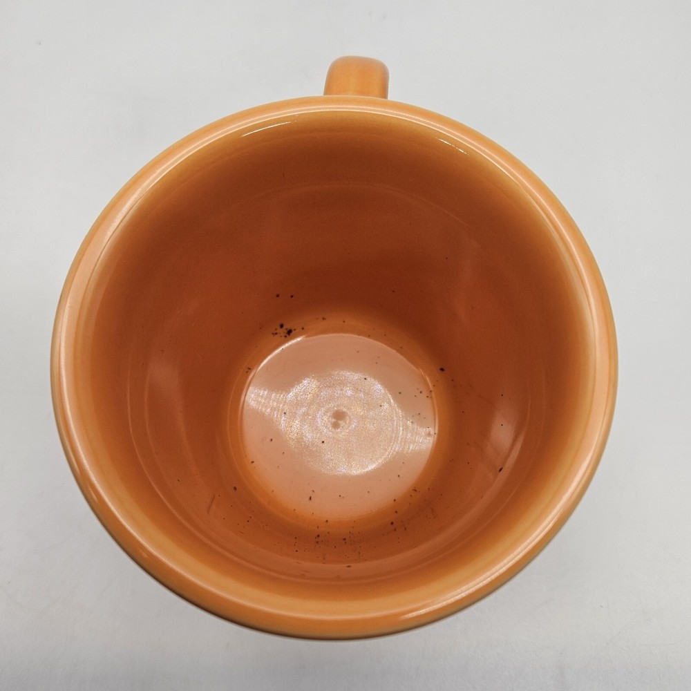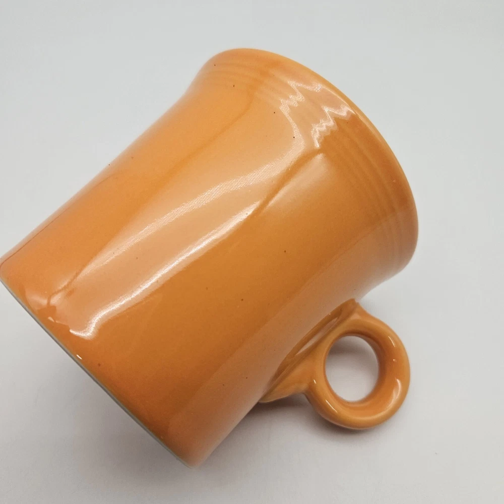 Vintage Fiesta mug in tangerine orange. It has a Tom and Jerry style handle. No chips, cracks, or crazing. Nicely glazed. 3 1/2 inches tall, 3 1/2 inches in diameter, 4 3/4 inches from rim to handle, and 14 ounces in weight. Great mid century modern mug!
