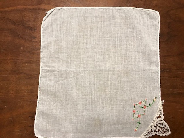 Beautiful Vintage Handkerchief With Delicate Lace in a Corner with orange and green floral design; 9.5 in. square in size; Great condition