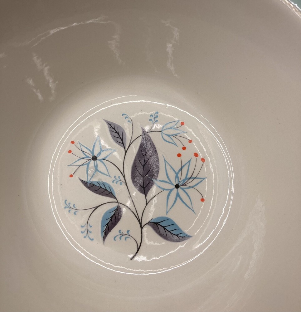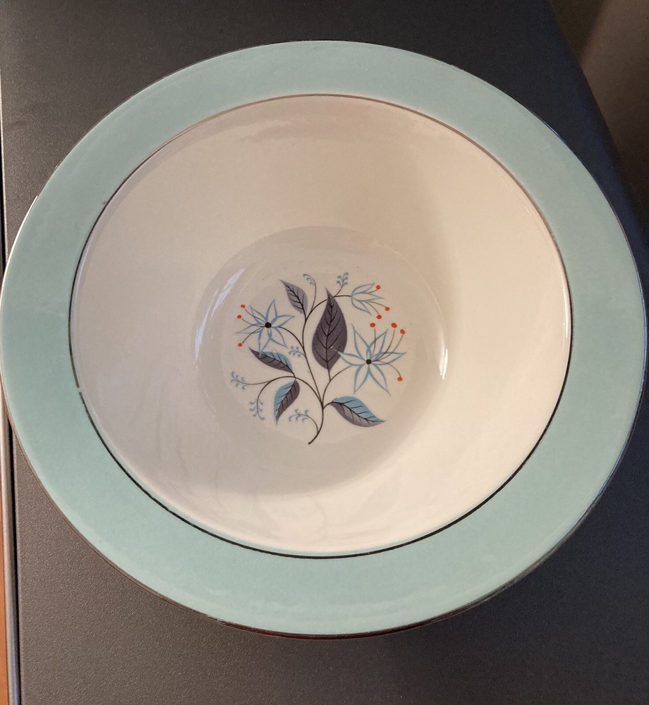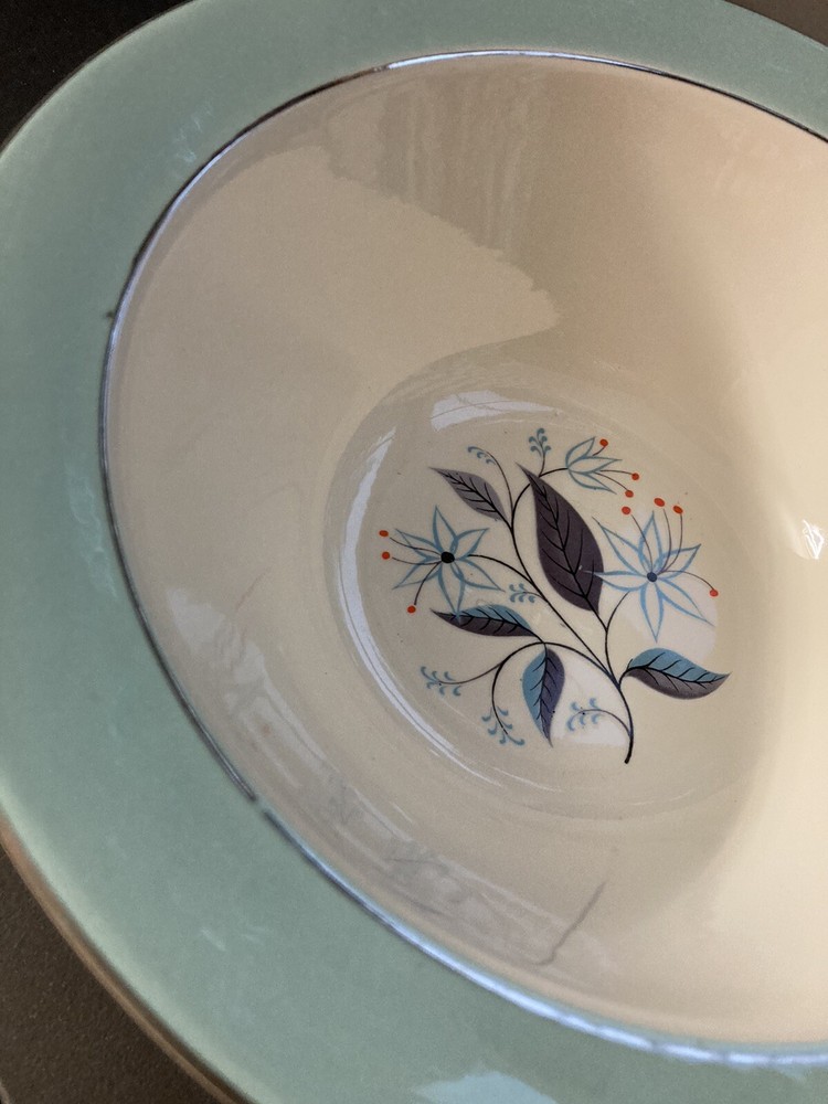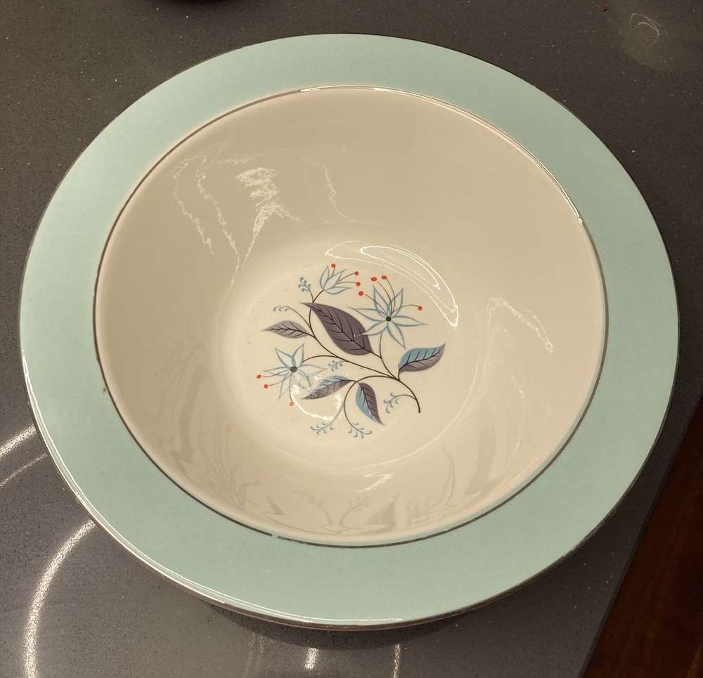 Harmony house “Dianne” serving bowl. Slight imperfection near platinum band, some slight wear to band. No chips or cracks. This pattern was also made by Homer Laughlin but the plates in this set (listed separately) have the HH stamp. Please note these are vintage and therefore not new. There may be age-related signs of wear including usage marks on bottoms, slight discoloration, utensil marks, etc. I strive to point out any major flaws such as cracks, chips, crazing or stains. Please look at photos carefully to assess condition. Please also note ground advantage shipping doesn’t include insurance, which I recommend. If you want to purchase insurance, please let me know; alternatively, priority includes this.