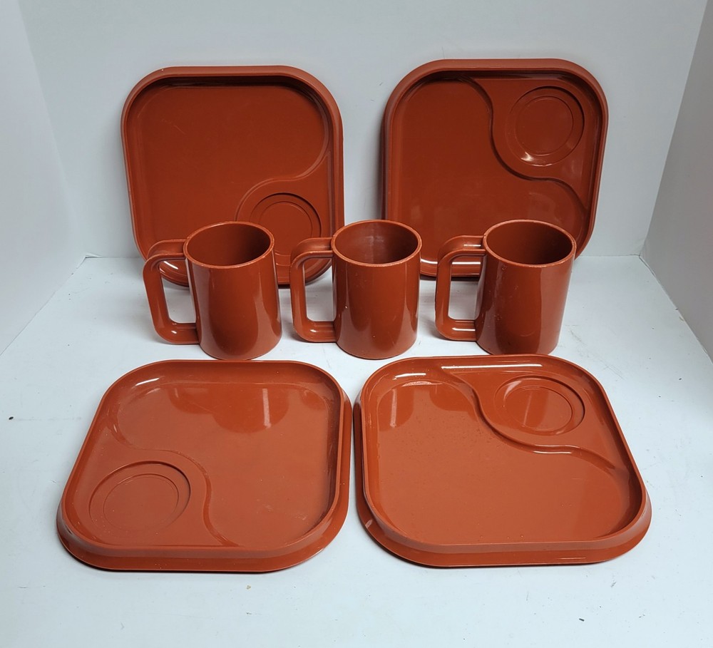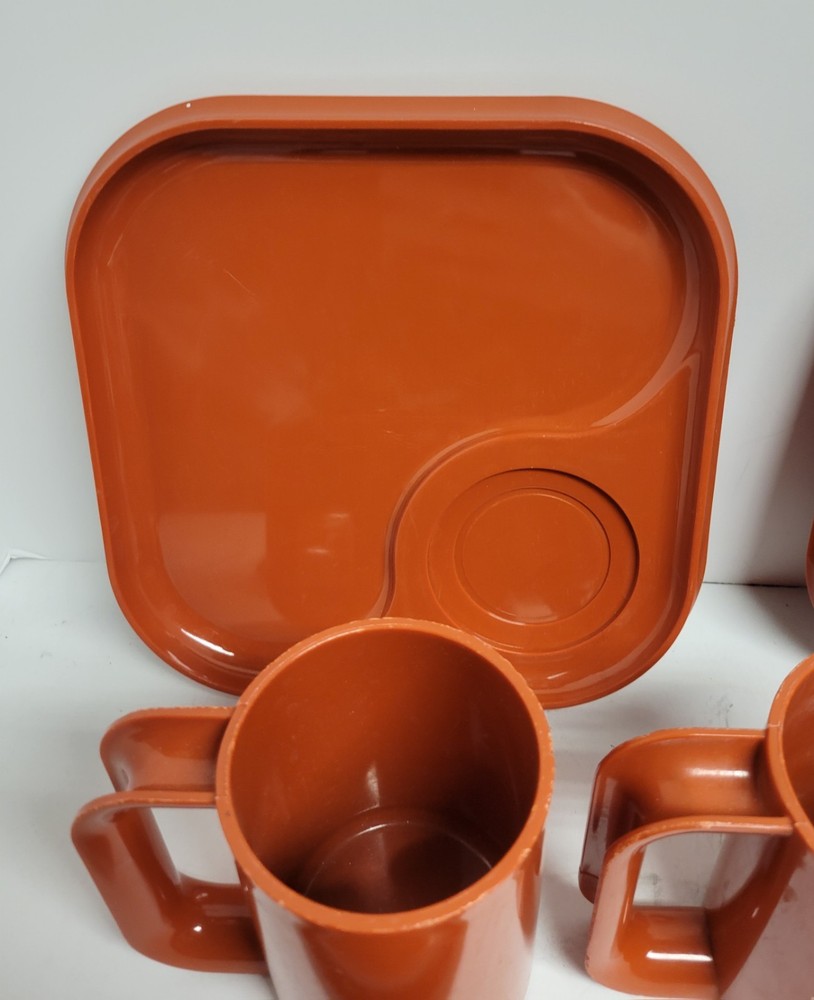 Listing of a lot of 7 vintage ingrid orange melamine serving plates and mugs. All in good vintage condition. The mugs show some roughness around the brim and the handle brim from normal use but nothin...