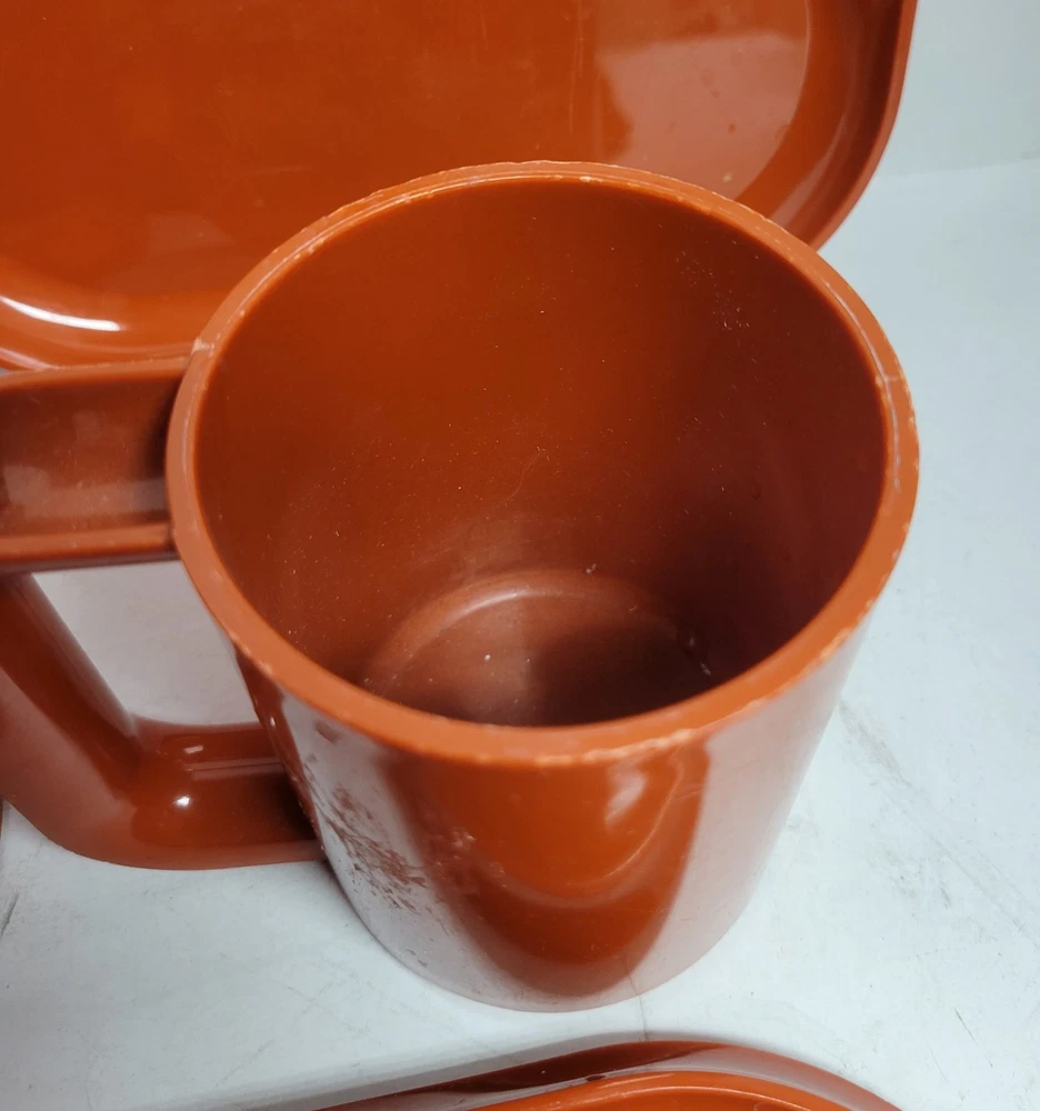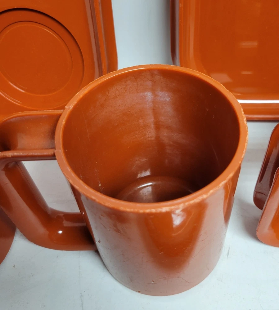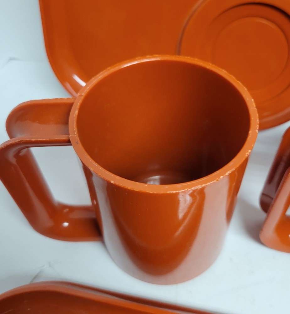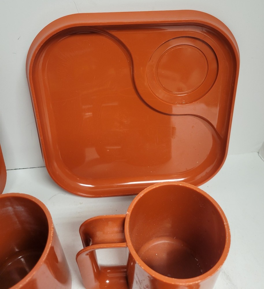 Listing of a lot of 7 vintage ingrid orange melamine serving plates and mugs. All in good vintage condition. The mugs show some roughness around the brim and the handle brim from normal use but nothing major. You are recieving everything