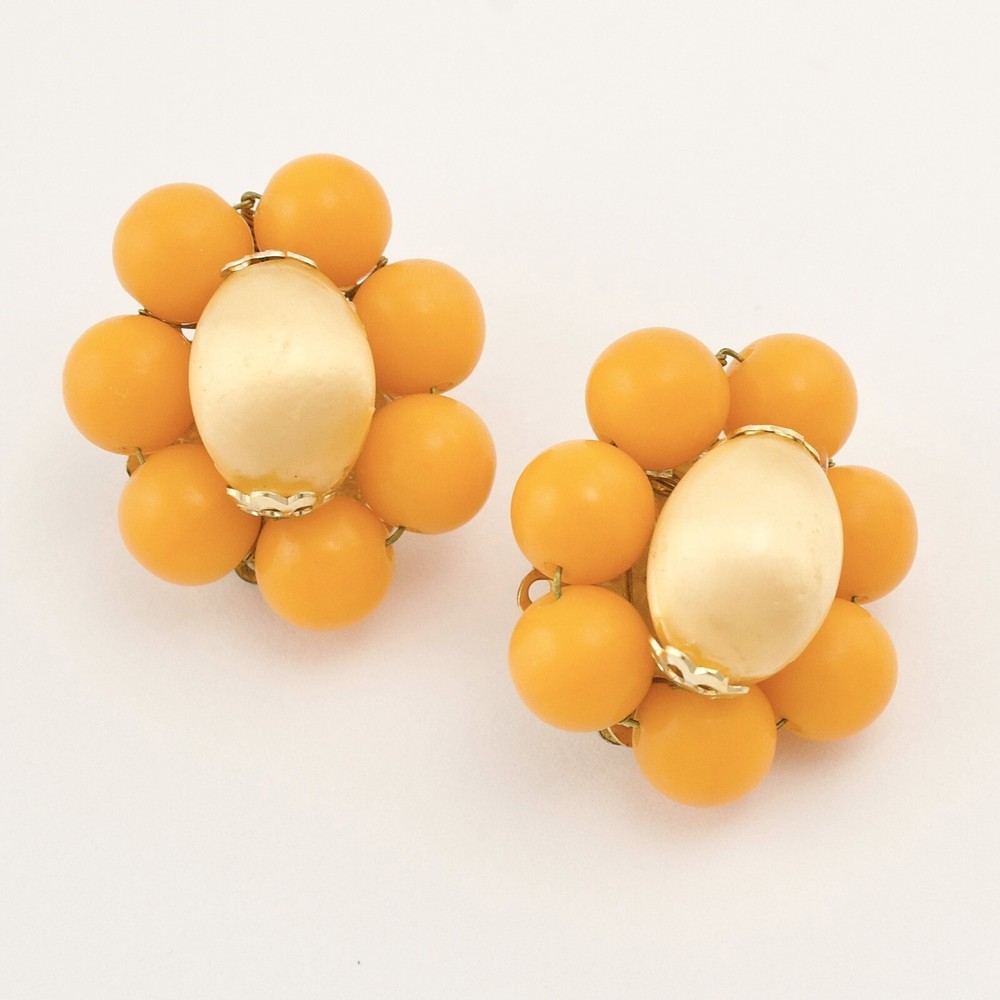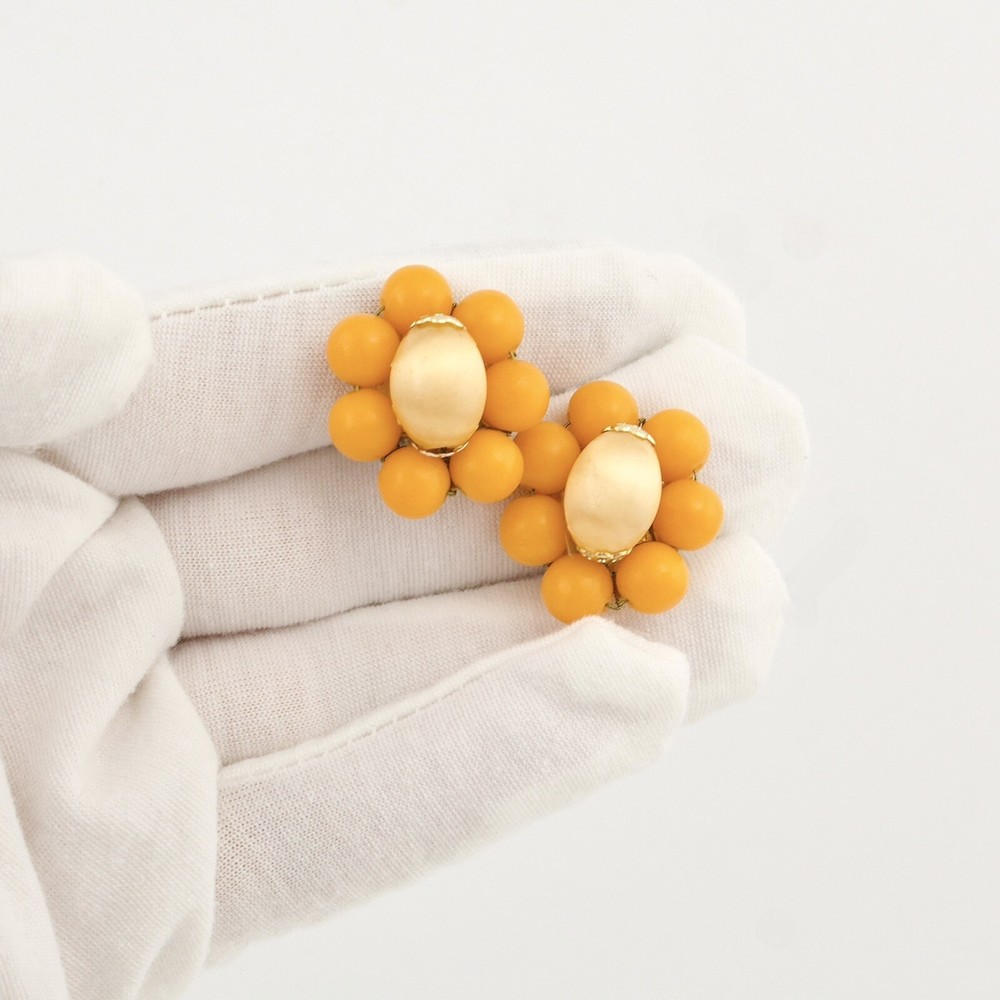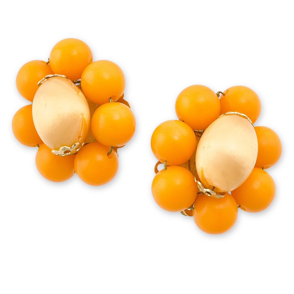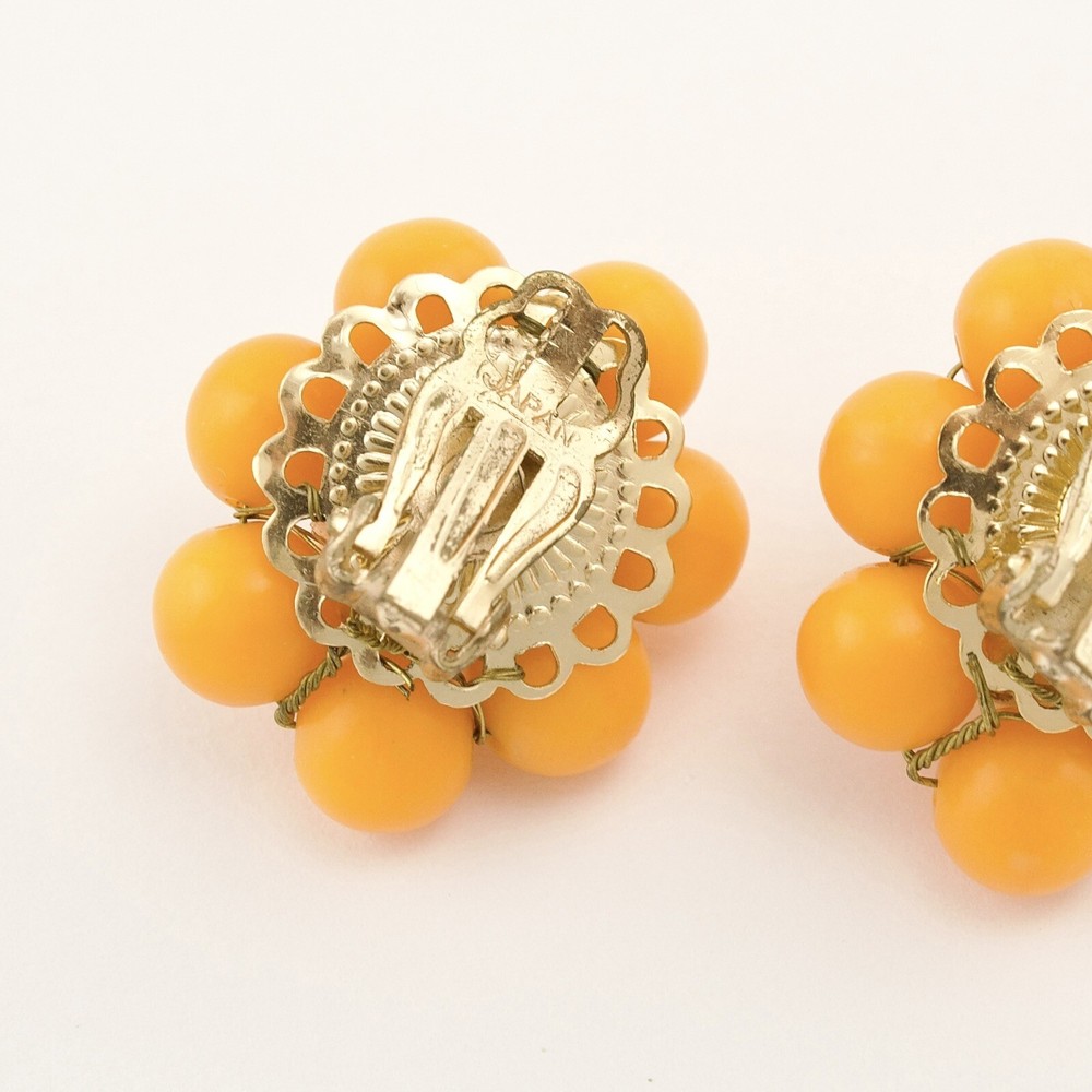 Vintage Japan beaded clip on earrings. Acquired from a private estate collection, these mid-century modern beaded earrings feature a silk wrapped focal bead with a pale yellow-orange creamsicle color surrounded by vibrant orange lucite beads. Signed Japan on clips. A fun, colorful pair of Japanese earrings for non-pierced ears! 1” diameter. Great pre-owned condition with light surface wear commensurate with age.