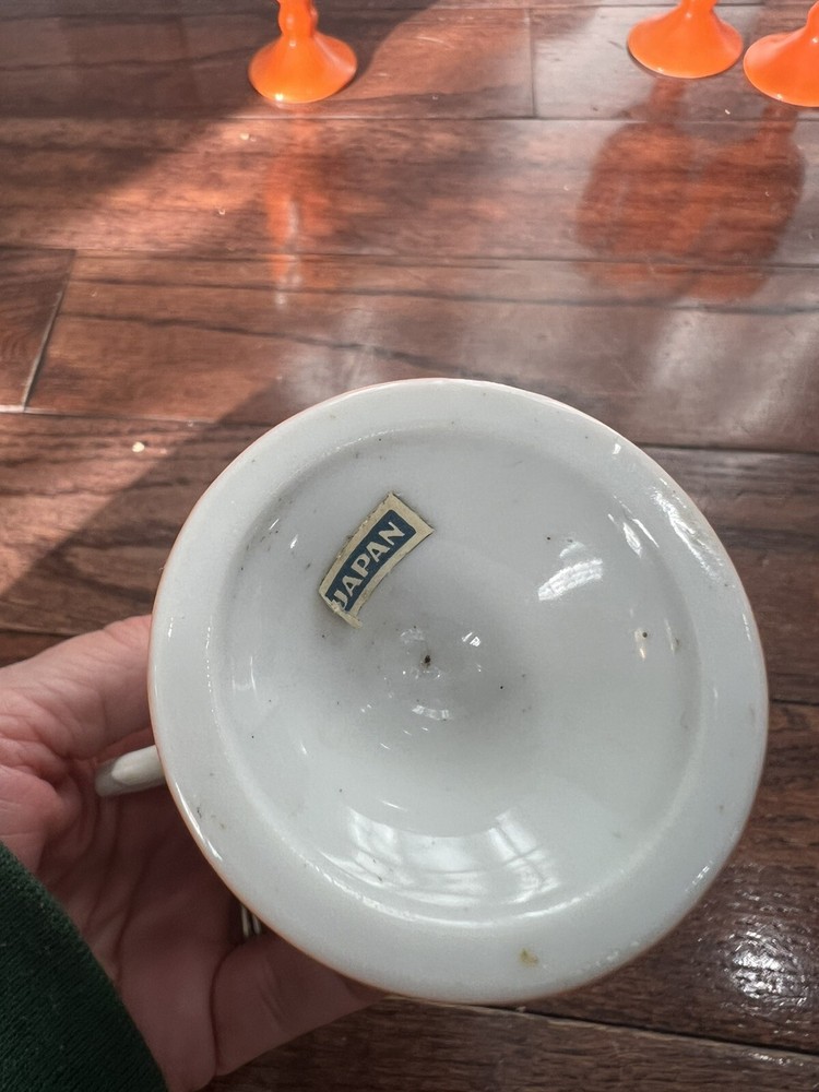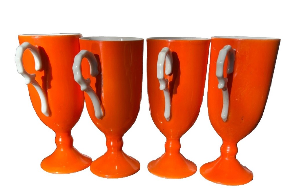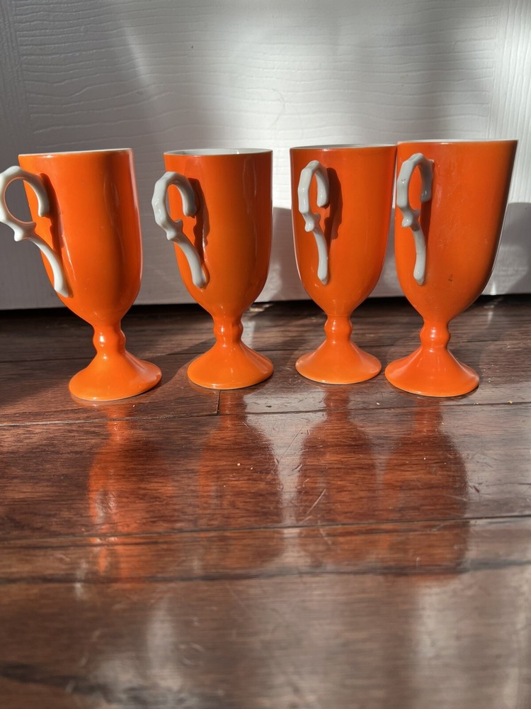 This vintage Japanese demitasse cups set of 4 features a Mid-Century Modern (MCM) design with a vibrant orange color, perfect for serving cappuccinos in style. These cups reflect Japanese culture and craftsmanship, making them a unique addition to any collection. Each cup is designed in a modern aesthetic that exudes elegance and sophistication, making them a standout piece for tea lovers or collectors of Asian-inspired decor. They are 4.5” tall and have some minor paint loss. One cup appears to have had a handle repair but you have to look very closely to see it.