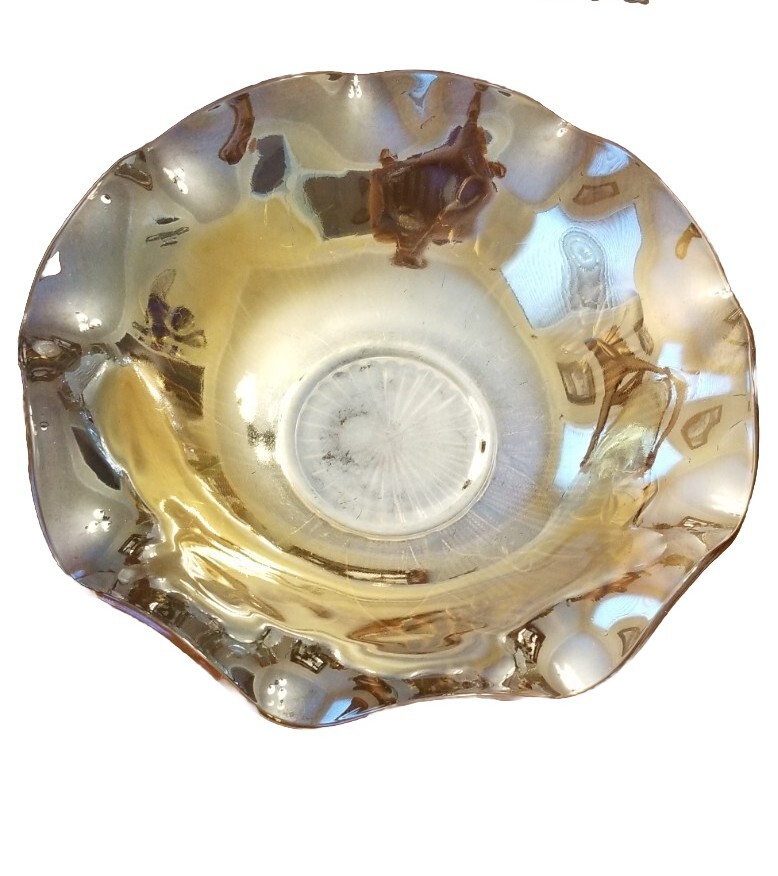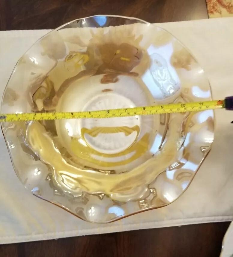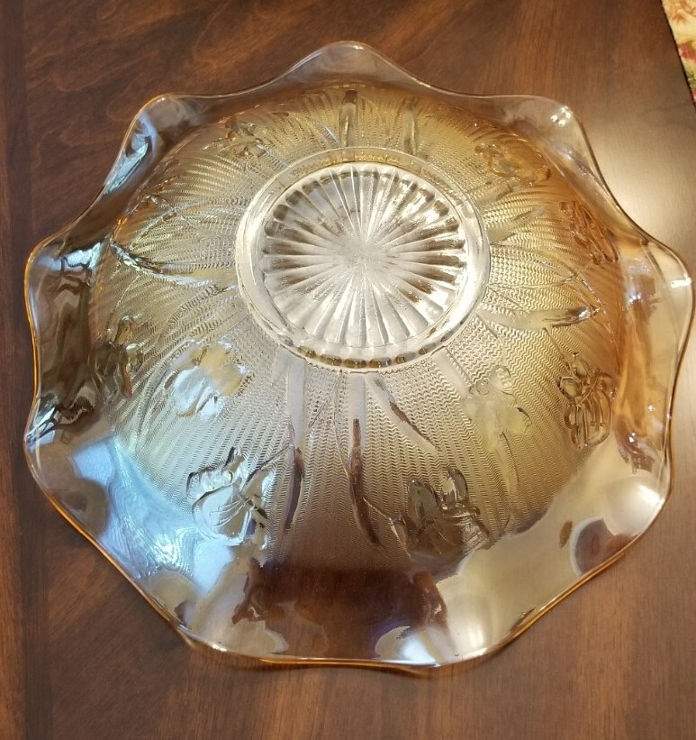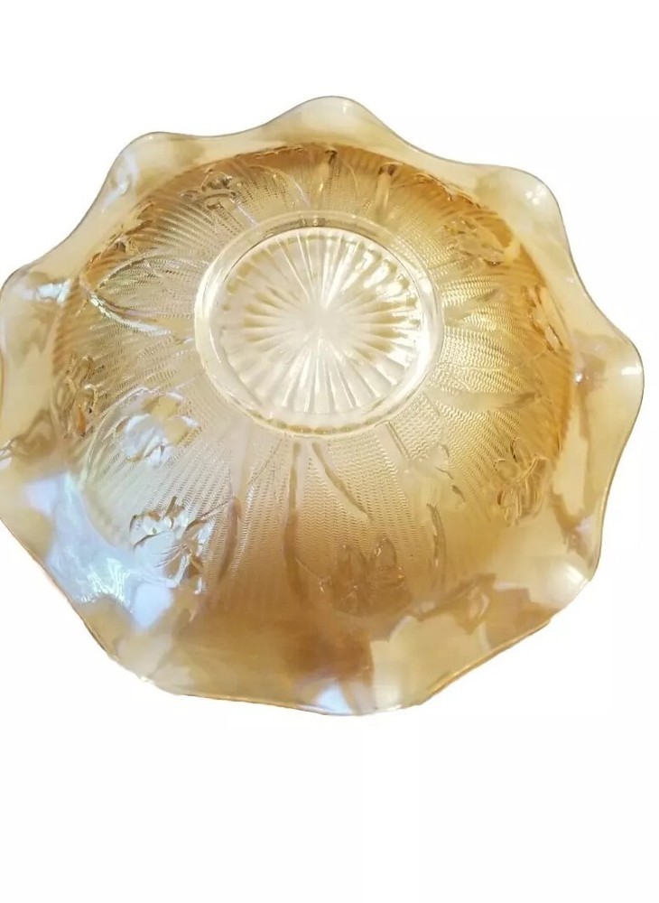 Add a touch of mid-century modern to your collection with this vintage Jeanette bowl. The 11.5" round bowl features an etched, iridescent finish with a beautiful flower theme. The carnival glass production style and fused glass production technique make it a unique addition to your decorative cookware, dinnerware, and serveware. This original, vintage bowl is perfect for all occasions and will make a great addition to any collection. The bowl is made of glass and has a depth of 2.75". It is a great piece for those who appreciate the beauty of vintage items and want to add a touch of American-made glass to their collection. Very good condition, no chips or cracks, very minor scratches to inside bottom of bowl.