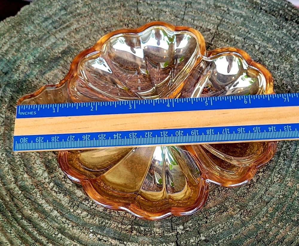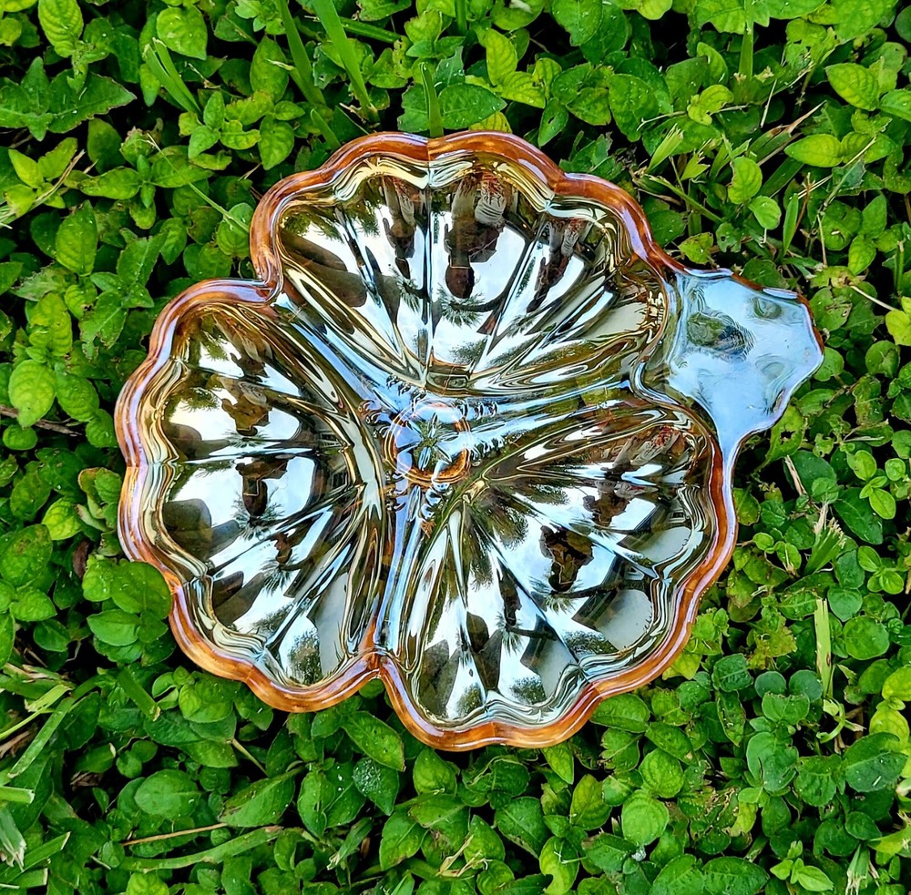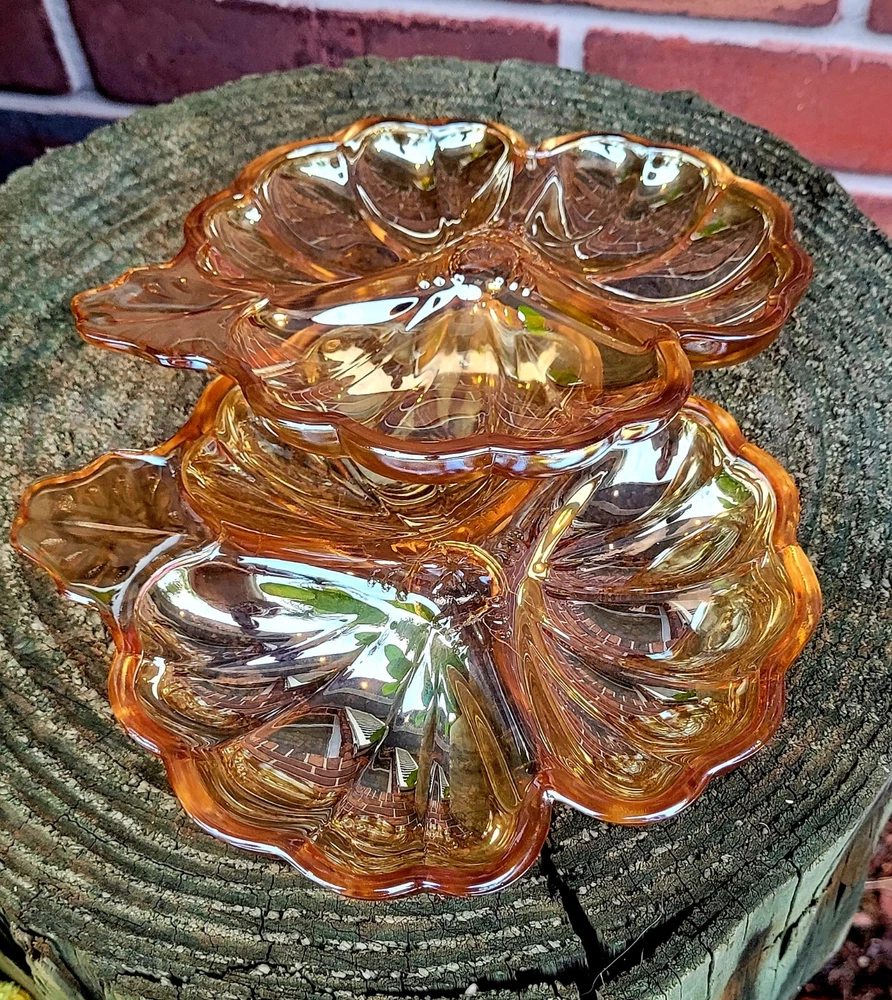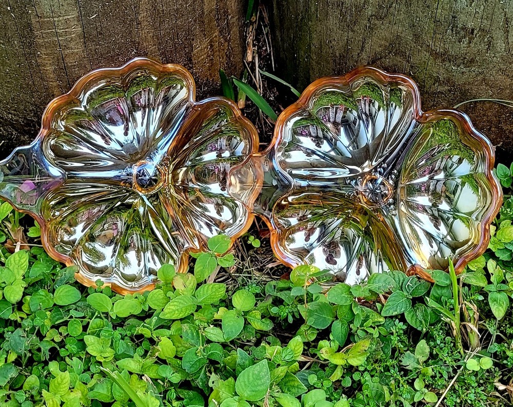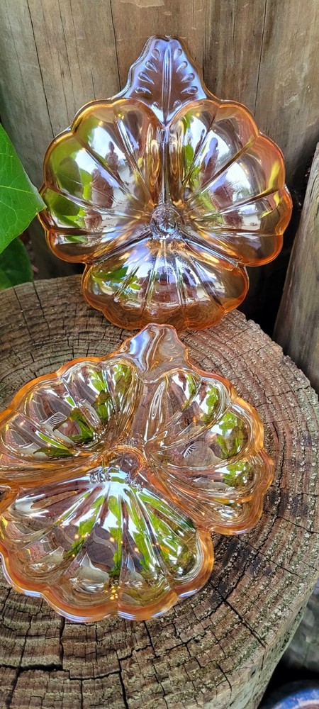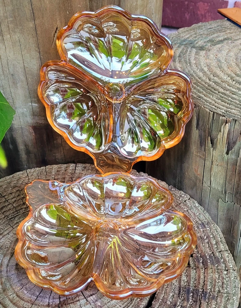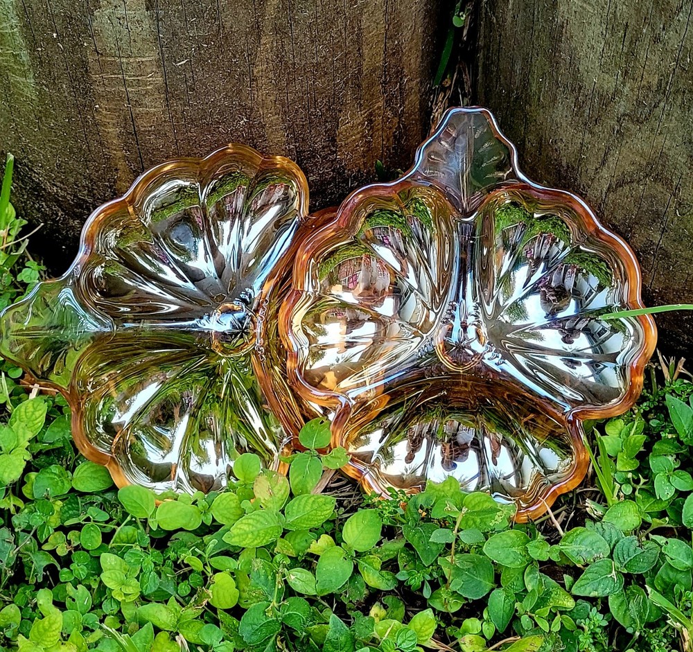 This vintage candy dish from the Jeanette Glass Company is a beautiful addition to any collection. The clover shape and iridescent marigold color make it a unique piece that is sure to catch the eye. Made of high-quality glass, it is a durable and timeless item that will last for years to come. The dish is perfect for holding small candies or trinkets, and its mid-century modern style adds an elegant touch to any room. Add this piece to your collection today and enjoy its beauty for years to come. Mid Century modern vintage Jeannette Glass Doric Iridescent Marigold Carnival 3 part clover shape candy dish, X2 Beautiful . Made in USA in 1965. Excellent condition, no chips or cracks. Each dish measures approximately 6 1/4" x 7 1/8". See pictures for details. Bundle discounts available on combined choices, see my other listings. Packed with expert care, see reviews. Gifting service available, please inquire. No returns on vintage, please ask questions. Reuse, save our planet, spare our landfills. Blessings from VINTAGE HABITAT. THANK YOU FOR YOUR INTEREST.