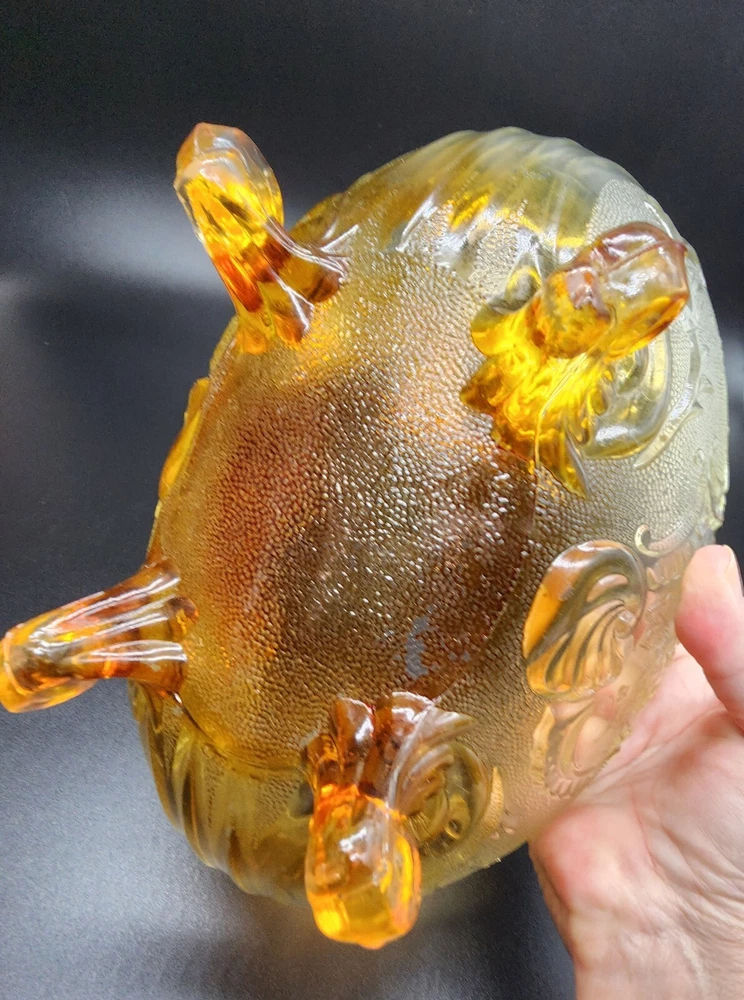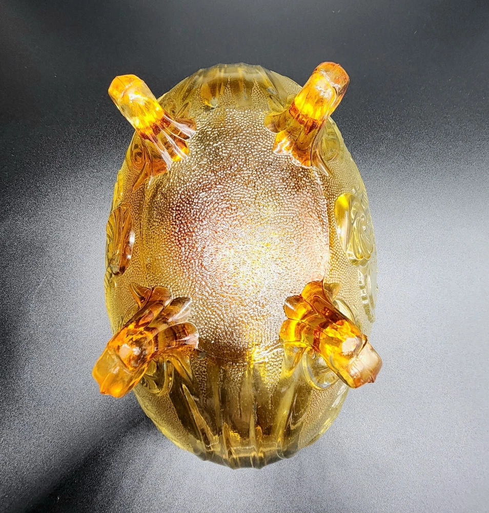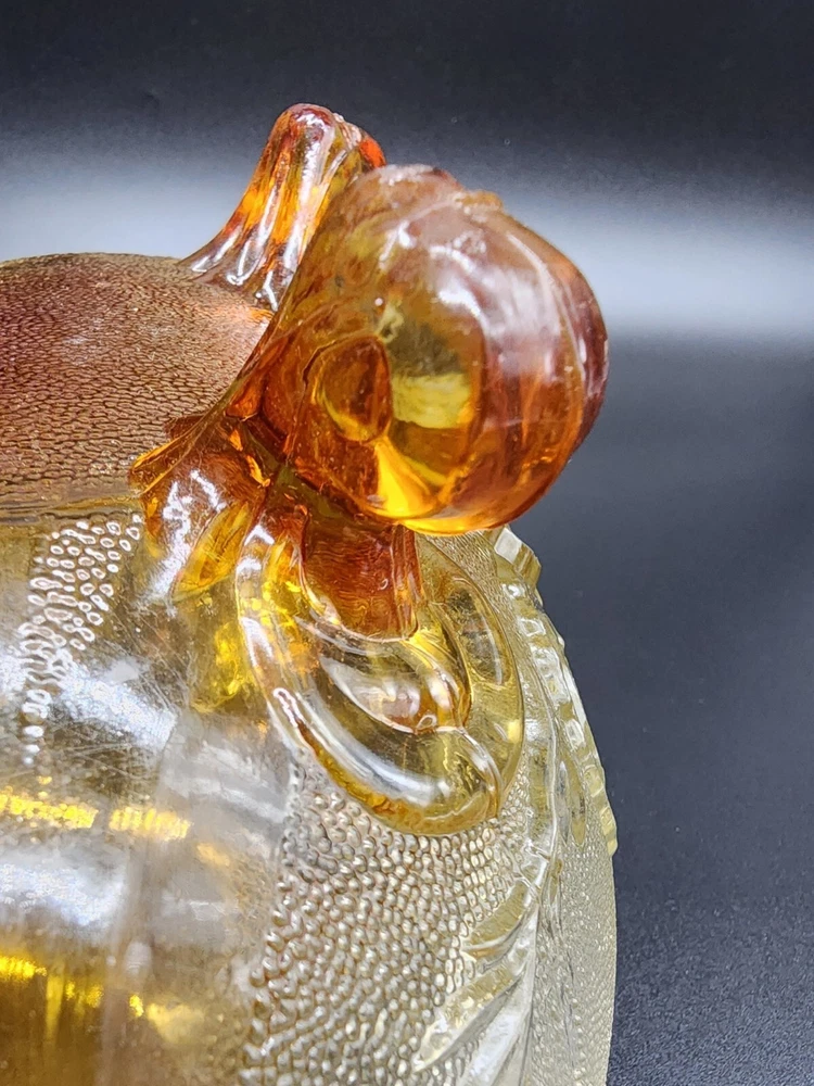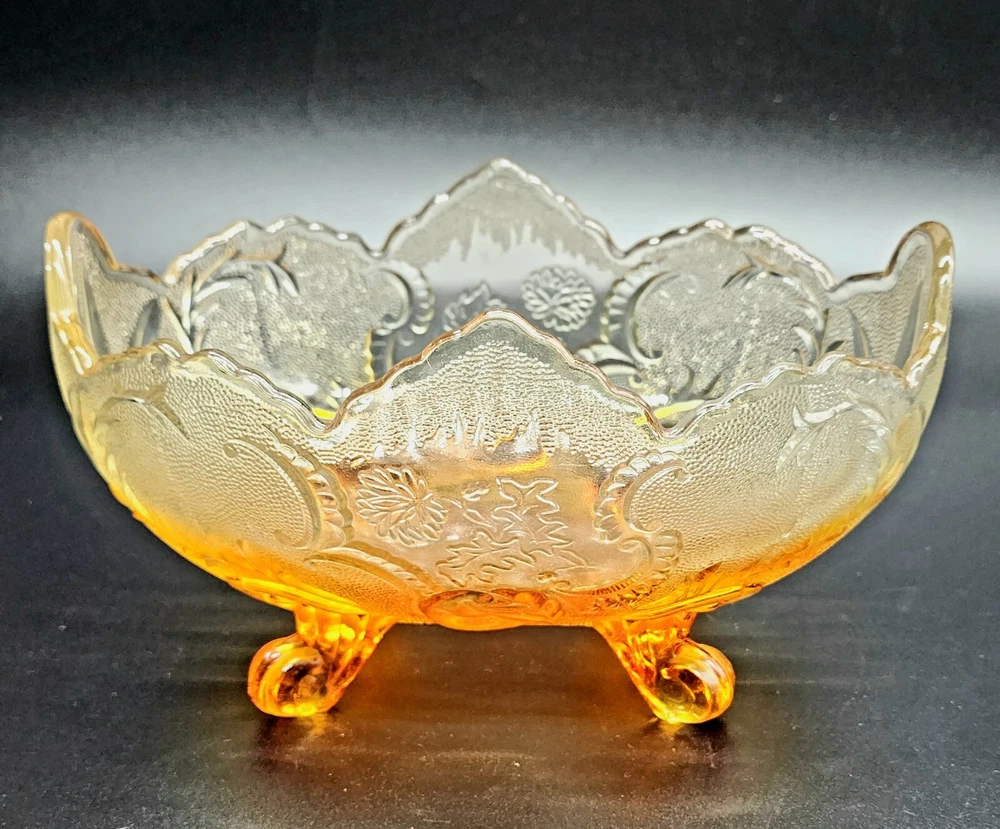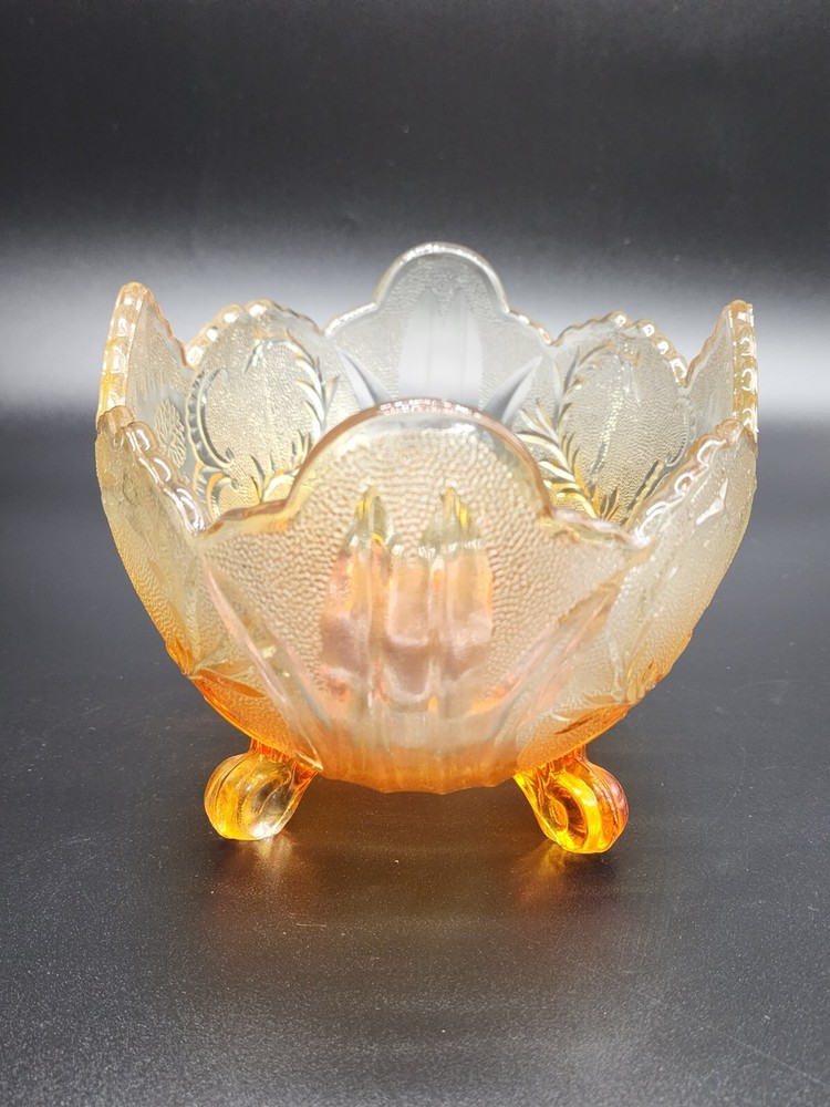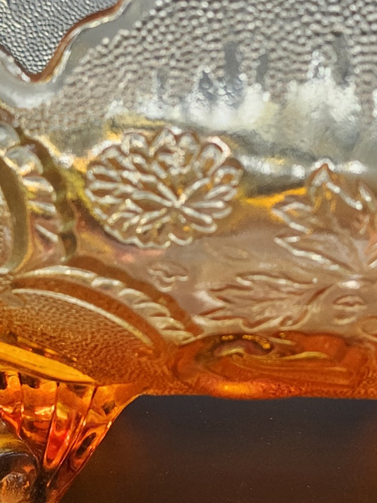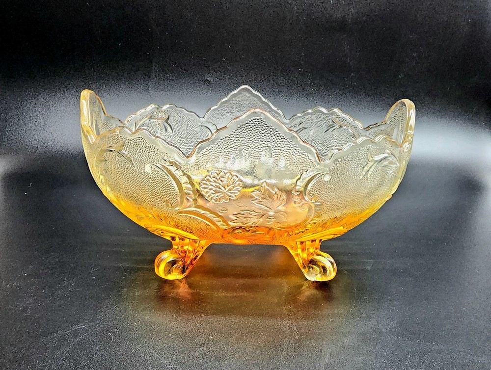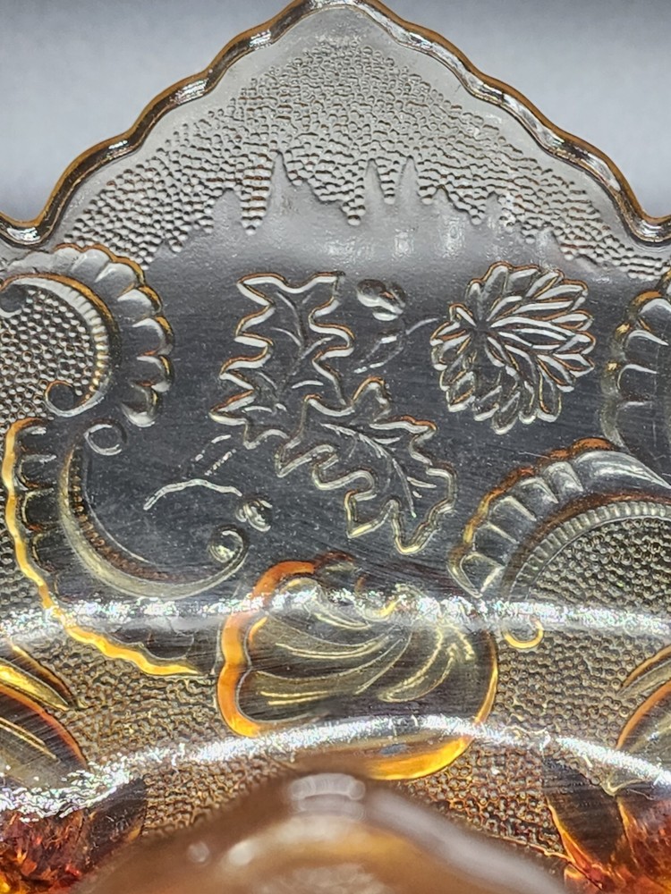 Vintage Jeanette Glass Flashed Marigold Footed Oval Bowl. Beautifully designed with an oak leaf pattern and zipper edge. In great condition without cracks or chips. Some flash coating on the bottom is worn. Please see photos for details and condition. DAC 461