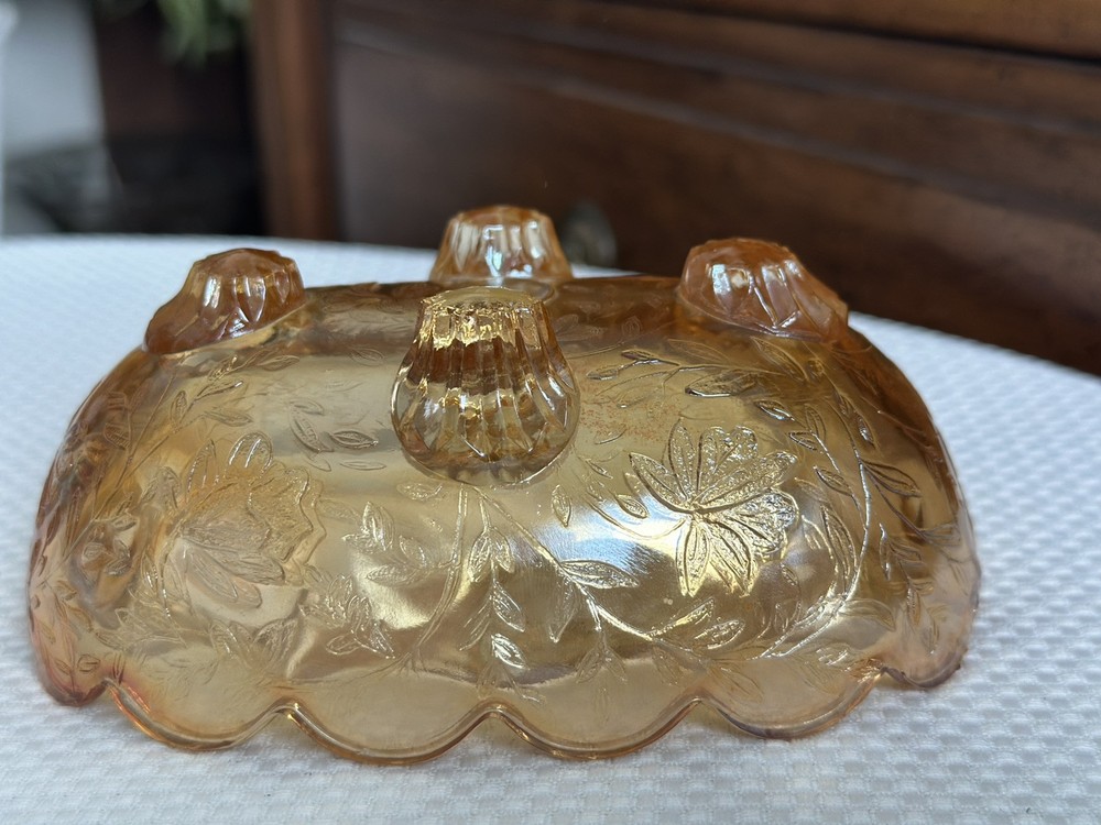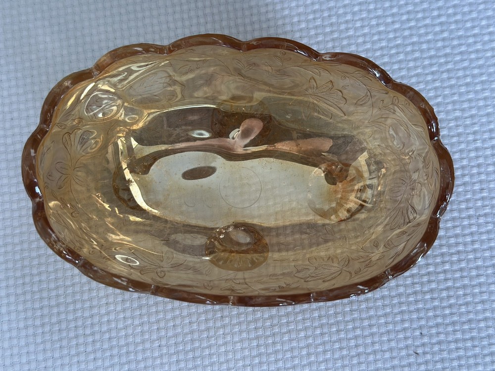 This vintage Jeannette Glass carnival glass bowl features the "Floragold-Louisa" pattern in Marigold Louisa/Orange color. Made in the mid-20th century (1940-1949) in the United States, this oval footed bowl is a part of the Carnival Glass product line. Measuring 5.5 inches in size, it showcases a glossy finish and a flower-themed design, reflecting the production style of fused glass commonly seen in vintage carnival glass pieces. This authentic original piece is a charming addition to any glassware collection.