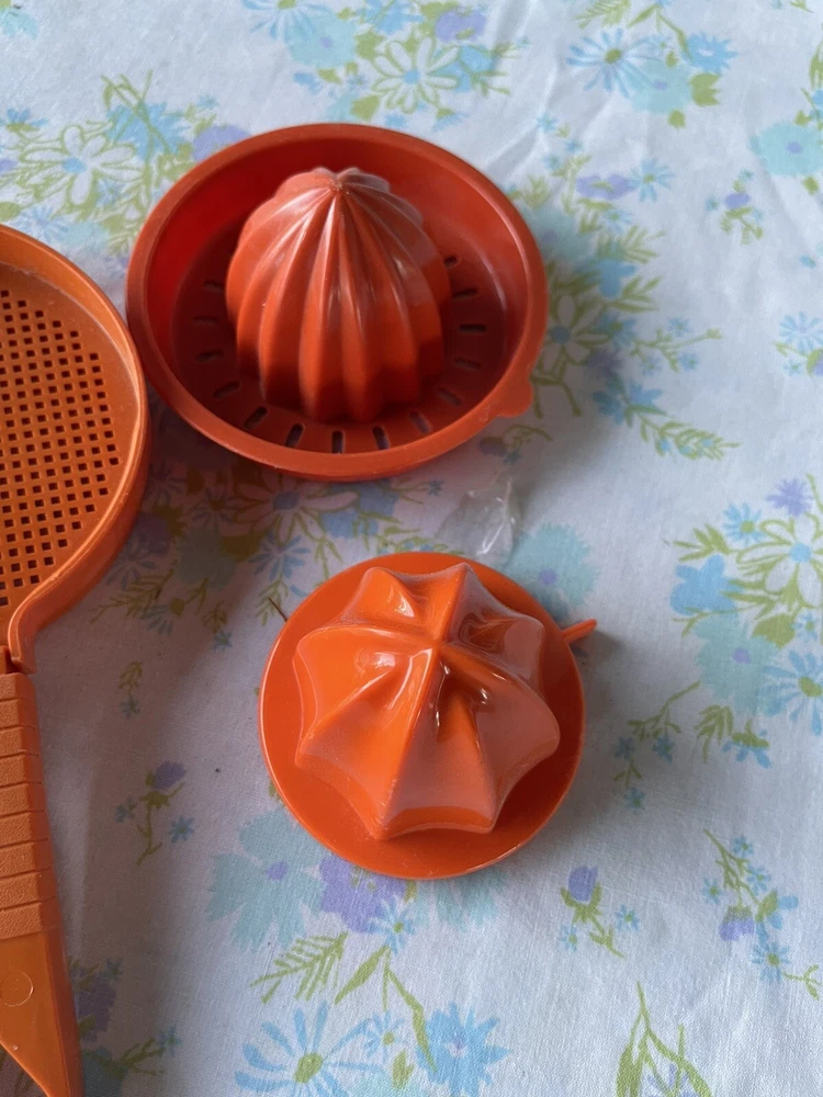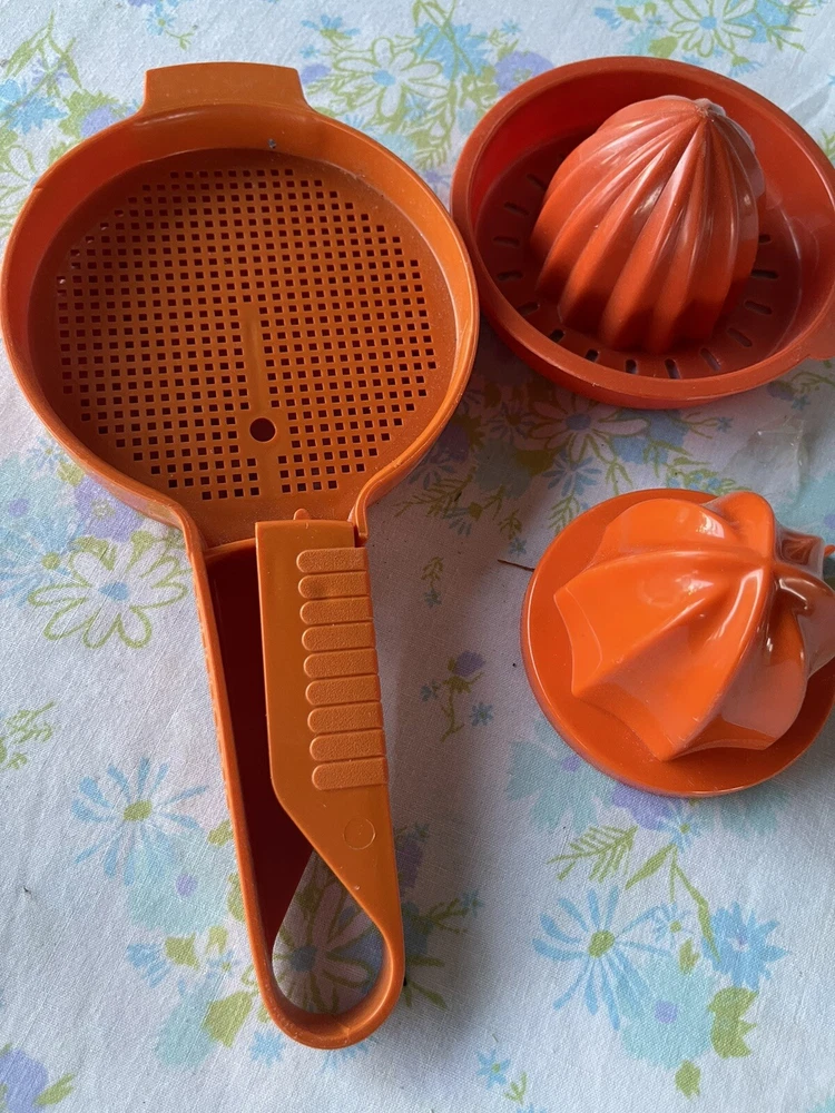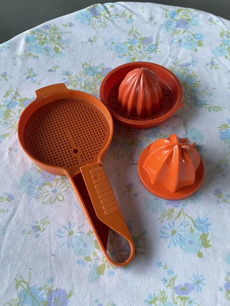 Vintage lot of three orange hard plastic kitchen gadgets. A Tupperware strainer looking piece and two juicer looking pieces....