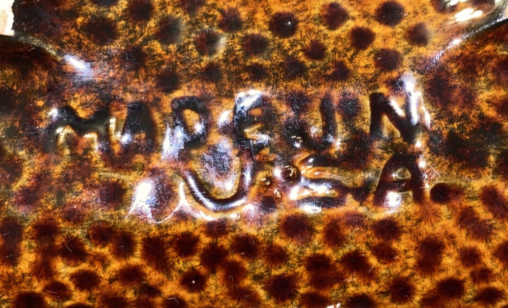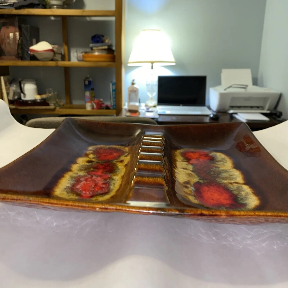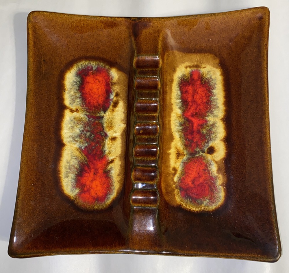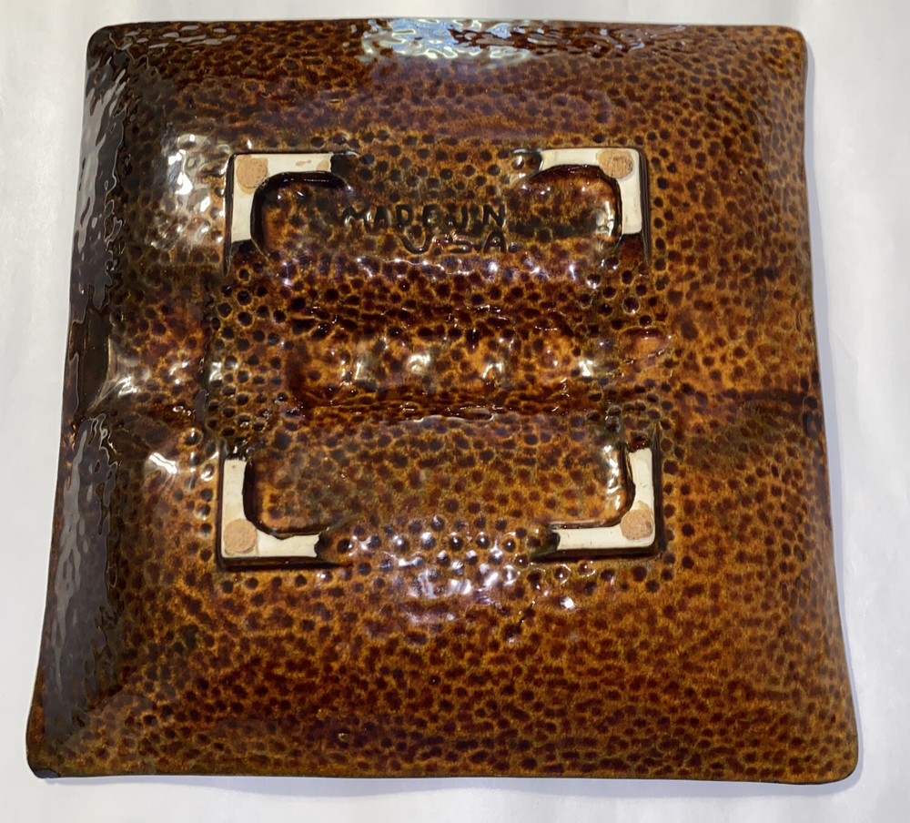 Vintage Large Square Orange Brown Glazed Ladder Ashtray 10 " Made in USA. Wonderful condition for its age. Can't see but can feel a slight chip on one corner on the bottom side. Underside has a brown spotted glaze with cork pads on feet. Very colorful oranges and browns. See pictures for details. I also have a smaller one listed if your interested. Measures 10" x 10" x 1.75" Please reach out with any questions. Upon payment the item with be carefully wrapped and shipped USPS Priority Mail to guarantee timely and insured shipping. International buyers are always welcome and will be shipped using the eBay global shipping platform.