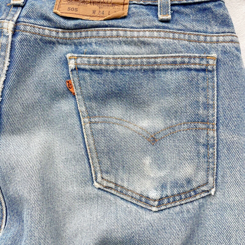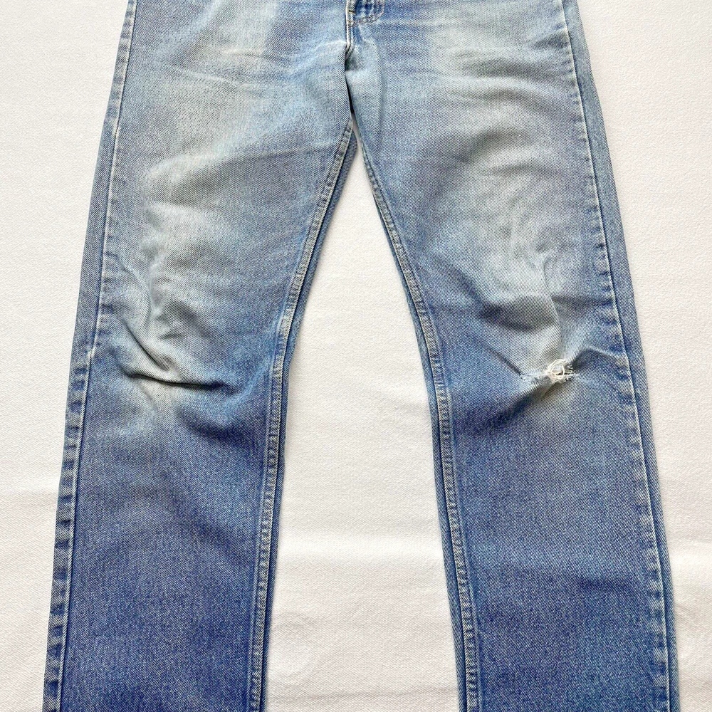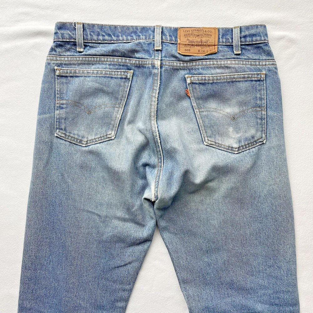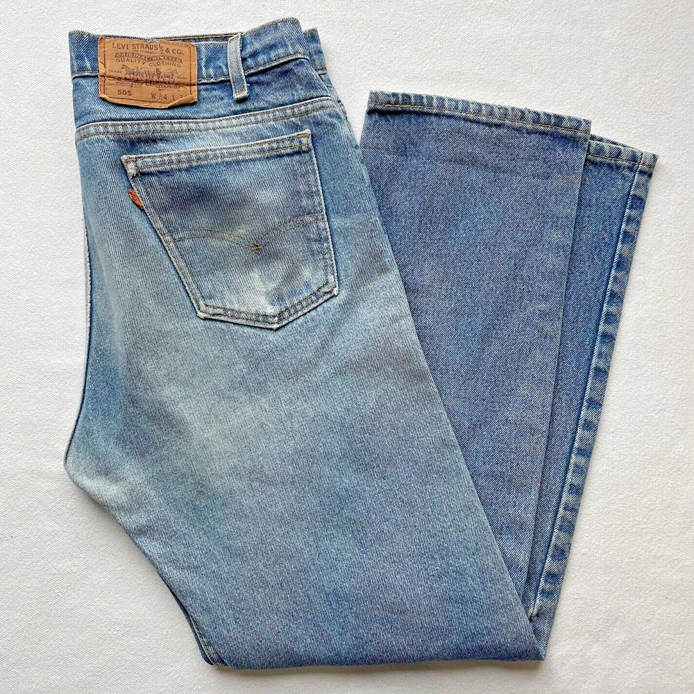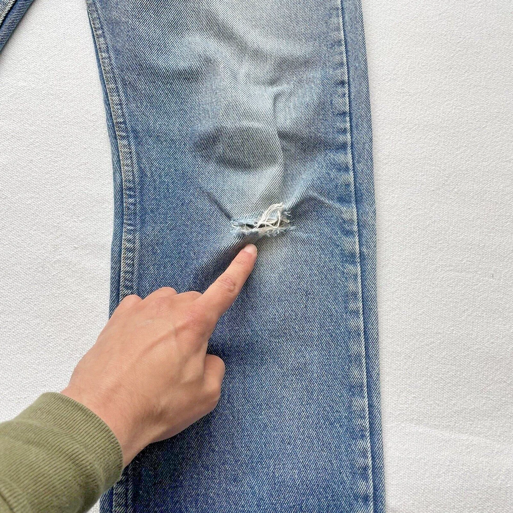 Vintage 1993 made in USA Levi’s 505. Relaxed straight- Beautiful fading and distressing. There are some small rips on knee and a tear forming in the crotch area. Lots of cool fading. Soft fabric from years of wear. See photos for details. Jeans fit size 33x28.5 See photos for details and measurements, or feel free to reach out directly if you have any questions or concerns. Will ship on next business day.