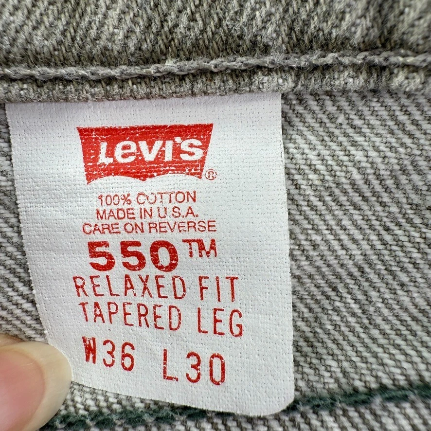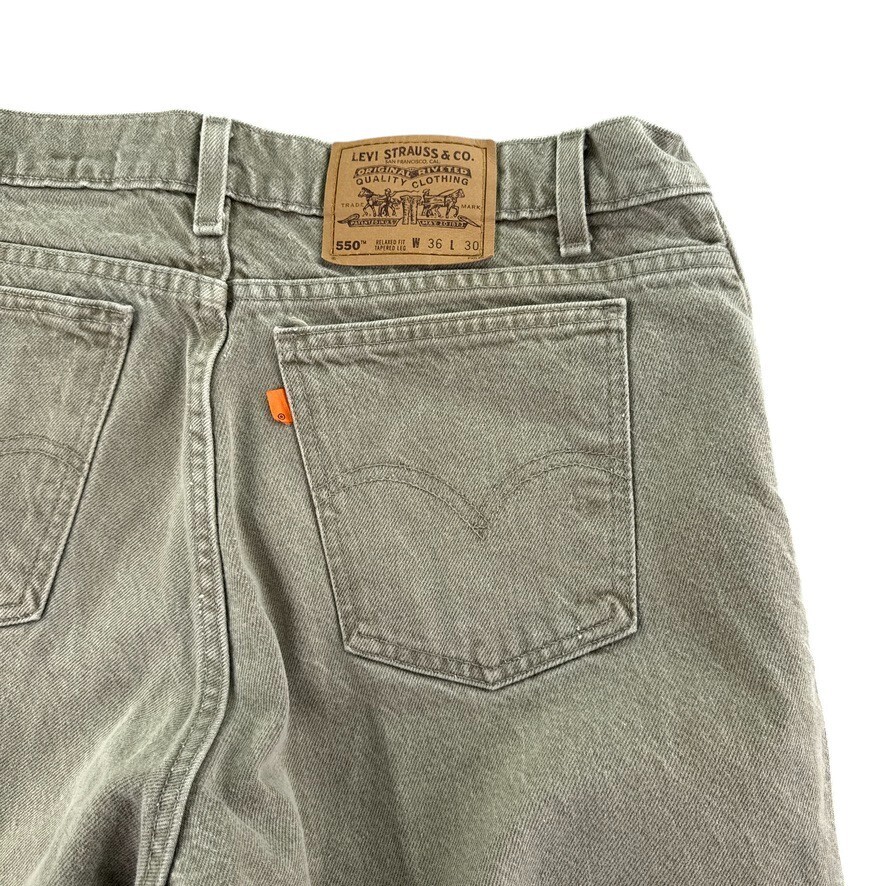 Vintage Levis 550 Jeans 36x30 (Fit 34x28) Relaxed Fit Orange Tab Grunge USA Made In good condition. Looks like pants legs were modified. Color seems to be a washed green. Clean and odor free. Please see all photos and measurements in photos. I ship items out every day Monday-Friday, so expect a quick delivery. Thanks!