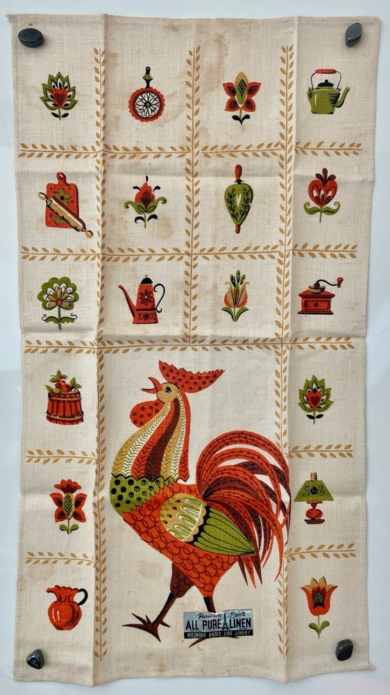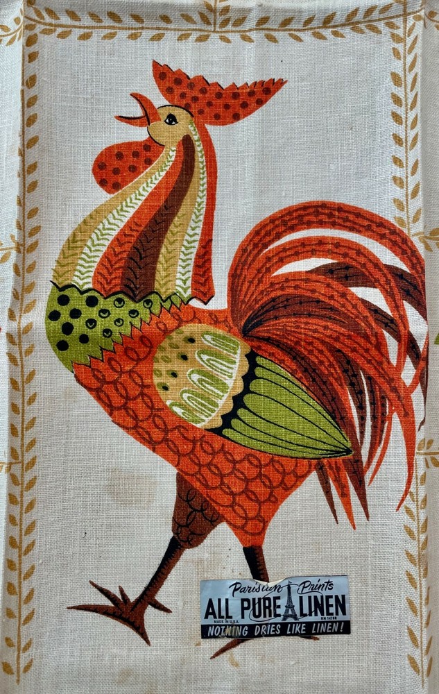 Vintage linen tea towel by Parisian Prints. This features an orange and green rooster in full plumage. He's surrounded by stylized flowers and kitchen implements, all inside a gold leaf grid. This measures 16" x 28". It is great condition with some expected age spots. We didn't try to clean it. This is new old stock, unused, with the original folds and the silver foil label that says "Parisian Prints All Pure Linen, Made In U.S.A. RN 14788, Nothing Dries Like Linen!" The silver label has the remains of an old price tag; it should soak off easily if you like. Please see our photos as they are part of the description. It's good luck to have a chicken in the kitchen... bright cheer for that mid century kitchen, used for drying your vintage collection of china and glassware, or frame it! All of our items are sold "as is" so please contact us with any questions. We have lots of vintage things for your kitchen, please come visit our shop!