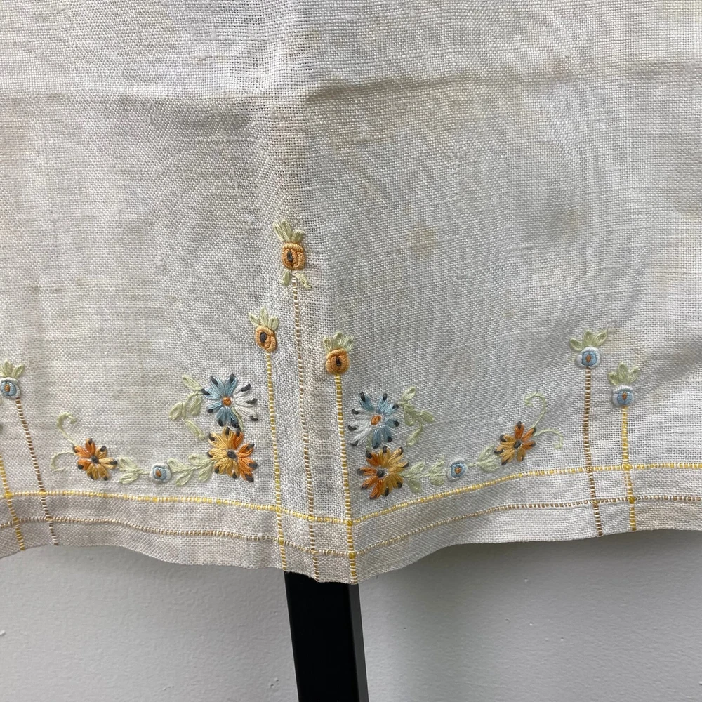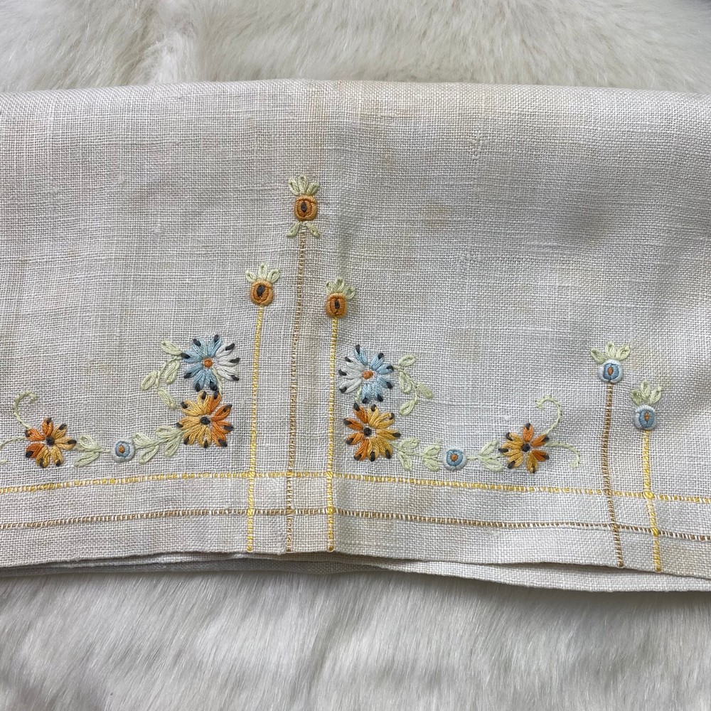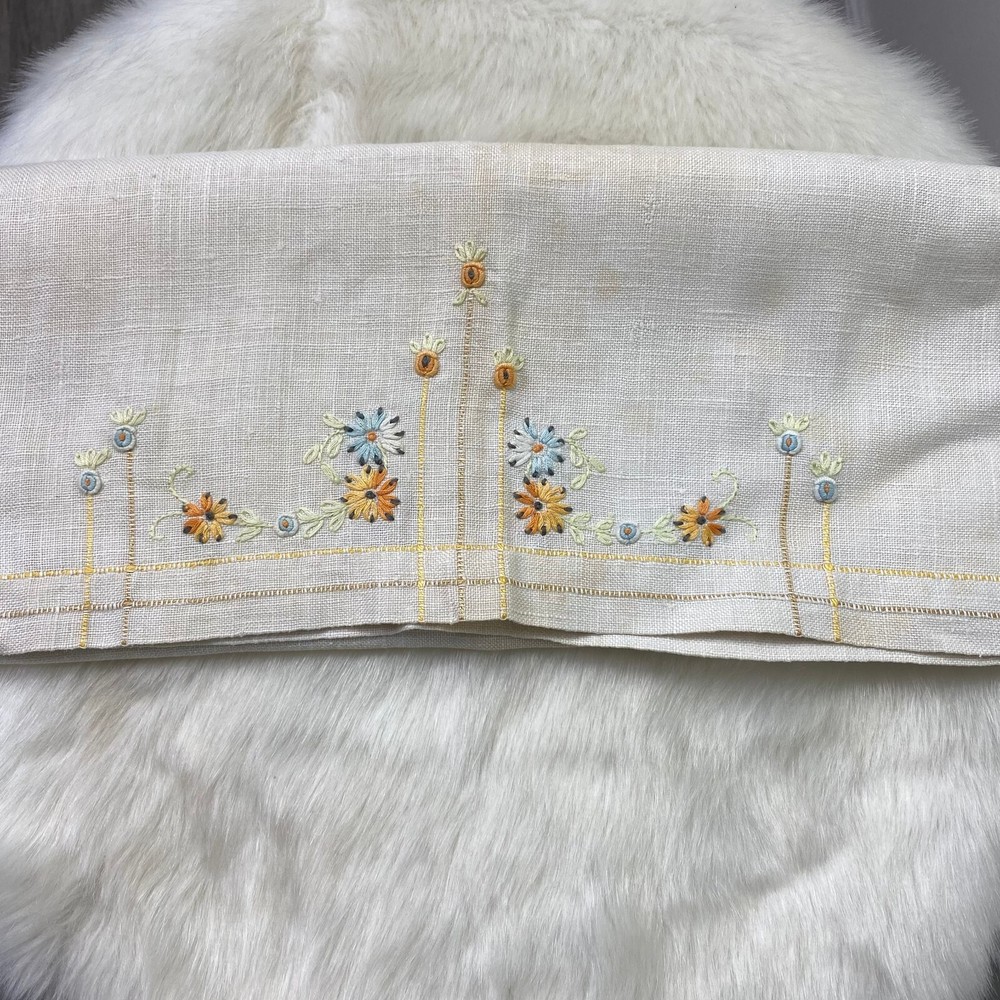 Vintage Linen Textile with Orange & Blue Embroidered Flowers 17.5" X 28.5" Minor wear. HD1-021
