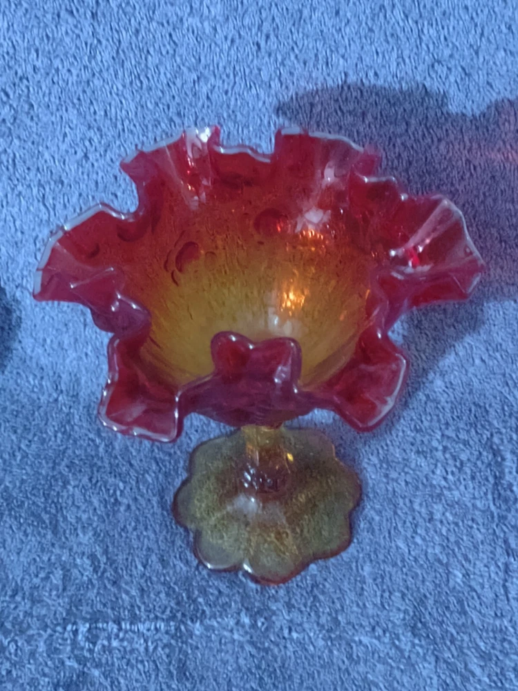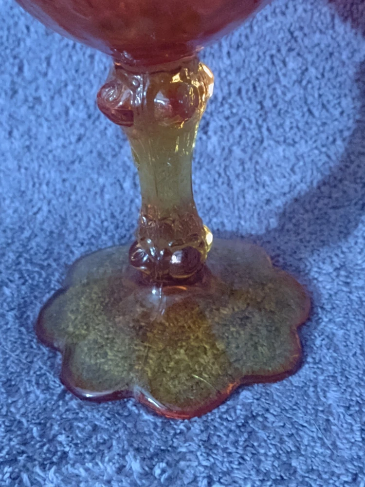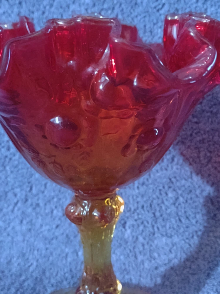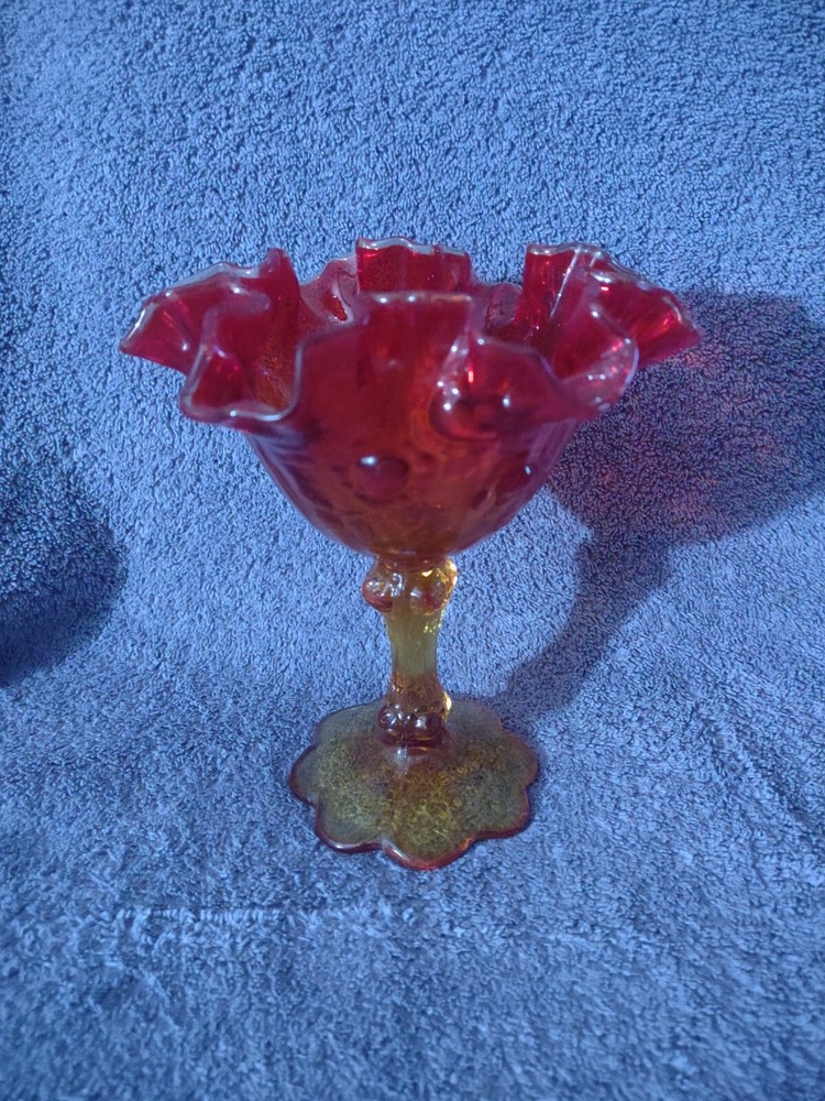 This vintage MCM glass vase is a beautiful addition to any room. Its amberina red orange glass and ruffled top make it a unique and eye-catching piece. The vase is 6 and 1/2" tall and 6" wide across the top, with a glossy finish. Perfect for all occasions, this medium-sized vase is ideal for displaying flowers or as a decorative piece on its own. Its 2-tone color and Mid-Century Modernism style add a touch of art to any space. This original piece is not signed and does not require any additional parts.