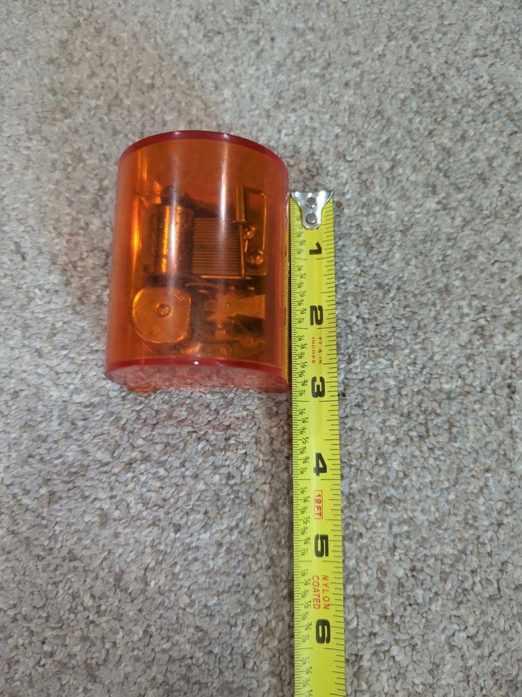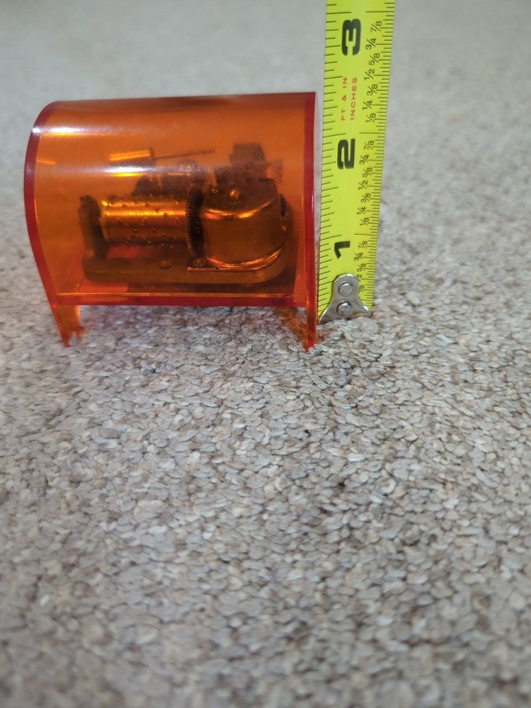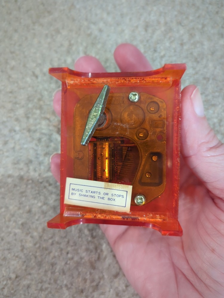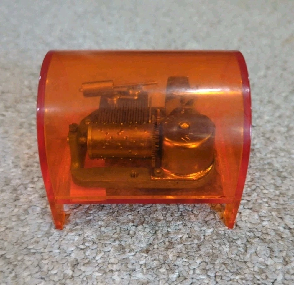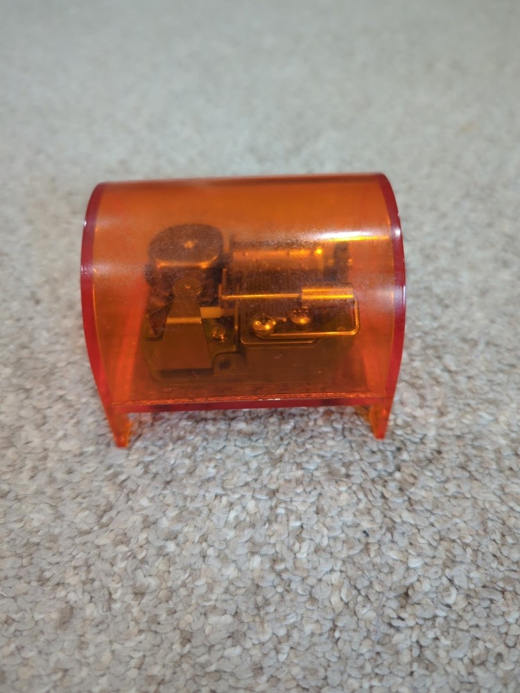 Vintage MCM Mid Century 70s Orange Japan Music Box Player WORKS GREAT Brand: Toyo Toyo is a Taiwanese company, but the music box movements were made in Japan. Mechanism: It features a cylinder with pins that pluck tuned teeth to create music. Casing: The music box is encased in transparent orange plastic. No cracks or chips. This item is in great condition. See pictures for reference.