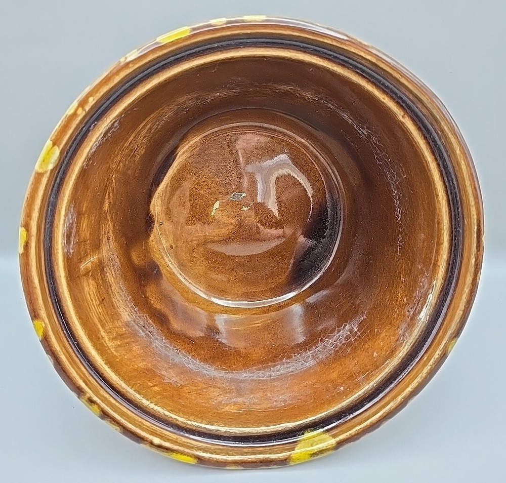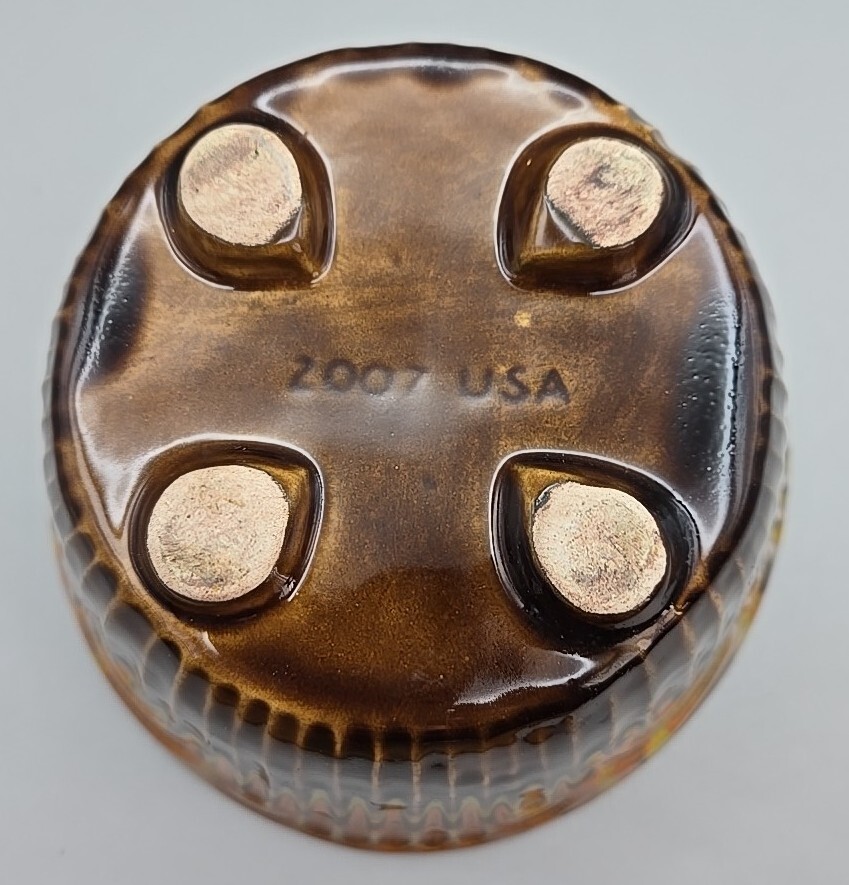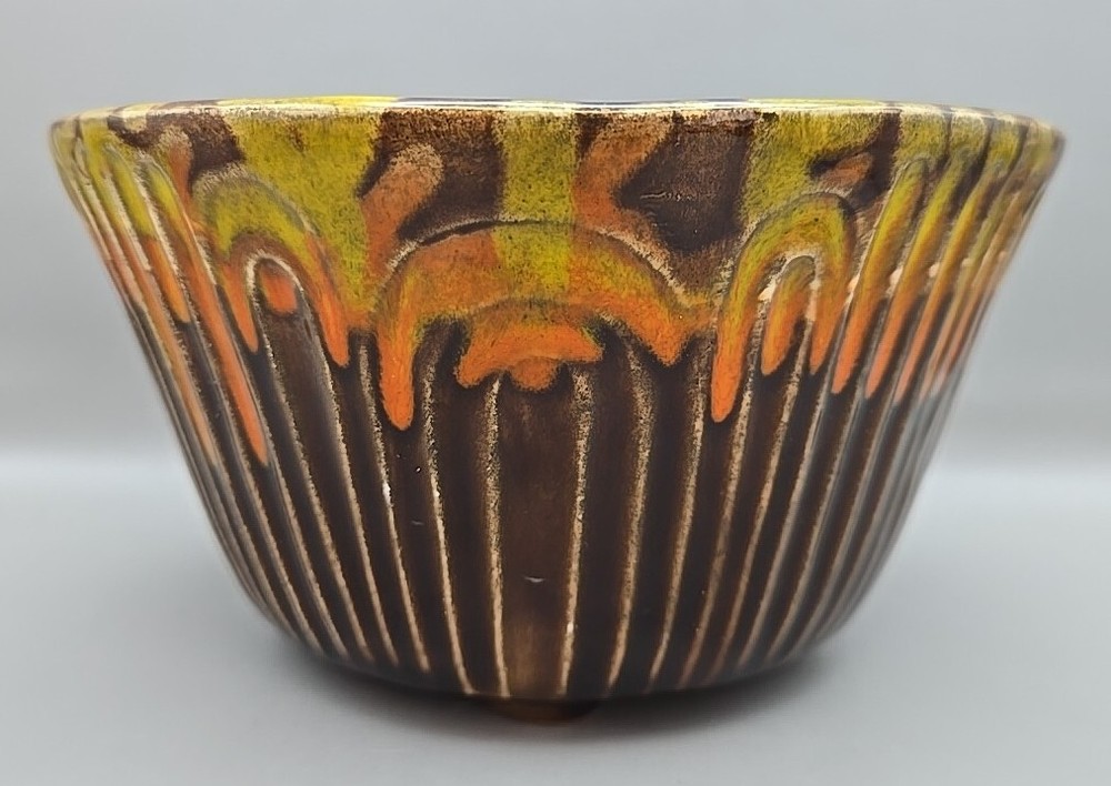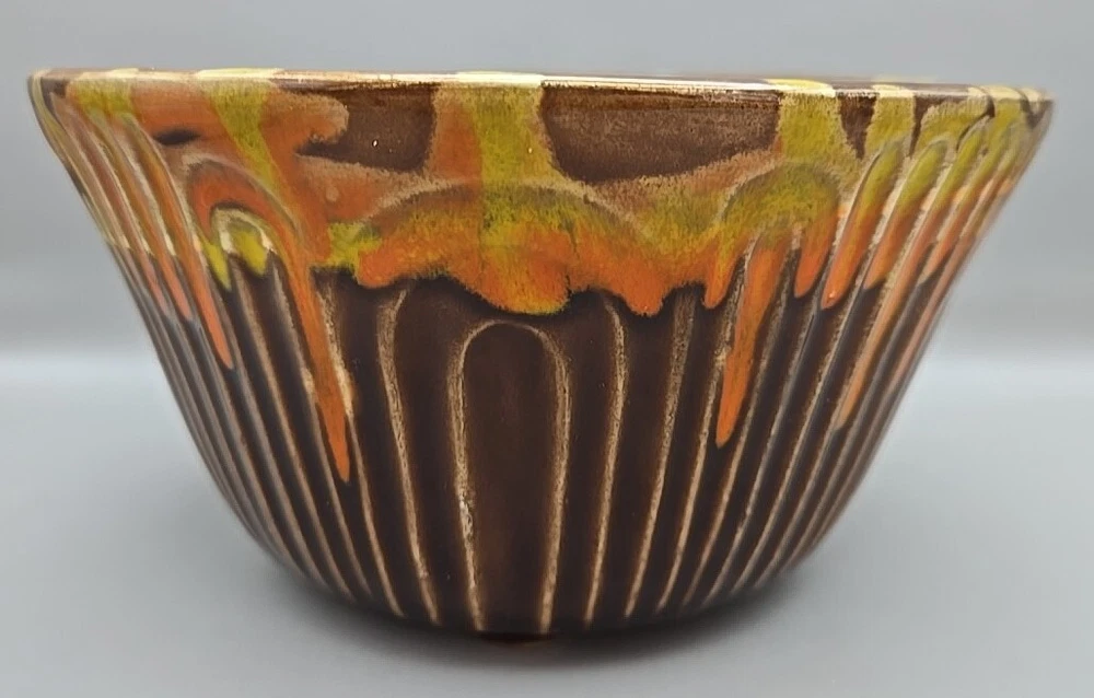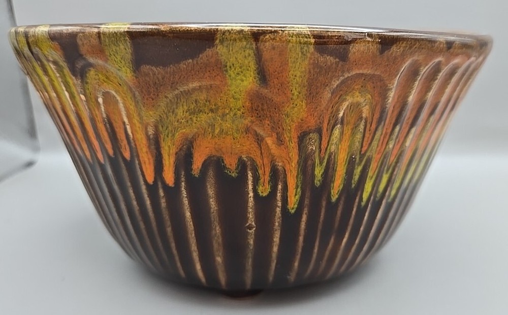 Vintage MCM Mid-Century Modern Brown/ Orange/ Yellow Drip Glaze #2007 Bowl USA, shows some wear from normal use and age (see photos)