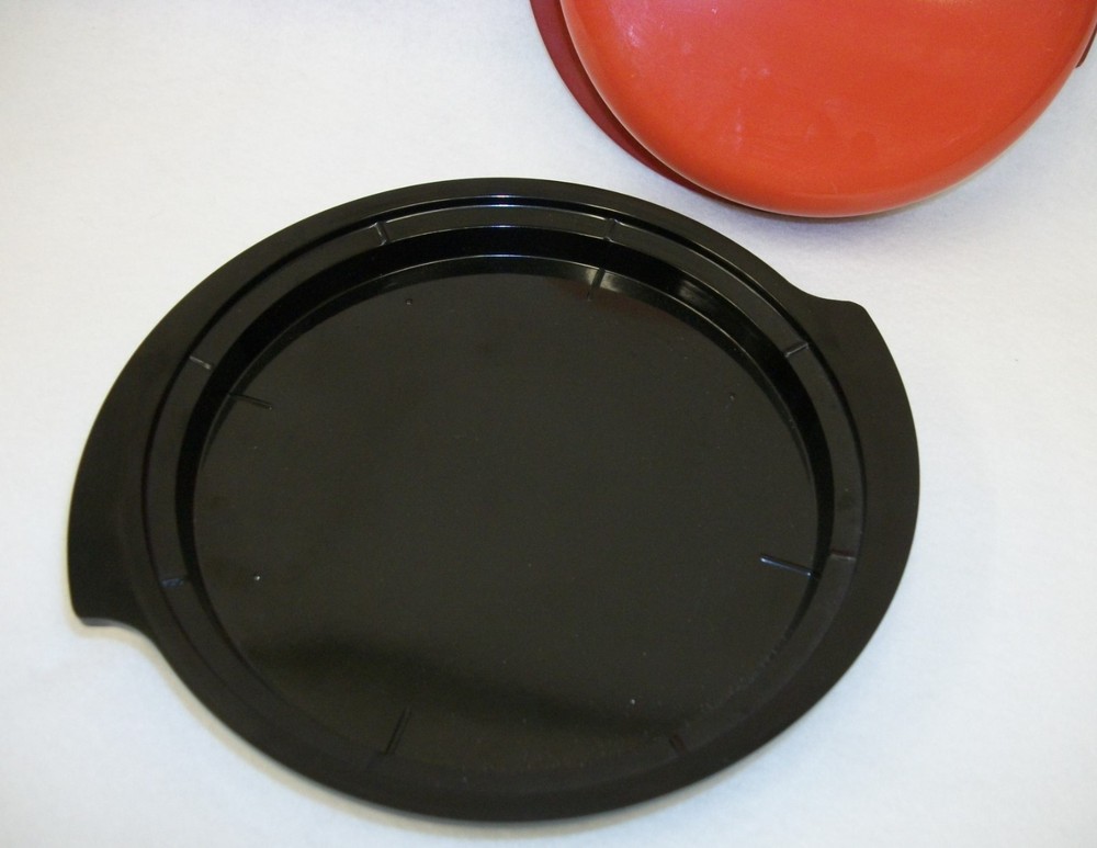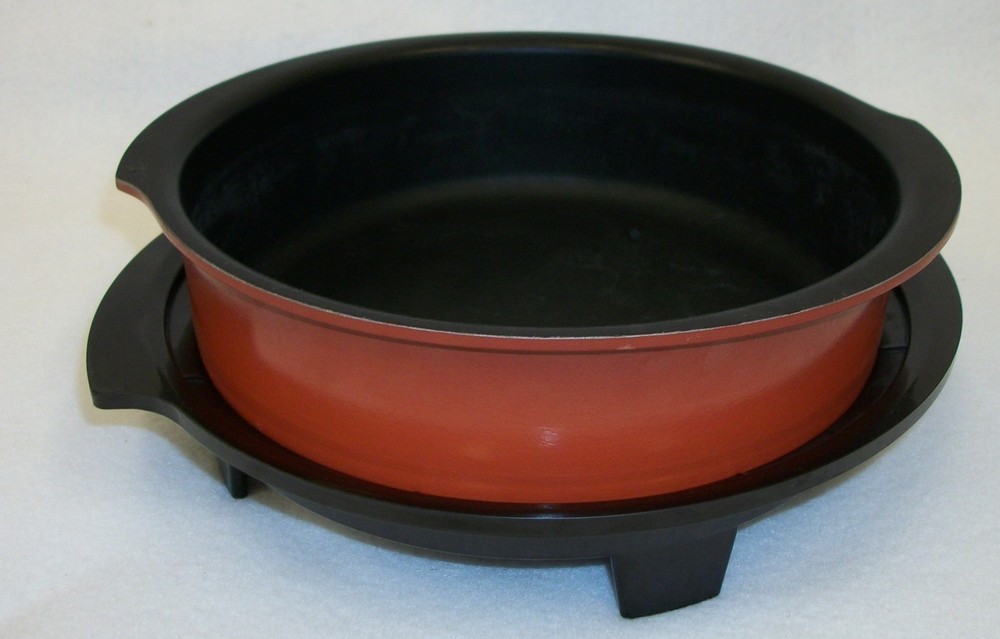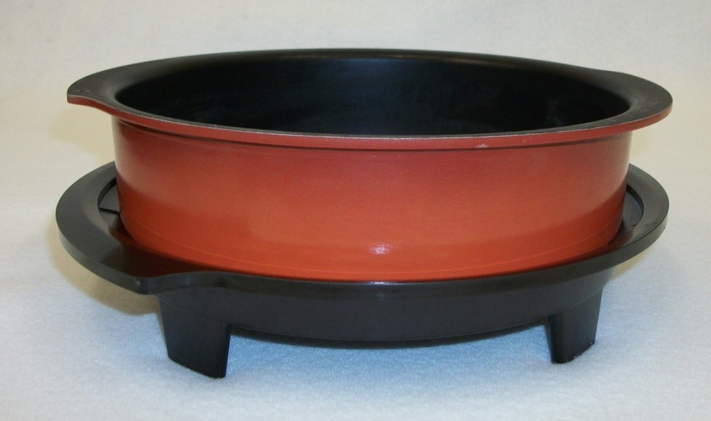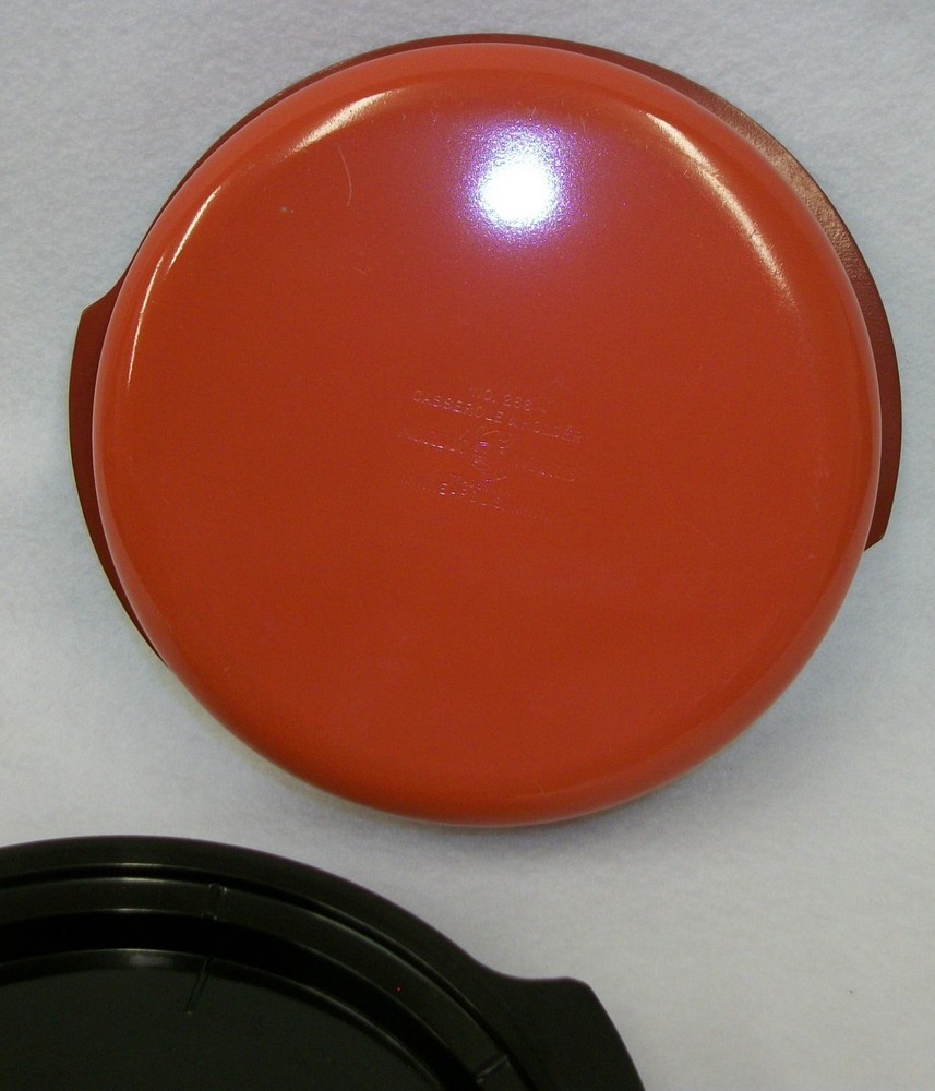 Vintage mid century orange enameled Nordic Ware casserole with holder. No. 266. 9.5" at widest point. Interior has some white residue which we will leave to buyer to clean. Estate purchase. BN24/3...