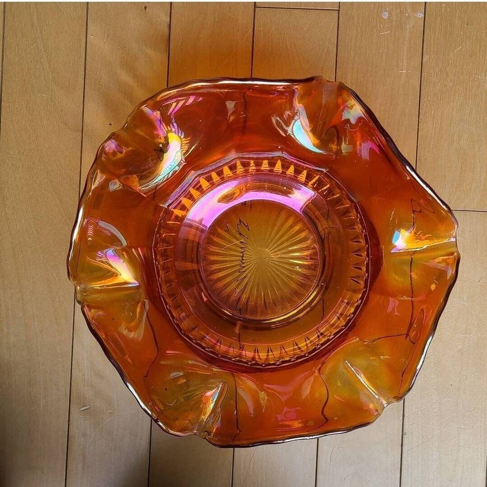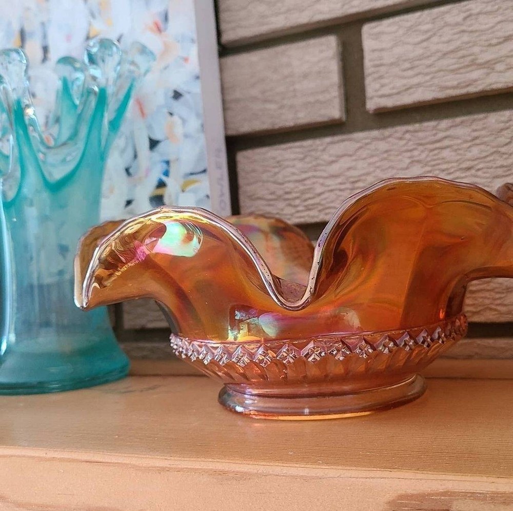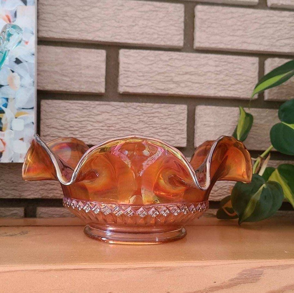 Carnival glass! This style is so decor versatile. It can be classy or fun. Maybe both? In perfect condition. Measures 8" across at the top scalloped, 5" at the base. Powered by ExportYourStore.com