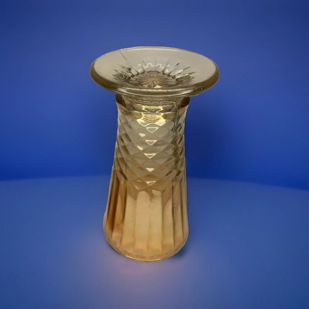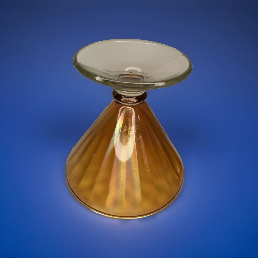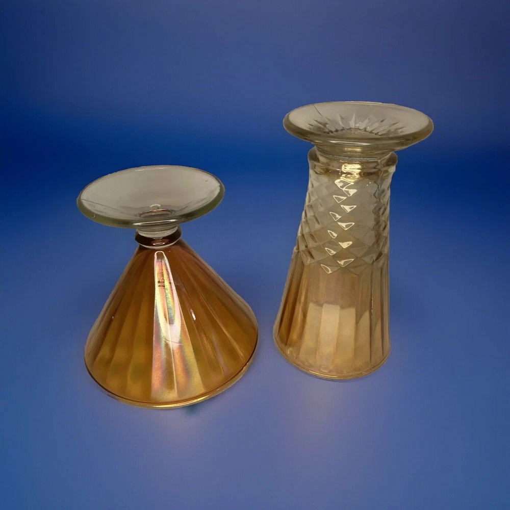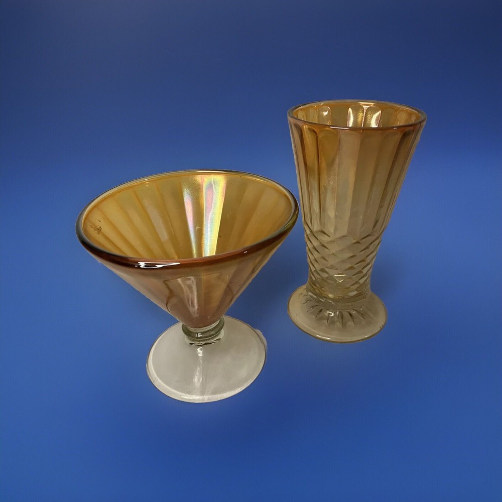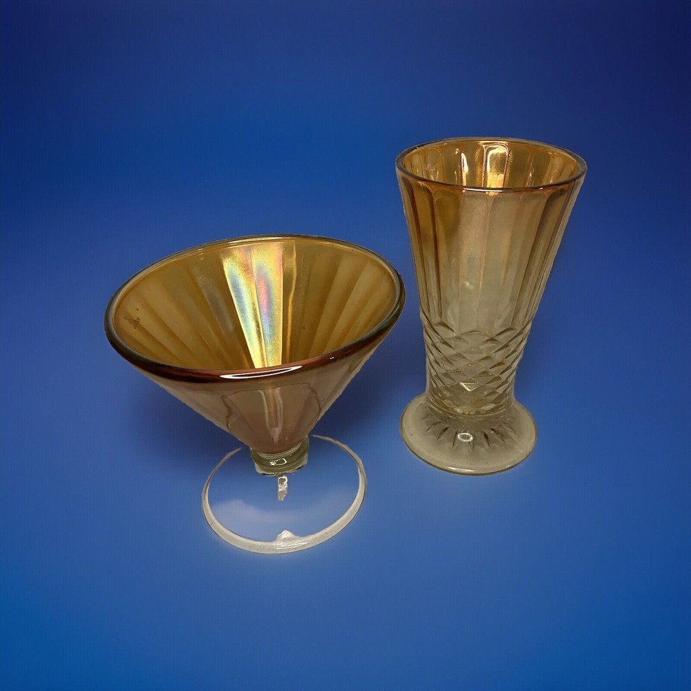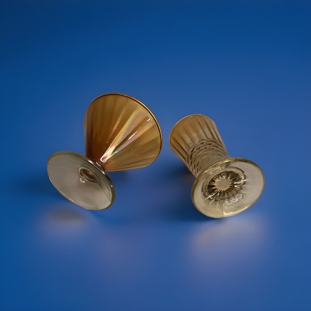 Vintage Marigold Carnival Glass Pieces 2 in Total MCM Mid Century Modern Classy! Add these two beautiful pieces to your Carnival Glass Collection! These 2 pieces come together. The shorter piece is: 5” in Diameter/ 5” Tall The taller piece is: 3.5” in Diameter/ 6.5” Tall No chips, cracks or repairs. Thank you for looking. Please email with any questions. If you are are happy with your purchase please don’t forget to leave positive feedback! Happy Bidding!